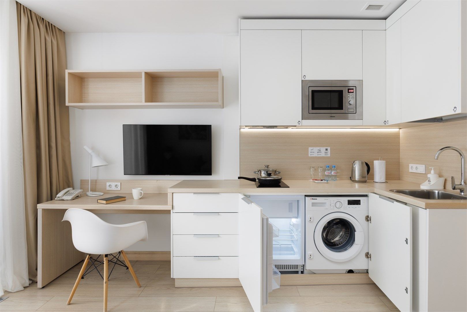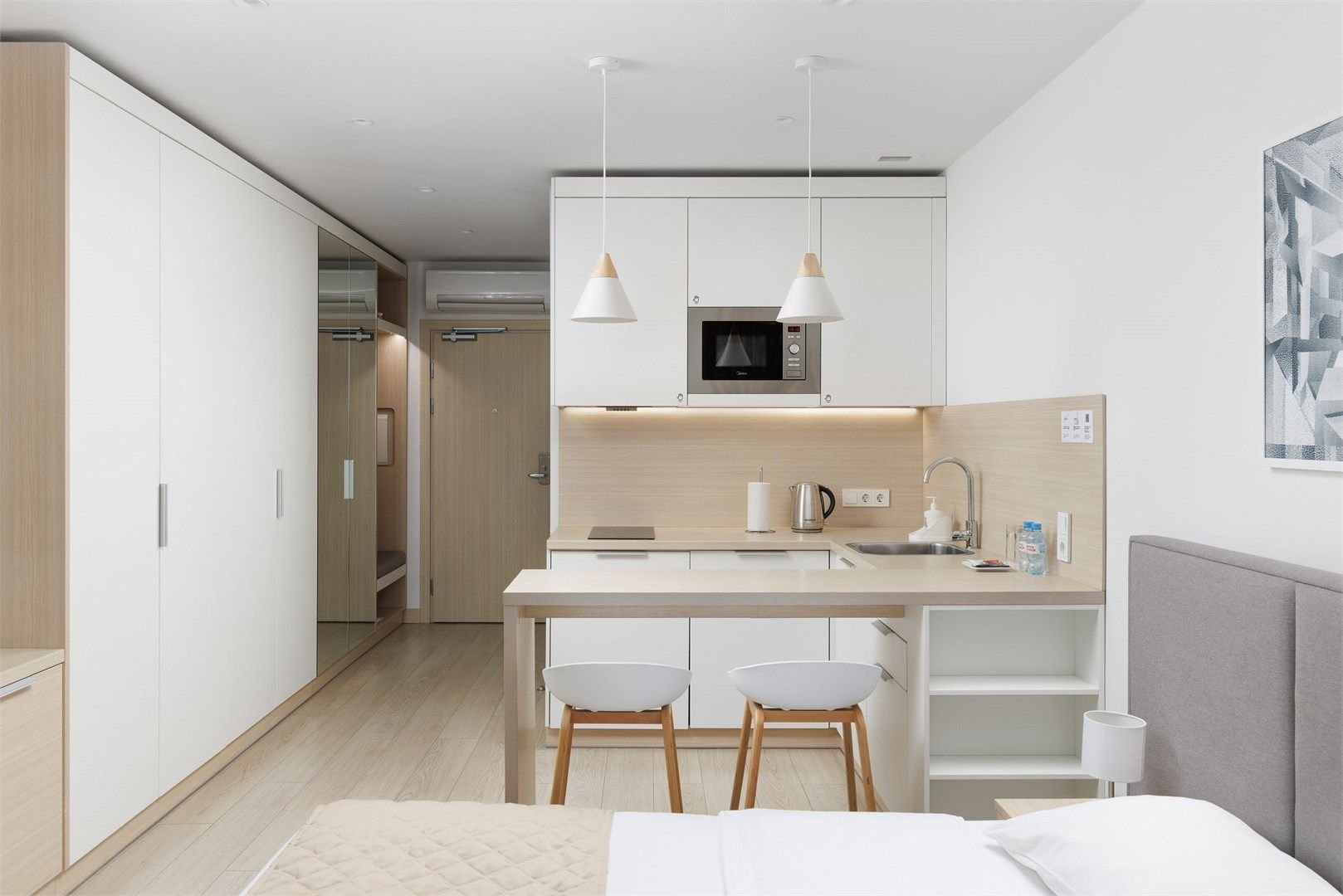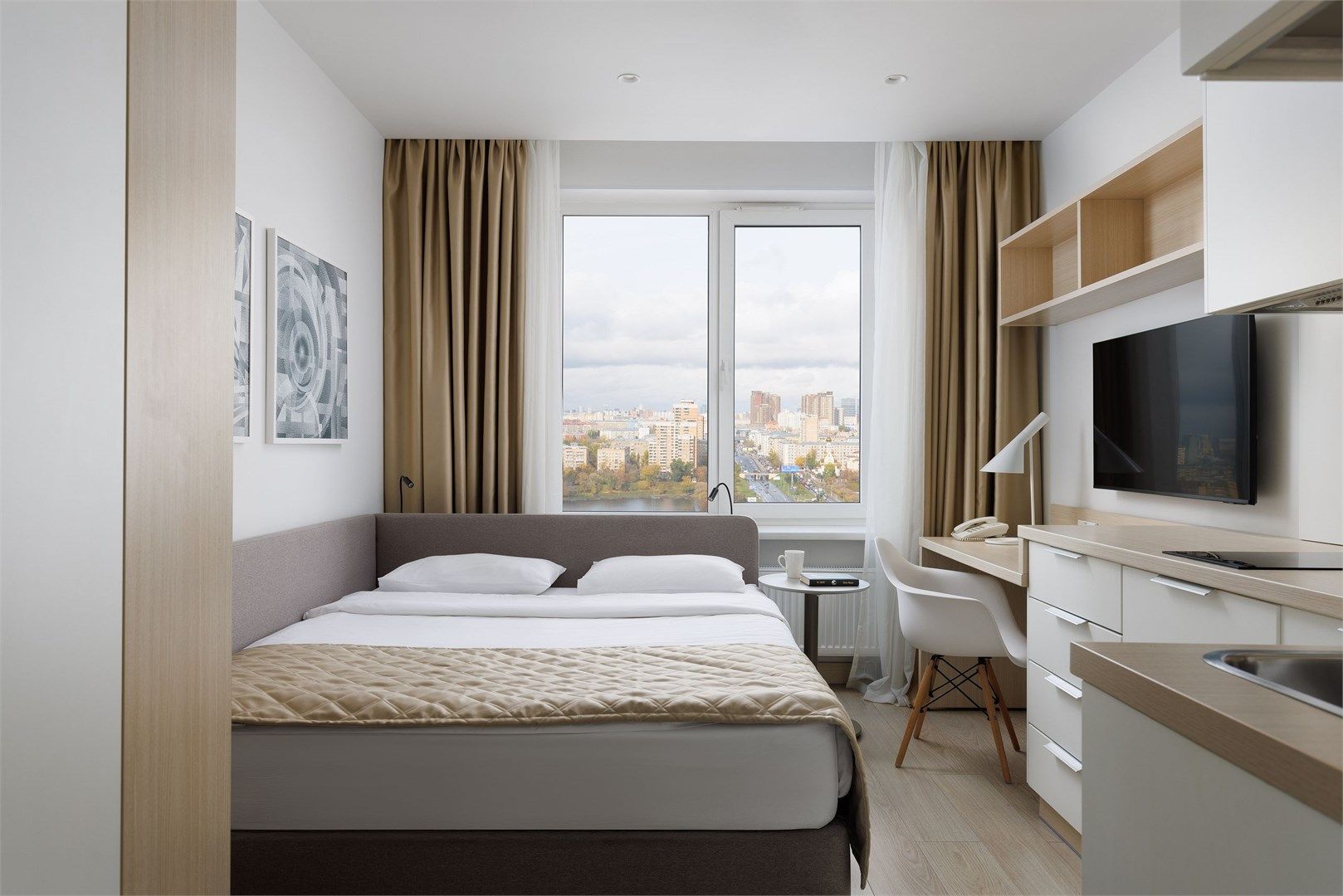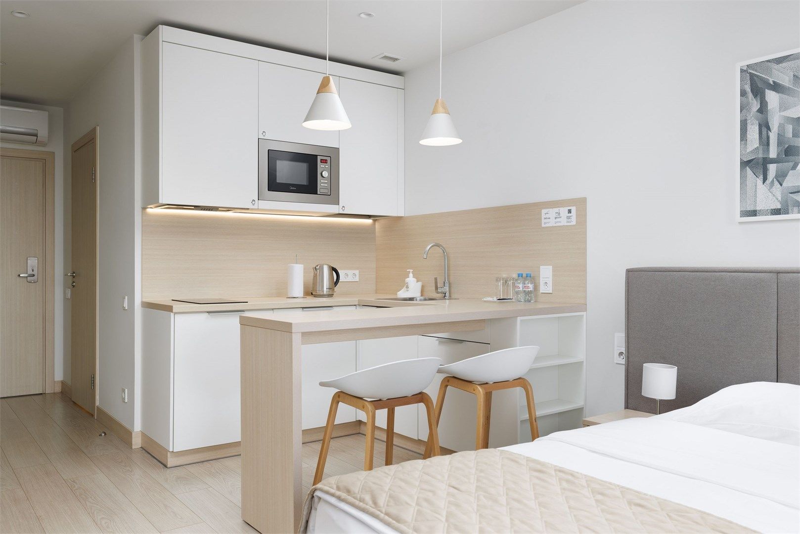 Апартаменты категории "Стандарт" располагают всем необходимым для комфортного проживания от 1 до 2 человек. Апартаменты представляют собой номер-студию с ванной комнатой (с душевой кабиной), рабочей и кухонной зонами. Кухонная зона оснащена варочной панелью, вытяжкой, холодильником, микроволновой печью, чайником, стиральной машиной. Есть возможность забронировать апартаменты с двуспальной кроватью...
