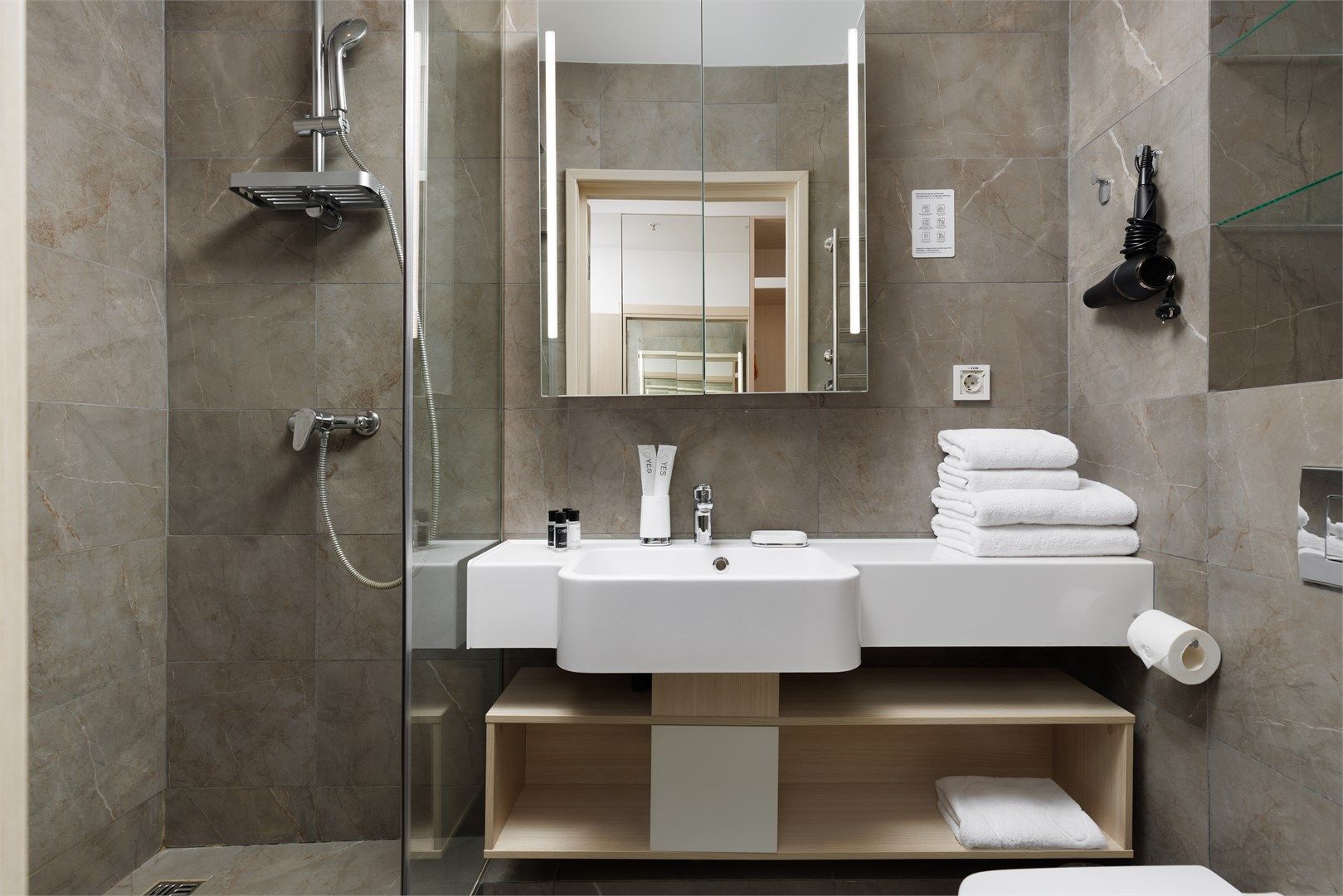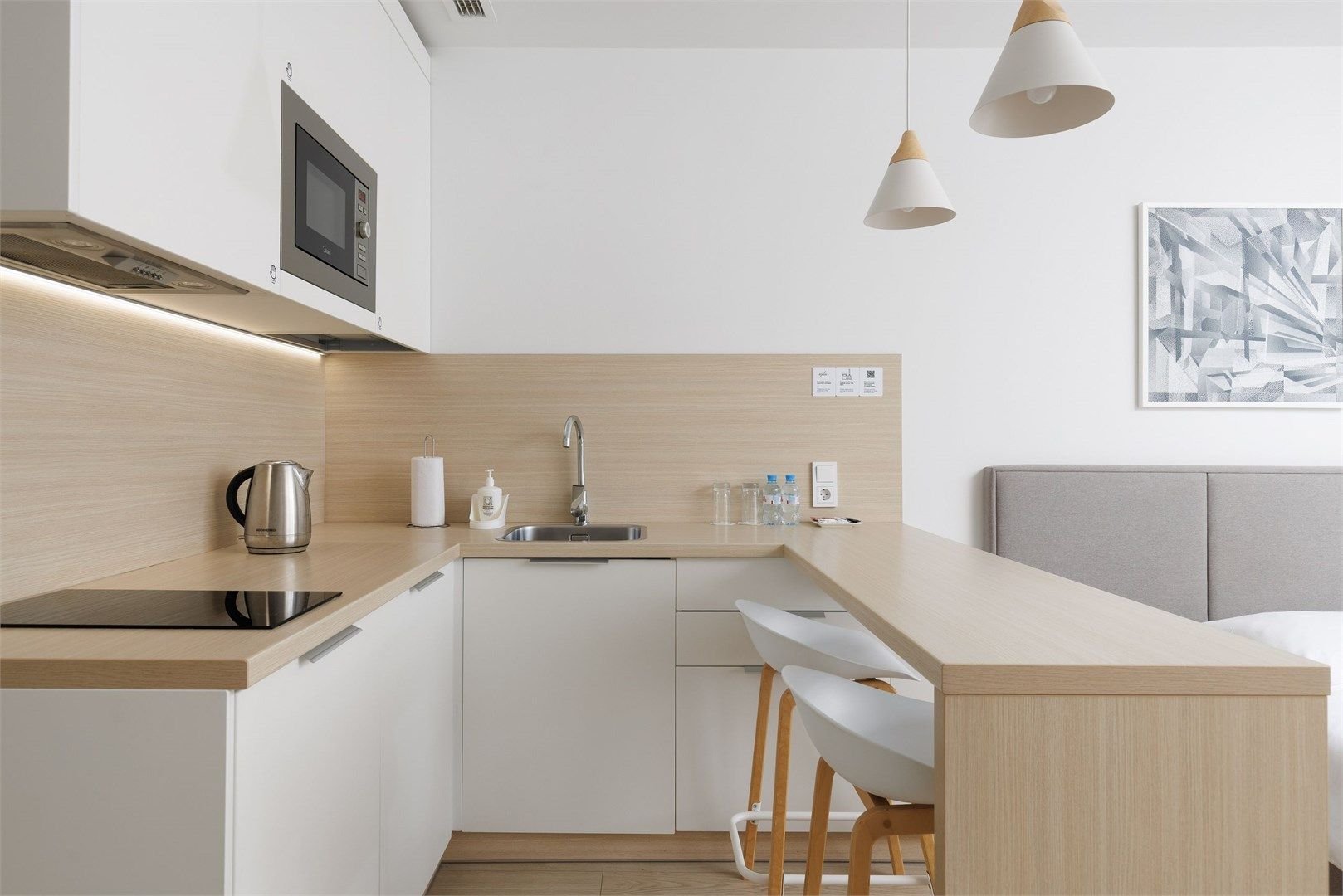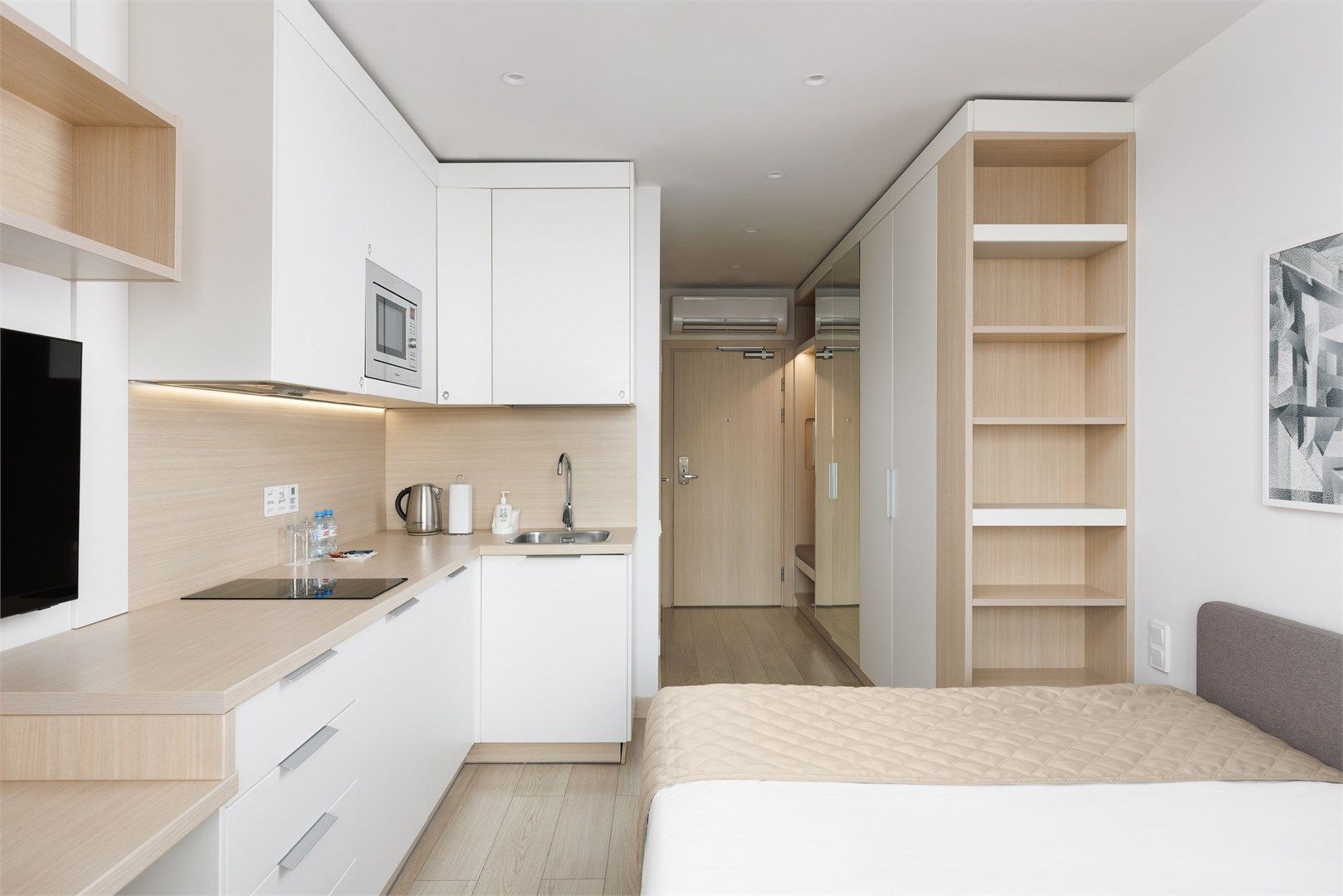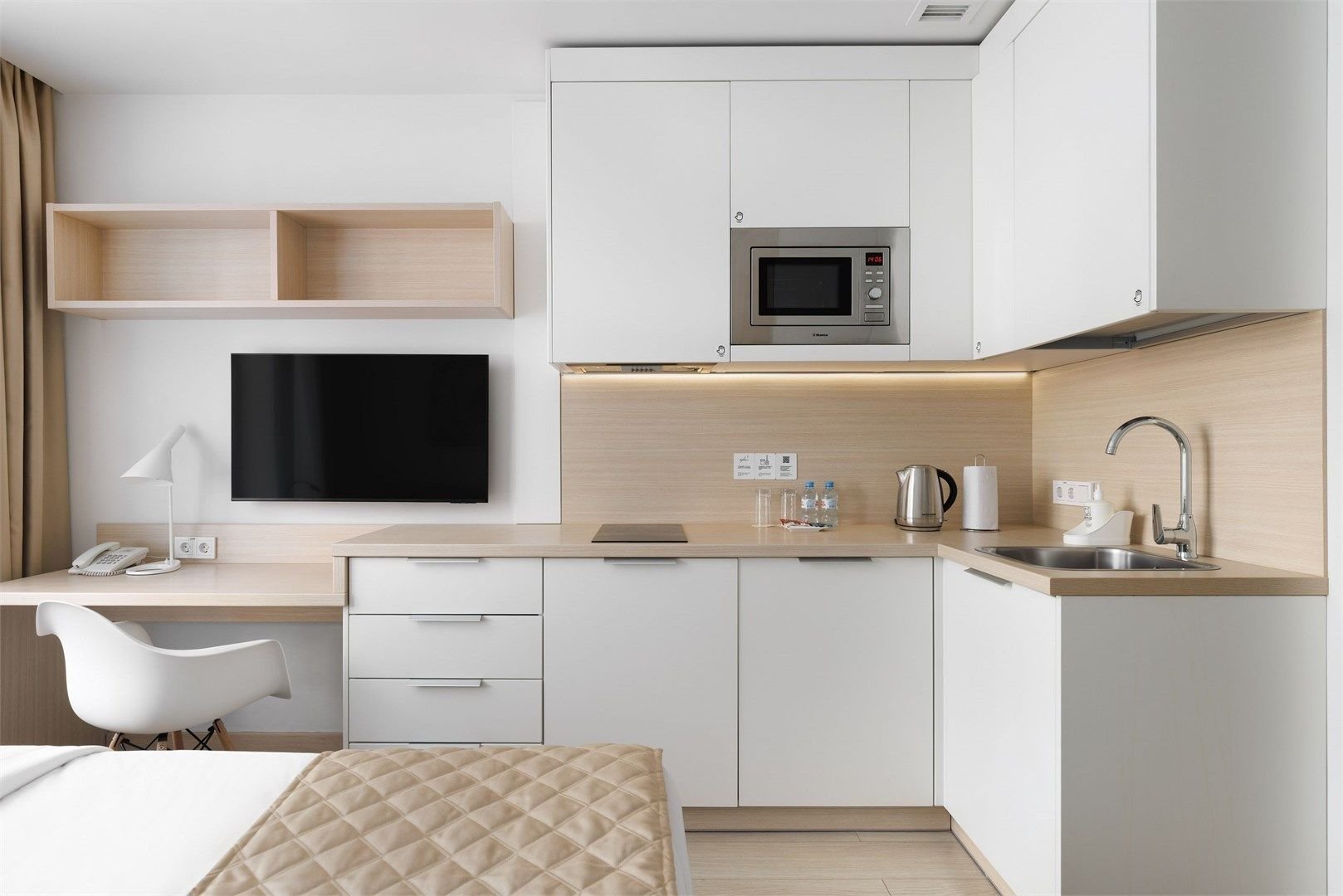 Апартаменты категории "Стандарт" располагают всем необходимым для комфортного проживания от 1 до 2 человек. Апартаменты представляют собой номер-студию с ванной комнатой (с душевой кабиной), рабочей и кухонной зонами. Кухонная зона оснащена варочной панелью, вытяжкой, холодильником, микроволновой печью, чайником, стиральной машиной. Есть возможность забронировать апартаменты с двуспальной кроватью...