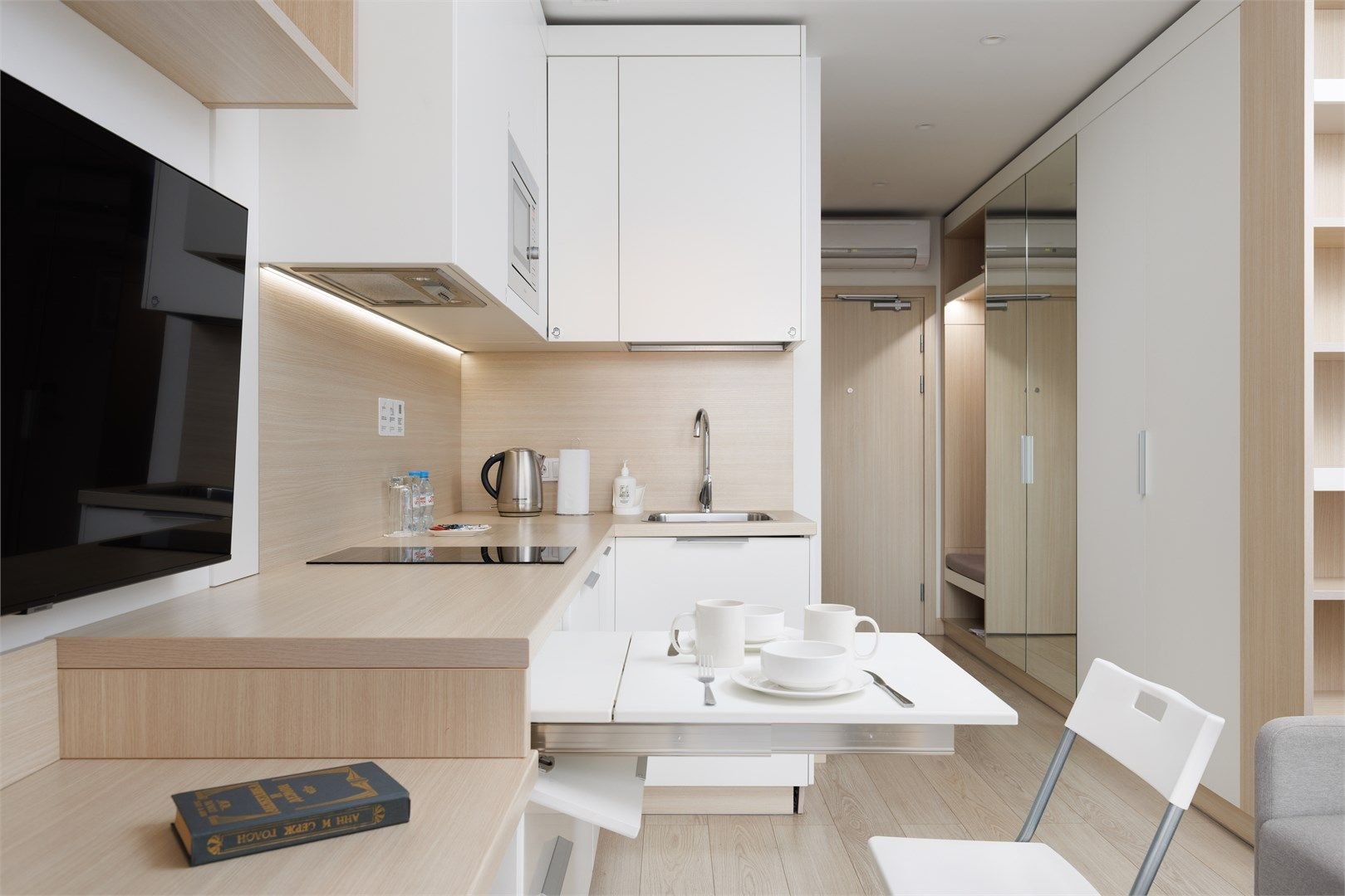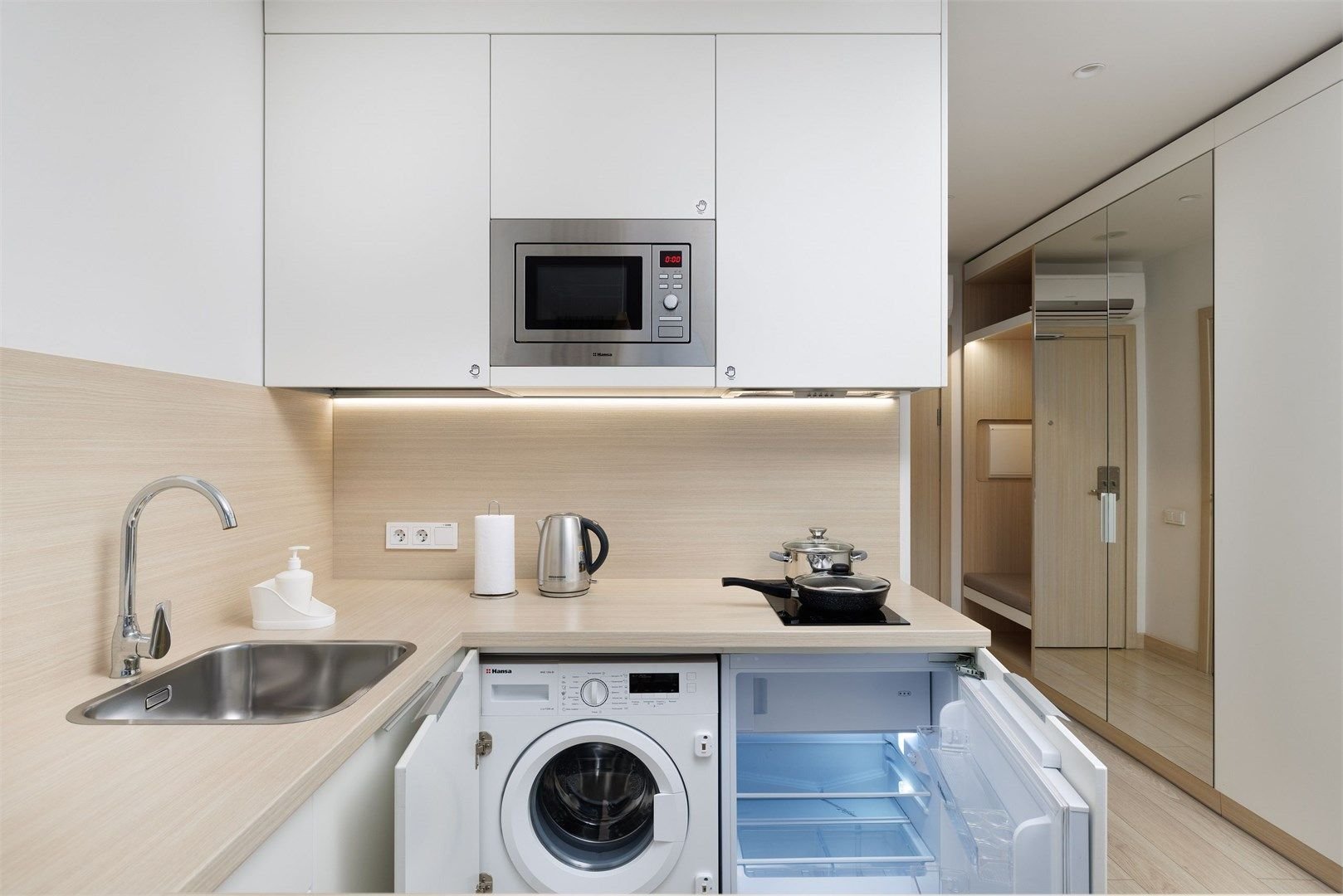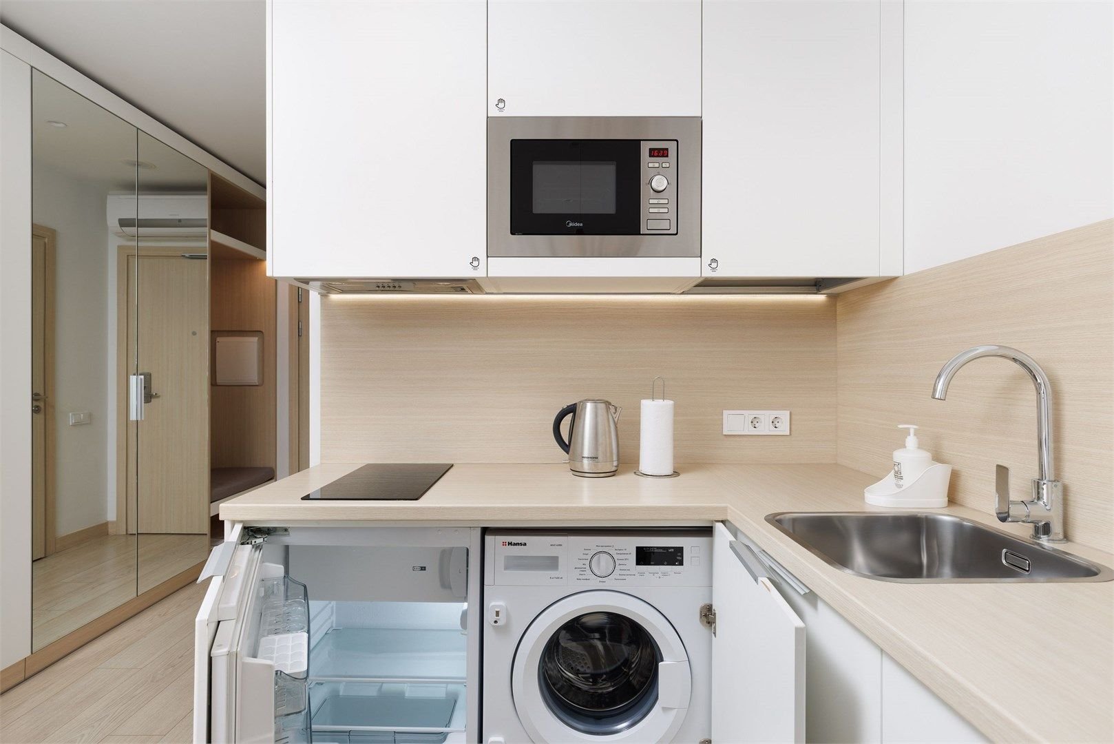 Апартаменты категории "Супериор" располагают всем необходимым для комфортного проживания от 1 до 2 человек. Апартаменты представляют собой номер-студию с ванной комнатой, рабочей и кухонной зонами. Кухонная зона оснащена варочной панелью, вытяжкой, холодильником, микроволновой печью, чайником. Ванная комната с душевой кабиной оснащена стиральной машиной. Есть возможность забронировать апартаменты ...