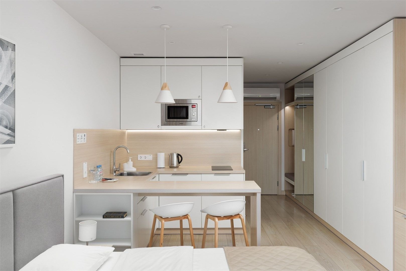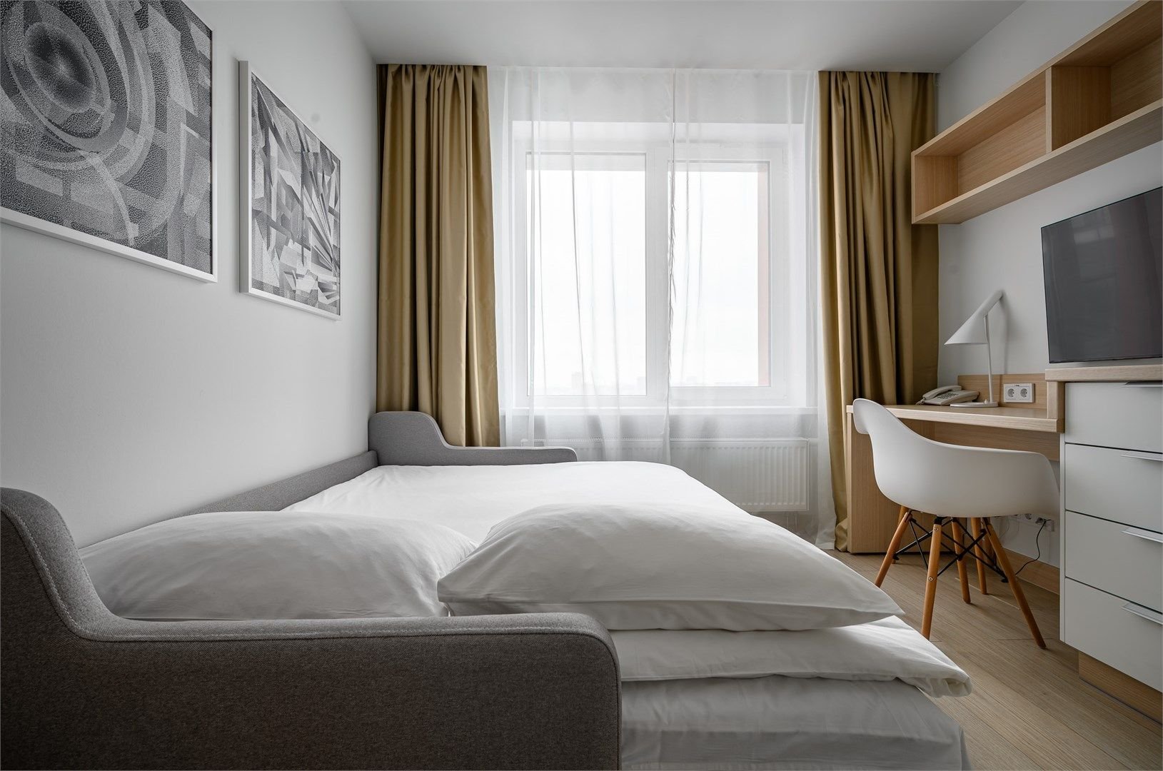 Апартаменты категории "Студия" идеально подойдут для проживания 1 человека. Интерьеры выполнены в спокойных тонах. Номер оснащен всем необходимым для проживания: раскладывающийся диван, рабочая зона с письменным столом, полностью оборудованная необходимой техникой и посудой кухня. Обращаем Ваше внимание, что халаты предоставляются бесплатно по запросу....