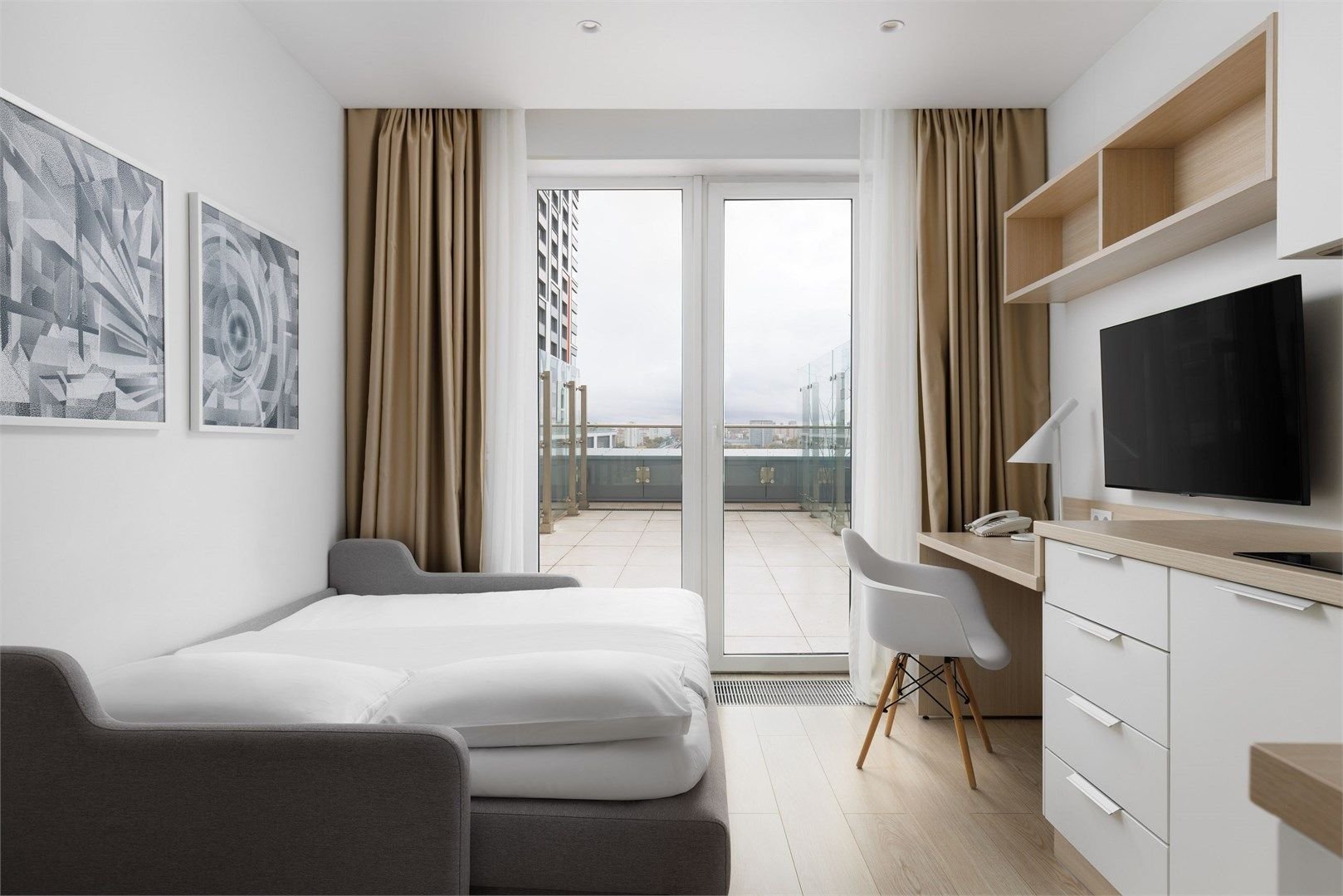 Апартаменты категории "Студия с террасой" идеально подойдут для проживания 1-2 человек. Главной особенностью данного номера является наличие террасы с видом на город. Интерьеры выполнены в спокойных тонах. Номер оснащен всем необходимым для проживания: раскладывающийся диван, рабочая зона с письменным столом, полностью оборудованная необходимой техникой и посудой кухня. Просим обратить внимание,...