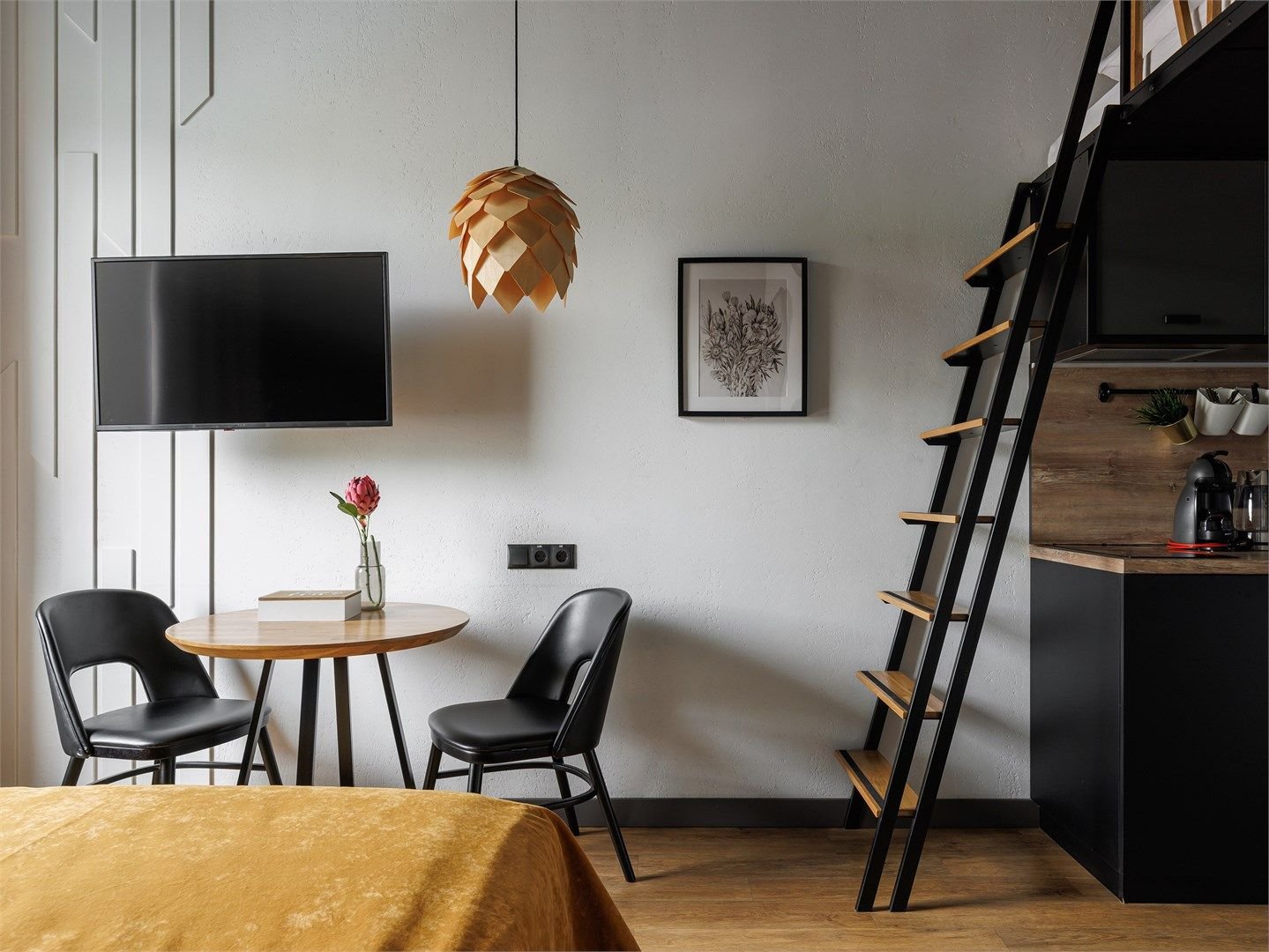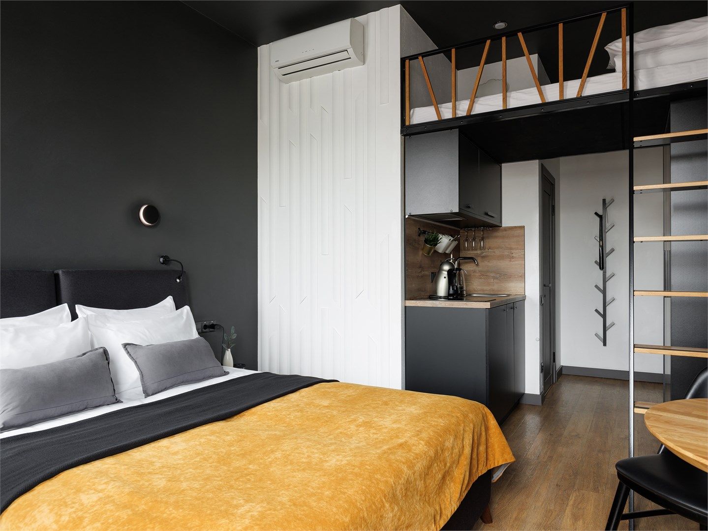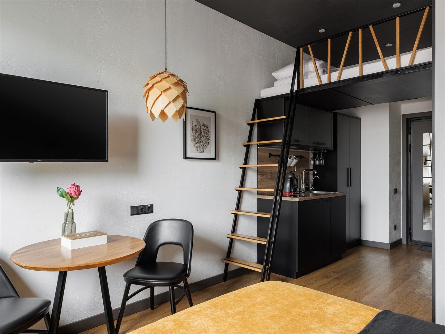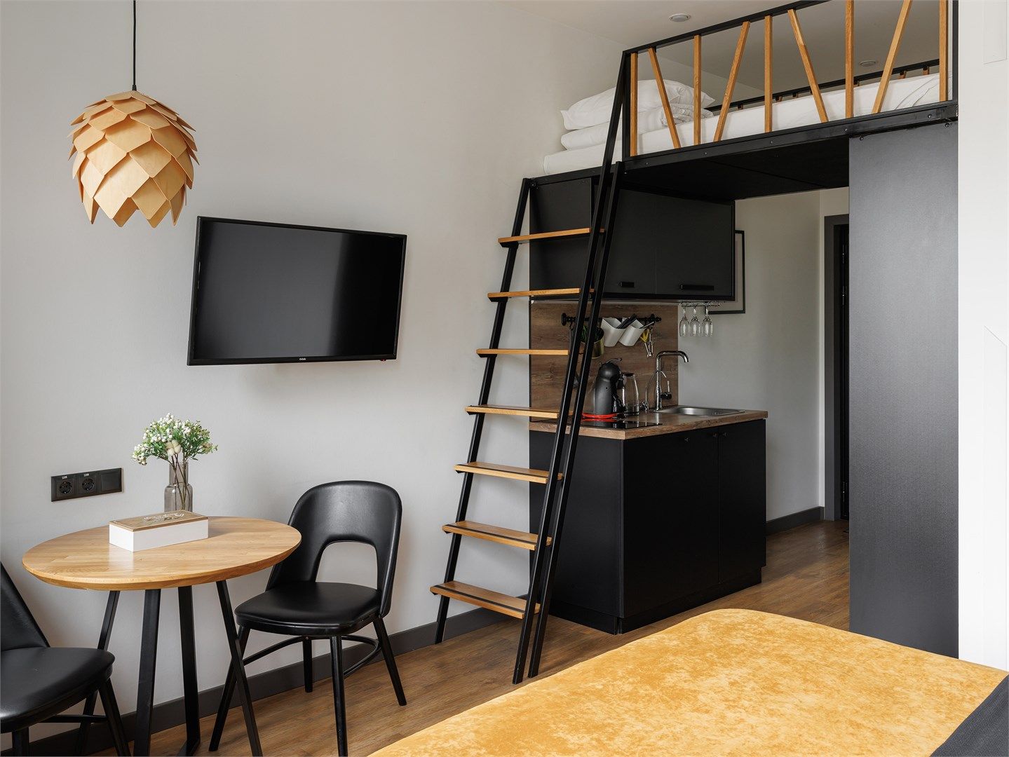 Семейный отдых с комфортом и стилем. Забудьте о тесных гостиничных номерах! В наших апартаментах "Делюкс" площадью от 21 до 25 квадратных метров найдется место для всей семьи. Продуманное пространство, удобная мебель и стильный интерьер создают атмосферу уюта и комфорта. Просторная двуспальная кровать и уютная односпальная кровать на втором уровне – это не просто спальные места, это личное простр...