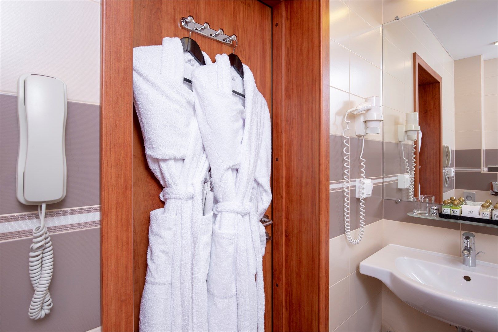 Все номера оборудованы кондиционером, сейфом, спутниковым телевидением, телефоном, Wi-Fi доступом в интернет, столом и креслами. В ванных комнатах - ванна, телефон и фен.
