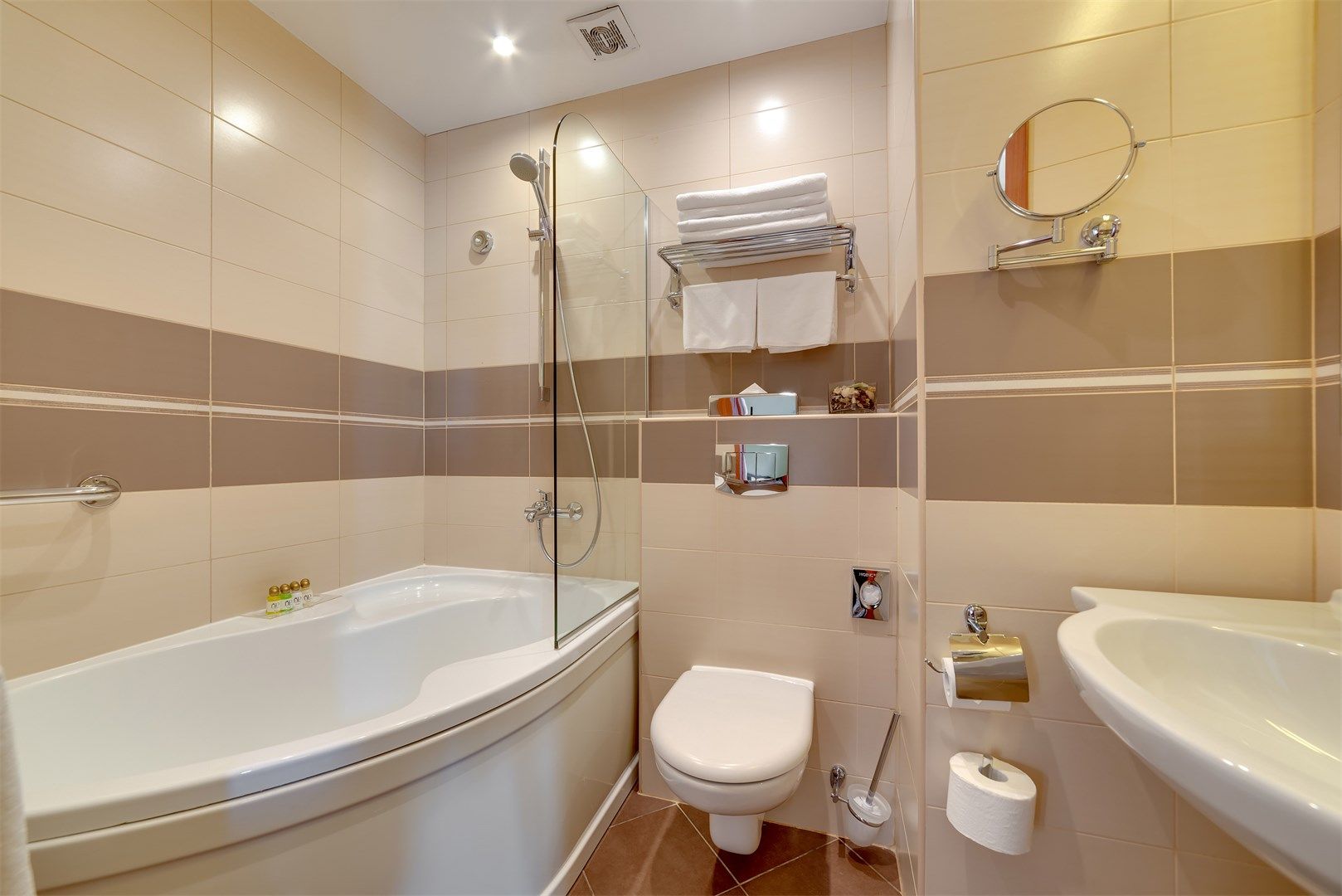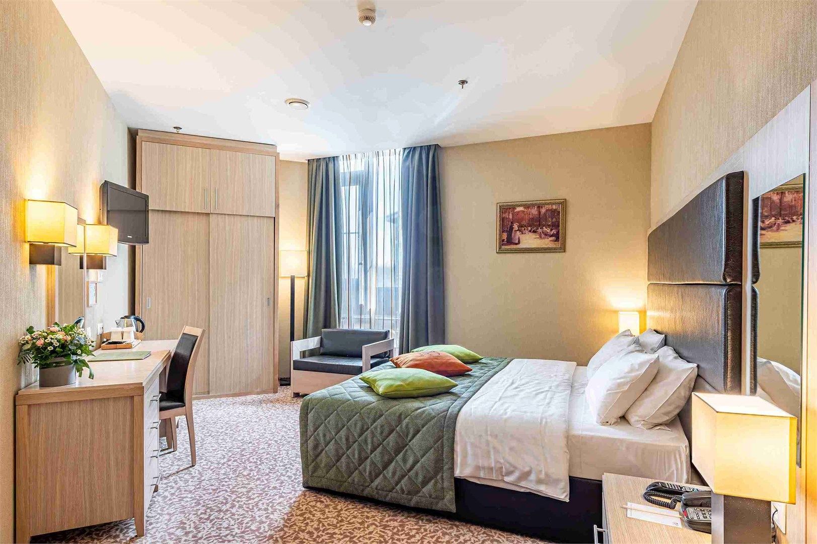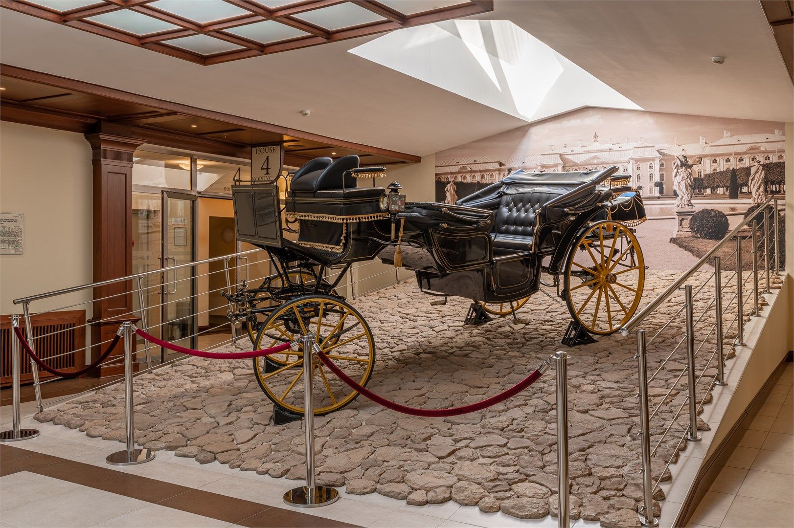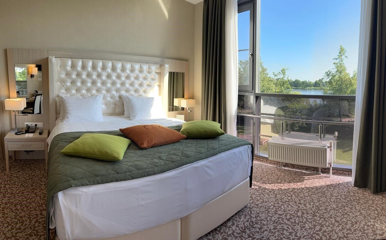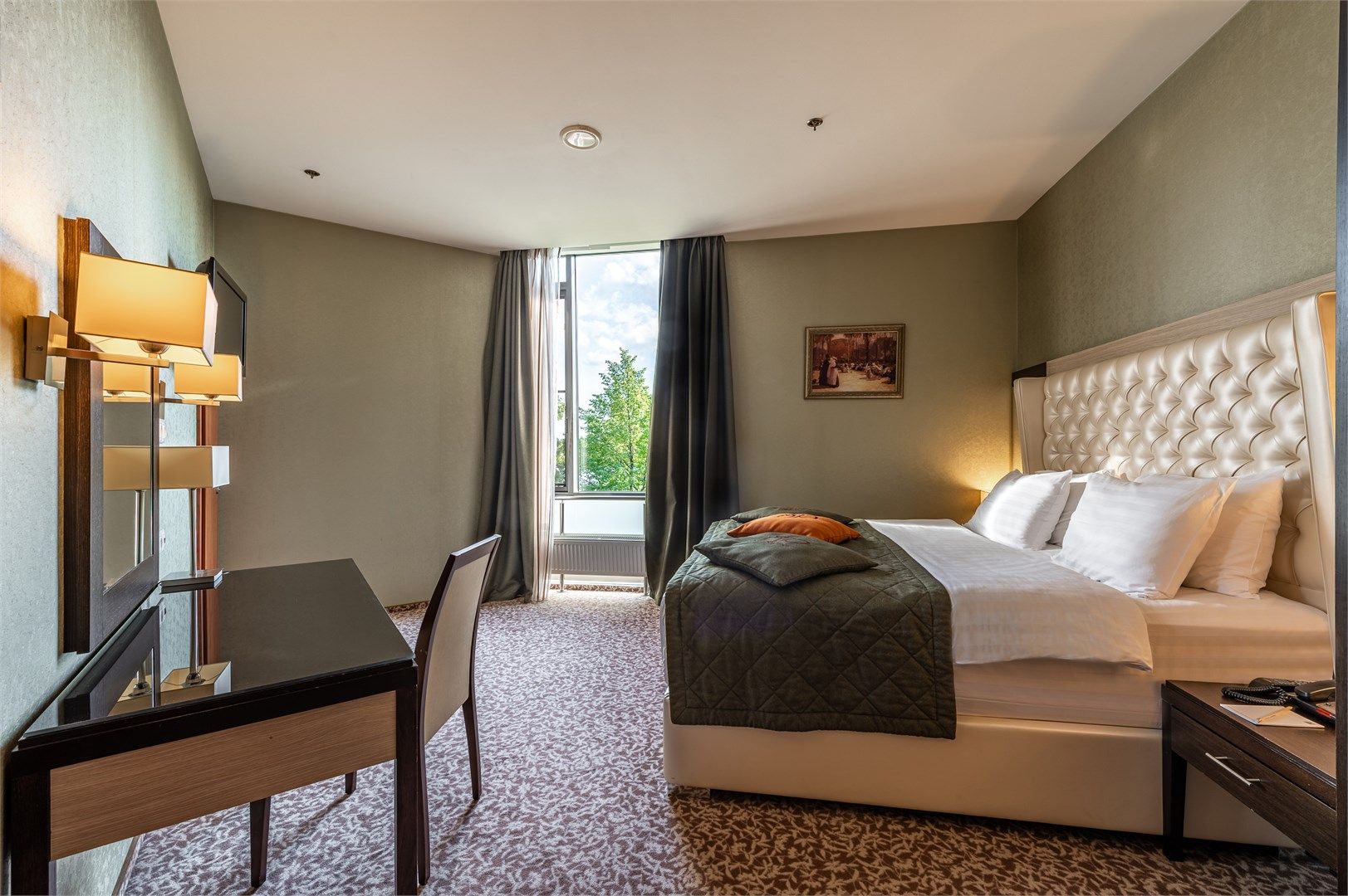 150 просторных и комфортабельных номеров отеля с изумительным видом на Верхний парк главного Петергофского Дворца, Собор Святых Апостолов Петра и Павла и живописный Ольгин пруд.