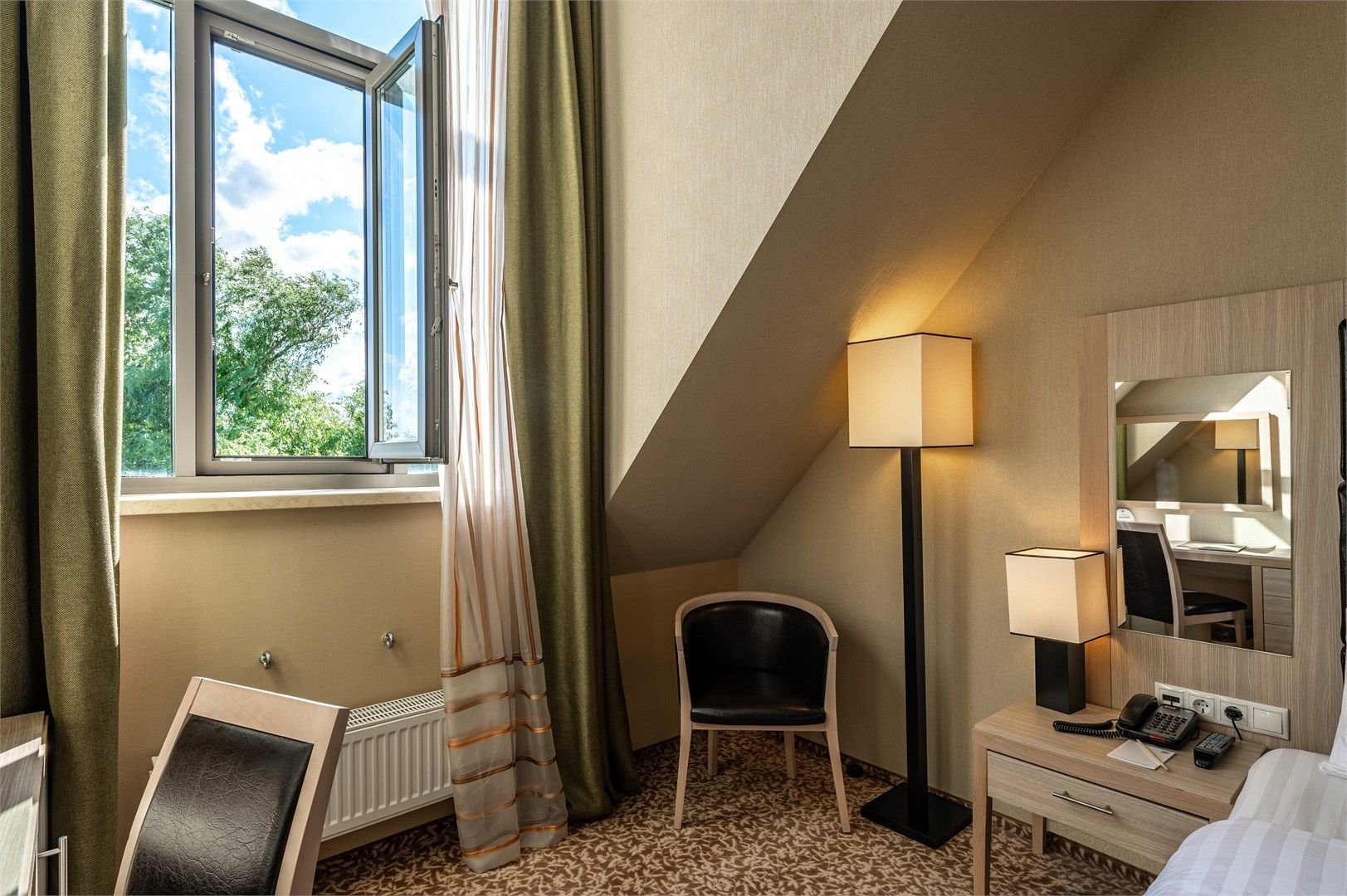 Номер с двумя раздельными кроватями (90x200) расположен на мансардном этаже. Вид на Ольгин пруд и открывающееся окно добавляют уюта этому комфортному номеру.