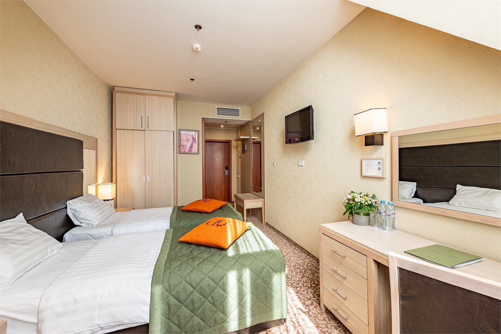 Номер с двумя раздельными кроватями (90x200) и дополнительным спальным местом расположен на 2 этаже и имеет вид на внутреннюю территорию отеля. Номер подходит для размещения трех гостей.