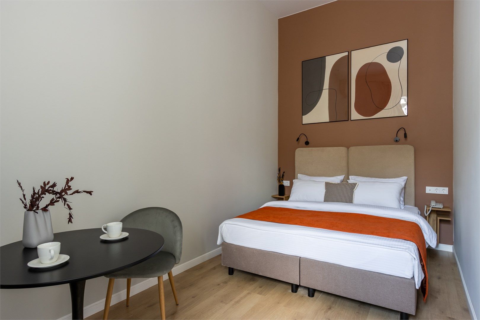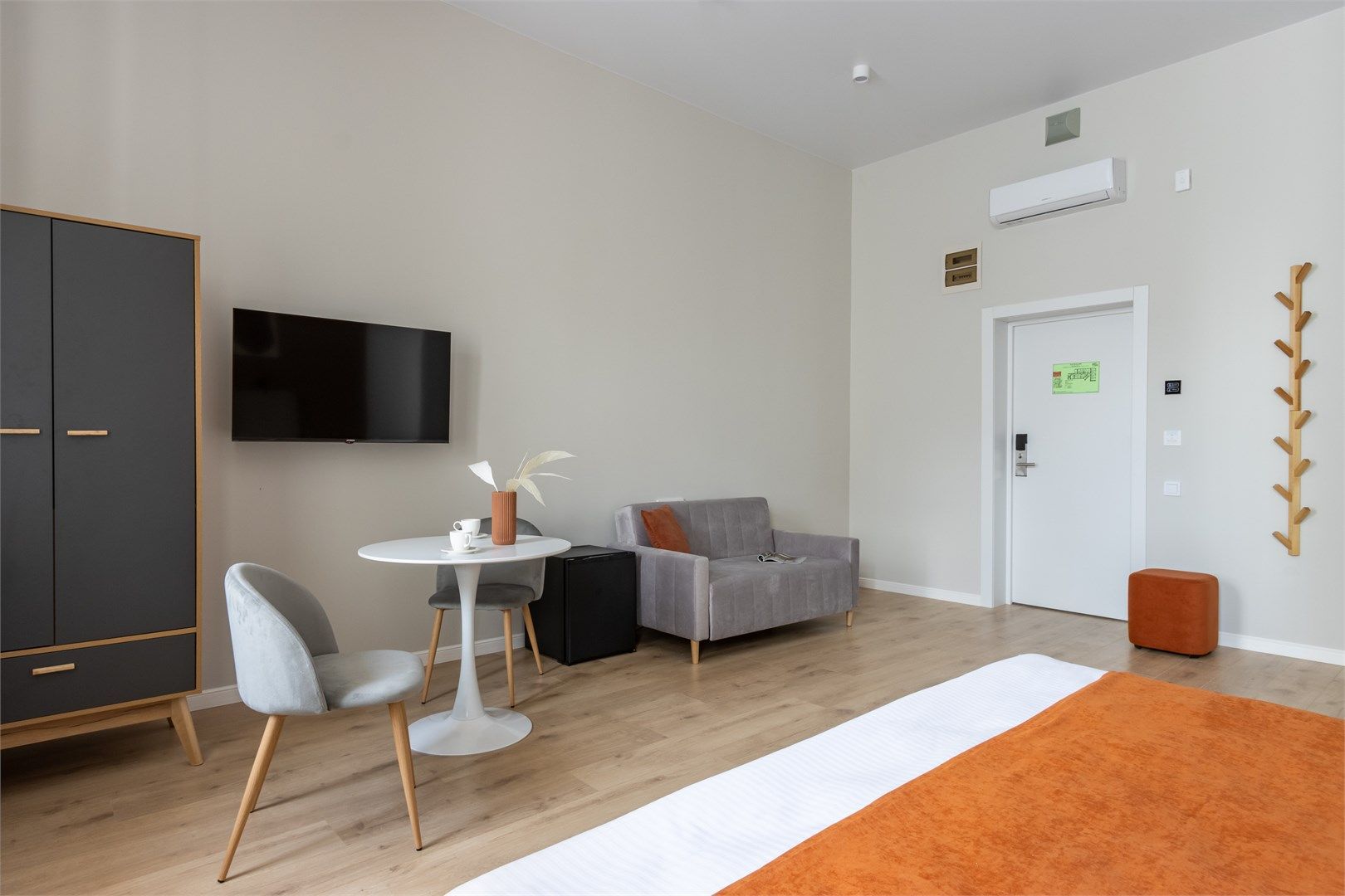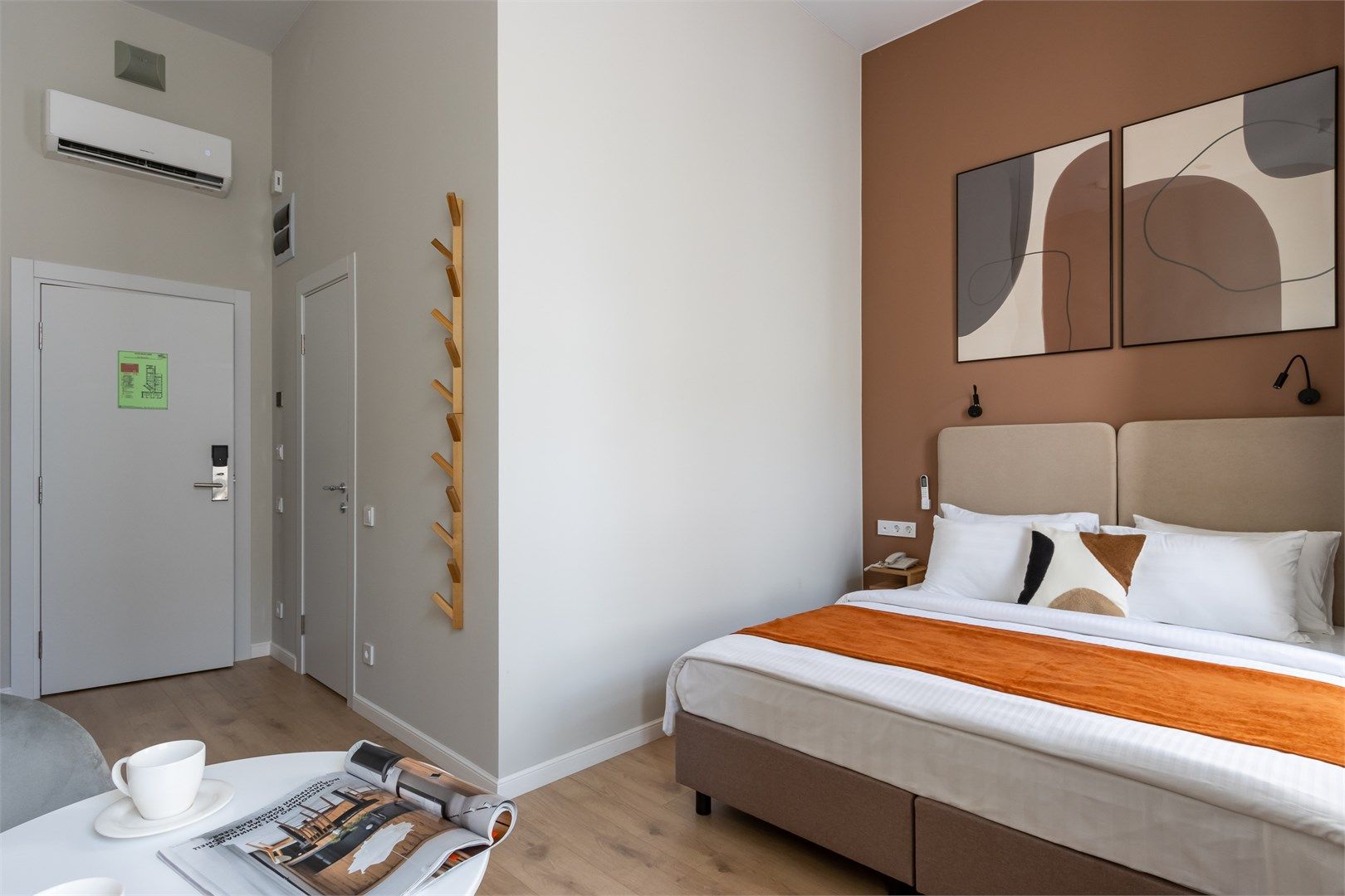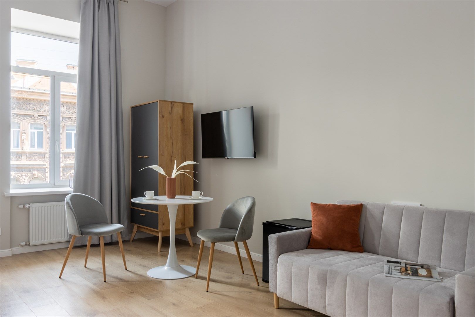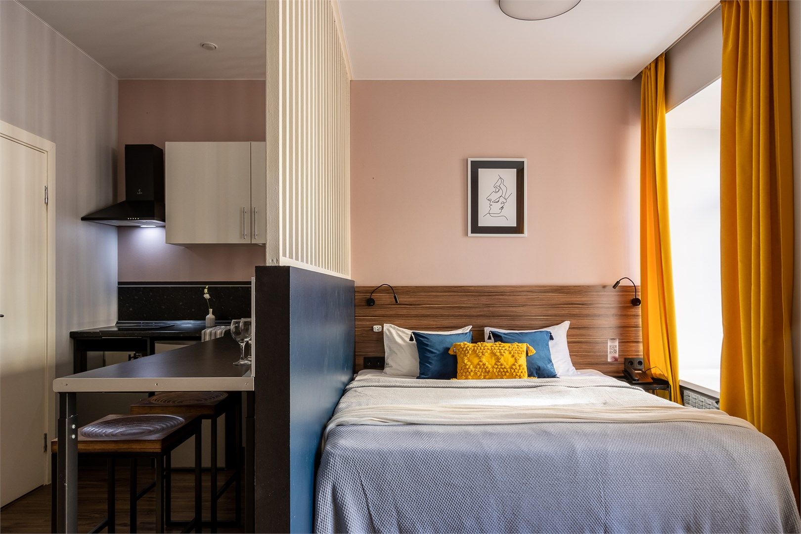 Звукоизолированный номер-студио с мини-кухней и кондиционером. В собственной ванной комнате: • Душ • Фен • Бесплатные туалетно-косметические принадлежности • Тапочки • Полотенца Вид: • Вид на город • Вид во внутренний дворик Удобства апартаментов: ​ • Мини-кухня • Холодильник • Плита • Микроволновая печь • Кухонные принадлежности • Кондиционер • Телефон • Отопление • Деревянный или паркетный пол •...