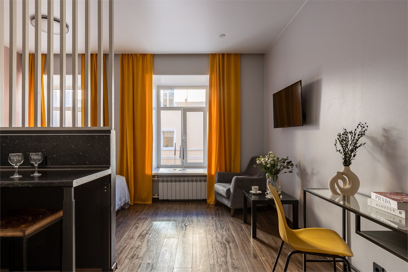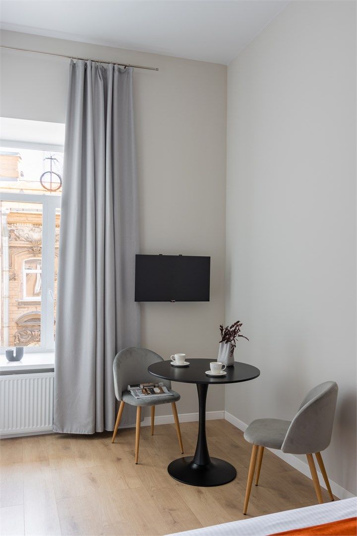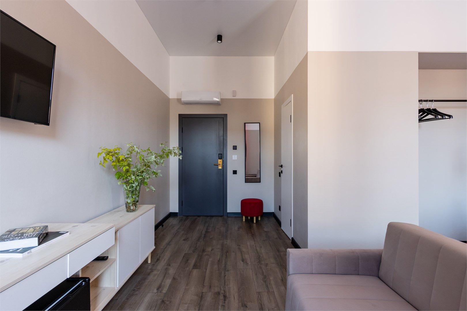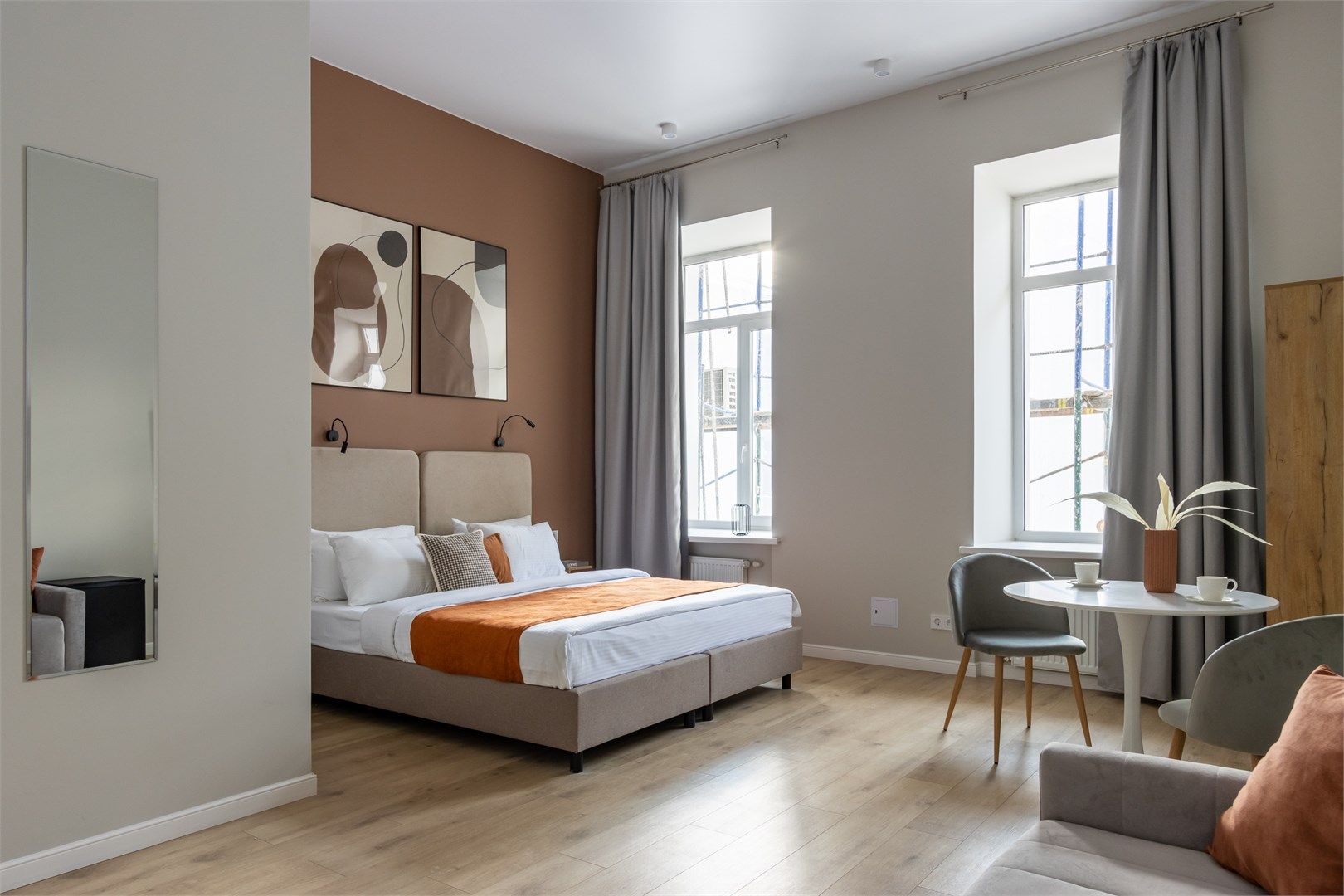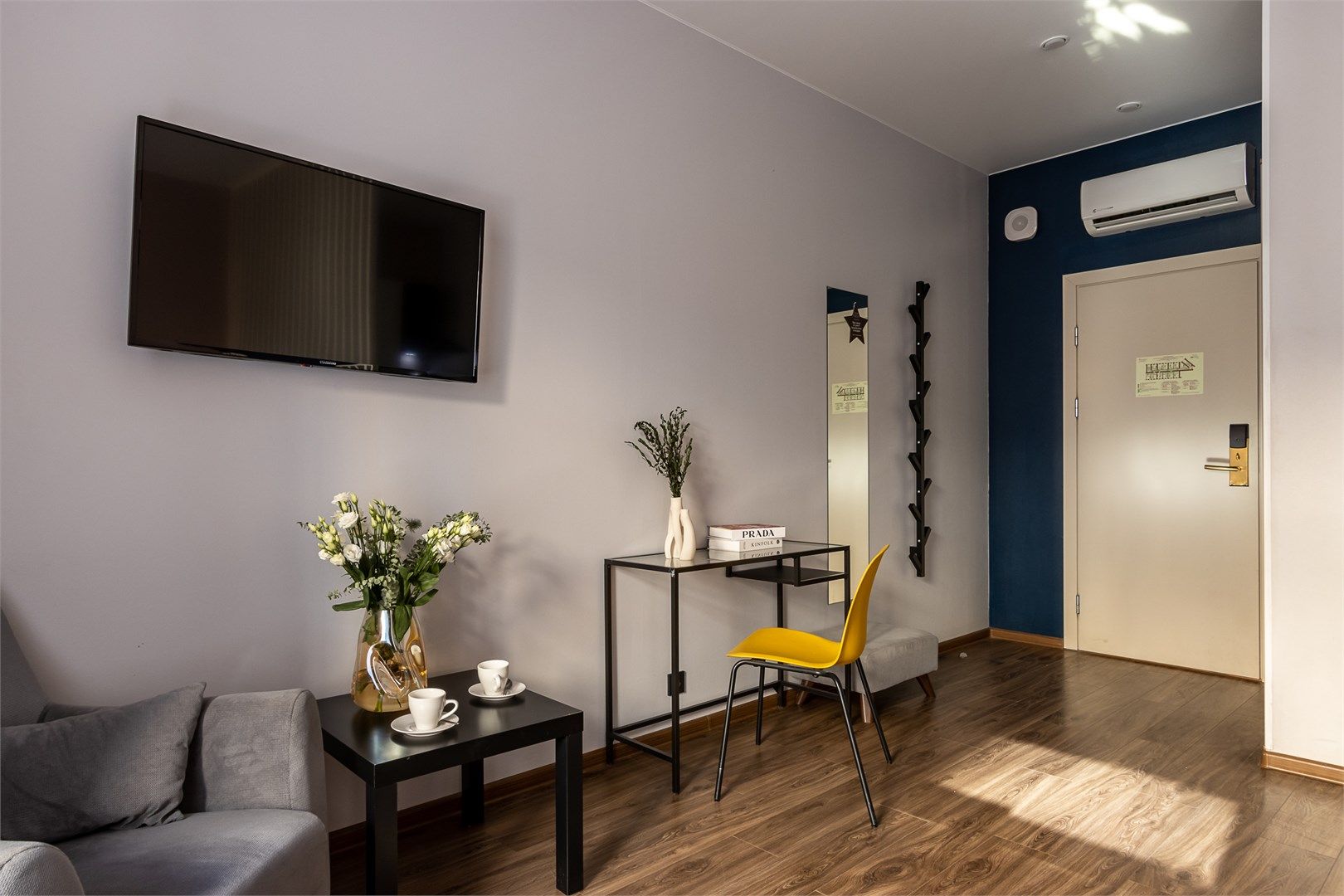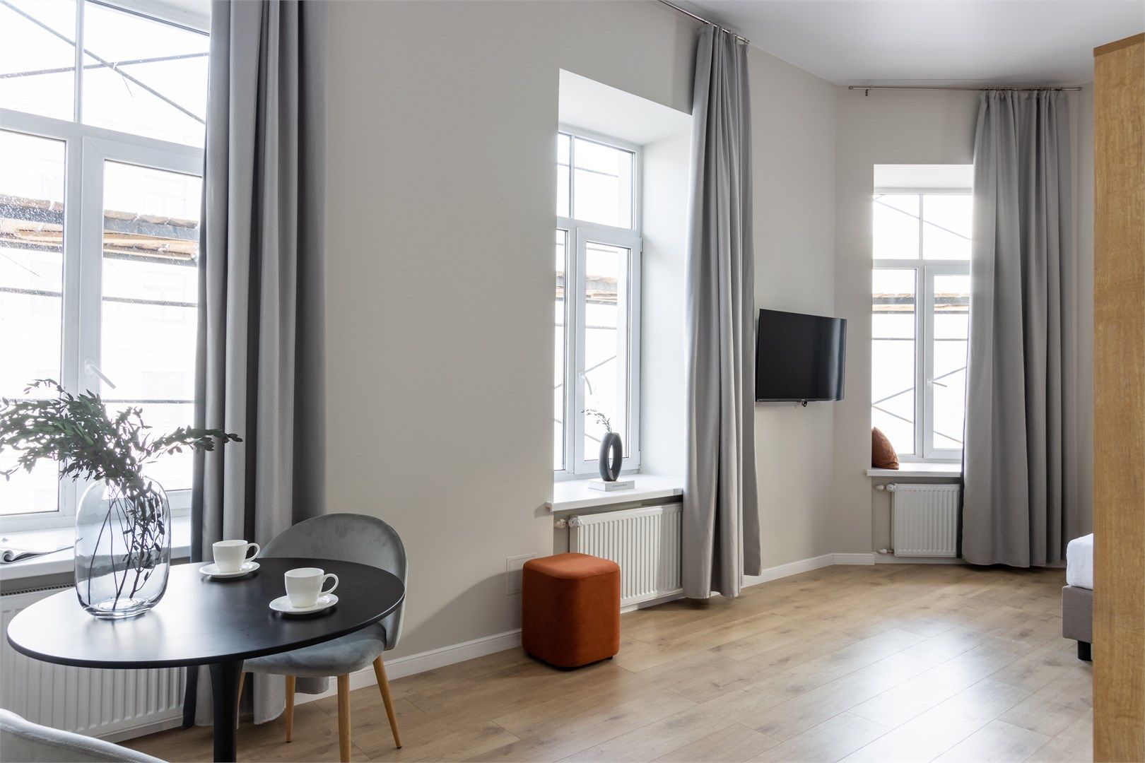 Звукоизолированный номер-студио с мини-кухней и кондиционером. В собственной ванной комнате: • Душ • Фен • Бесплатные туалетно-косметические принадлежности • Тапочки • Полотенца Вид: • Вид на город • Вид во внутренний дворик Удобства апартаментов: ​ • Мини-кухня • Холодильник • Плита • Микроволновая печь • Кухонные принадлежности • Кондиционер • Телефон • Отопление • Деревянный или паркетный пол •...