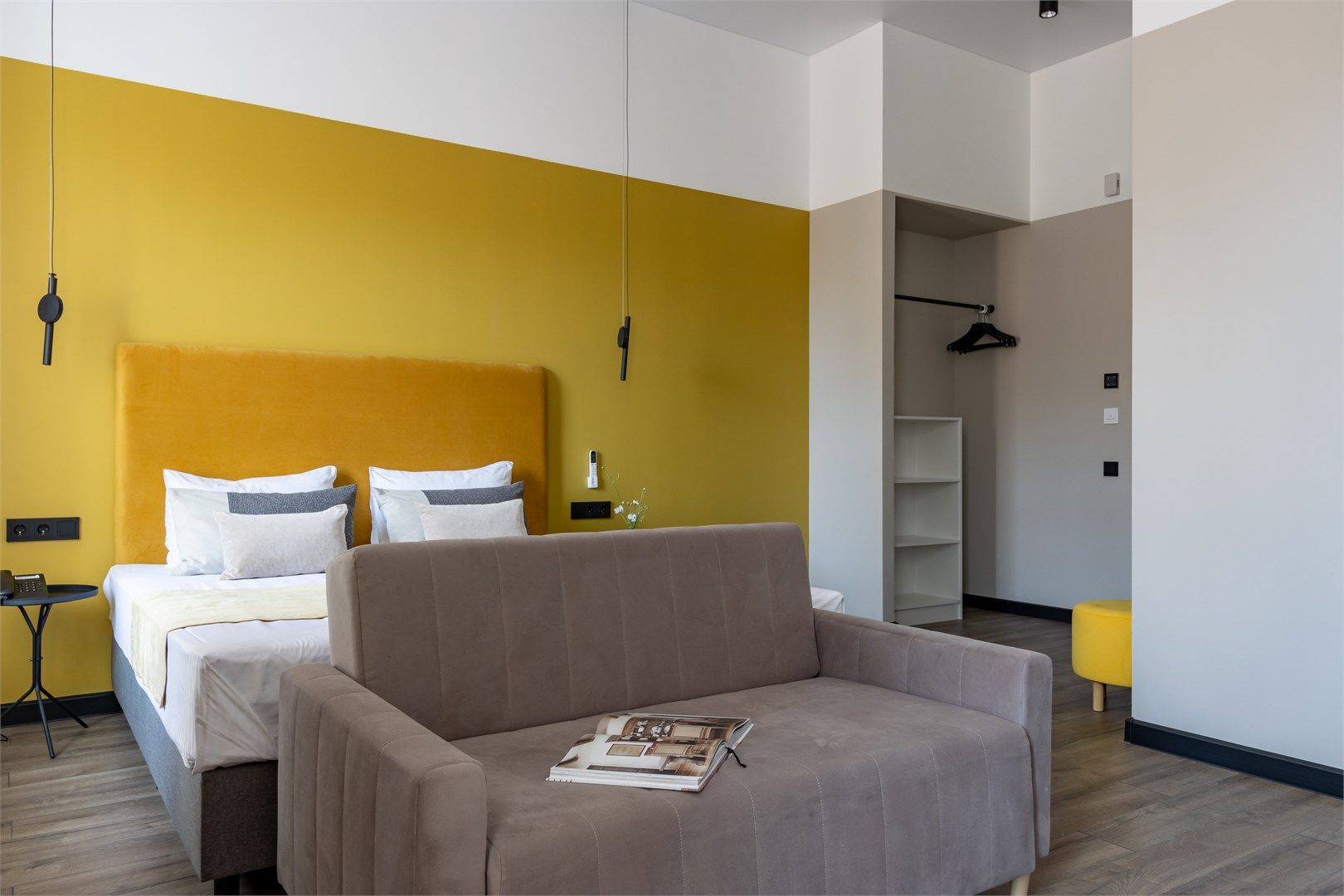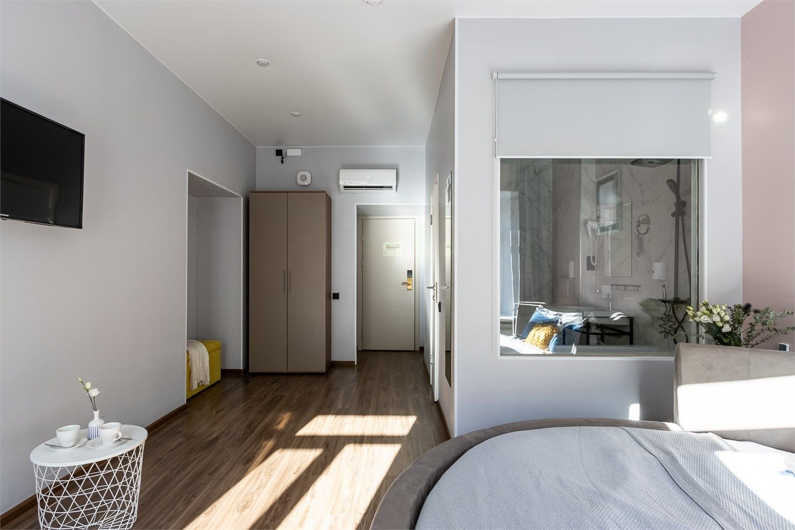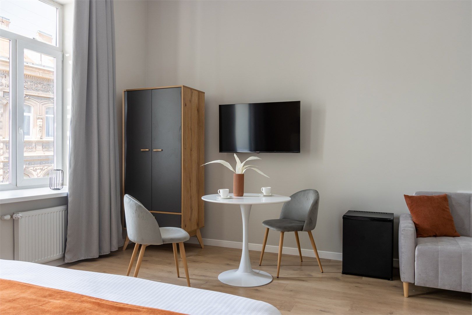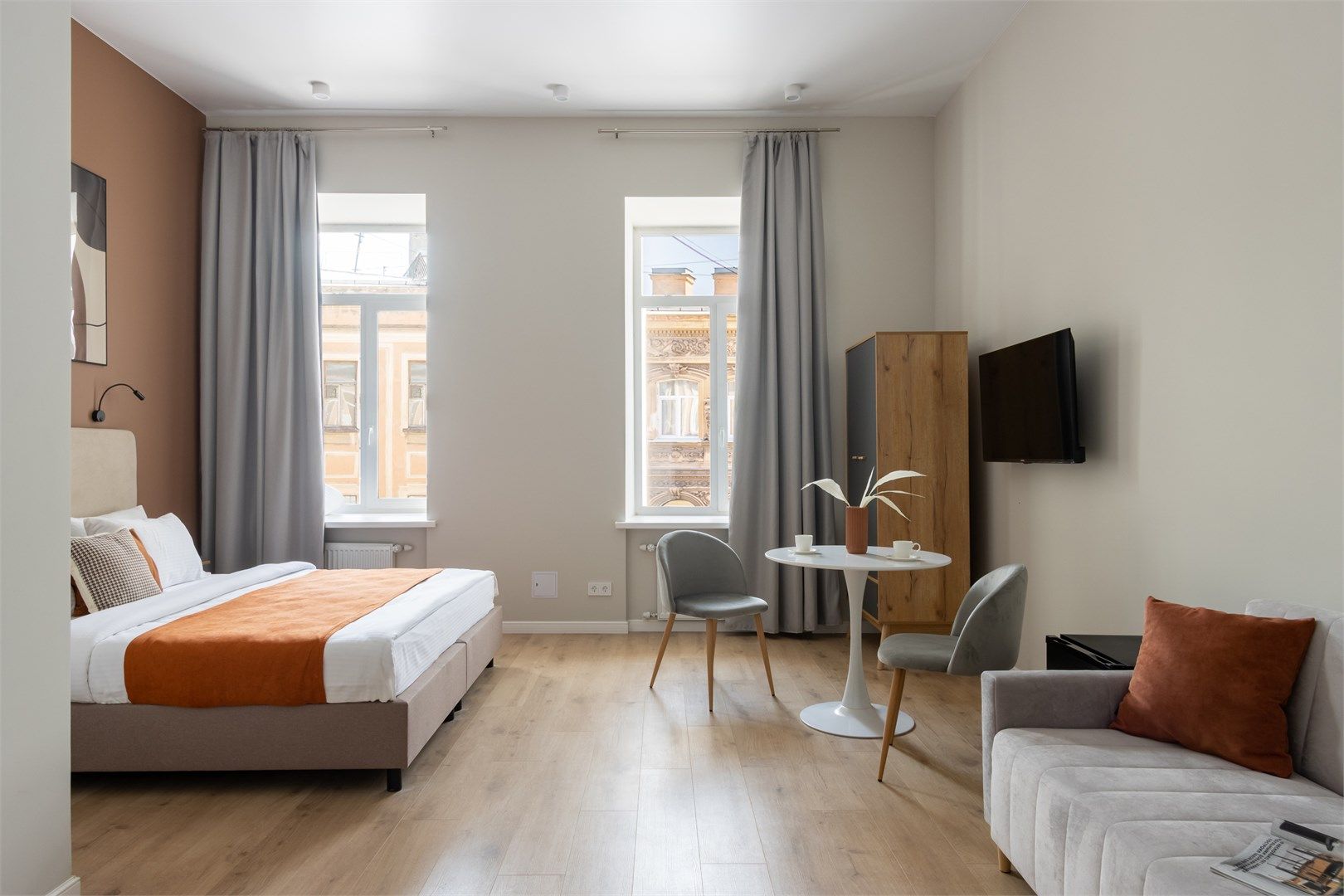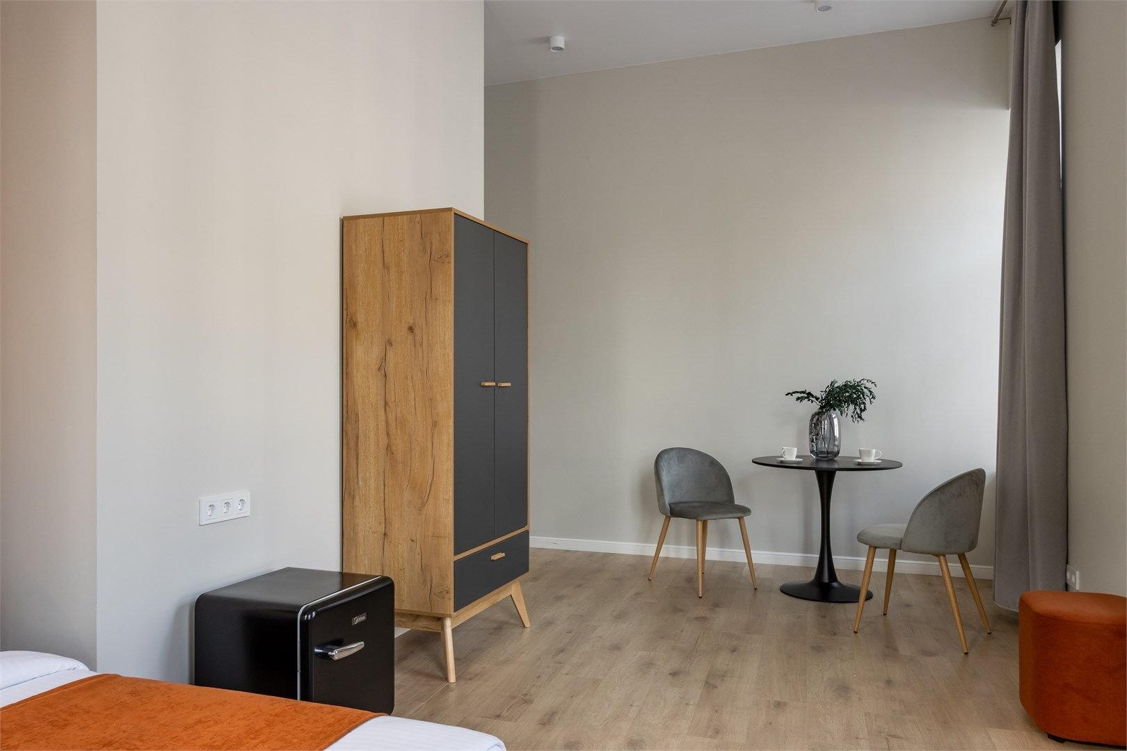 Звукоизолированный номер-студио с мини-кухней и кондиционером. В собственной ванной комнате: • Душ • Фен • Бесплатные туалетно-косметические принадлежности • Тапочки • Полотенца Вид: • Вид на город • Вид во внутренний дворик Удобства апартаментов: ​ • Мини-кухня • Холодильник • Плита • Микроволновая печь • Кухонные принадлежности • Кондиционер • Телефон • Отопление • Деревянный или паркетный пол •...