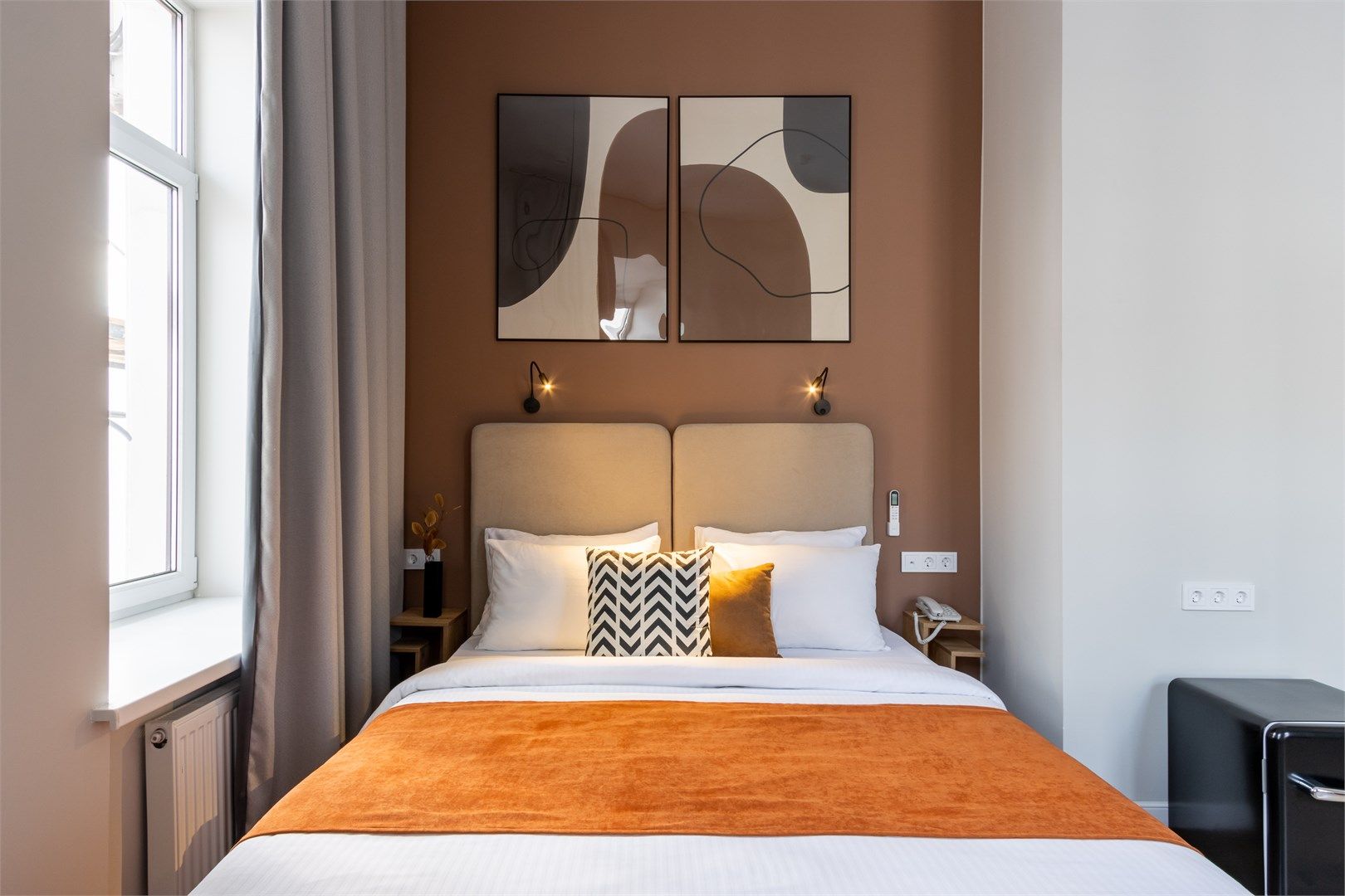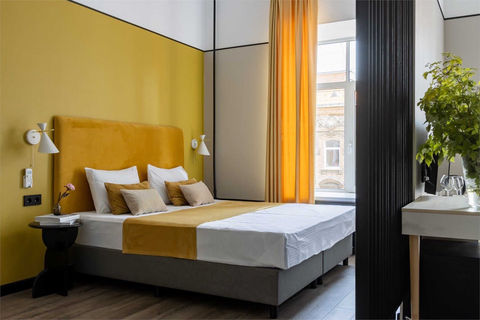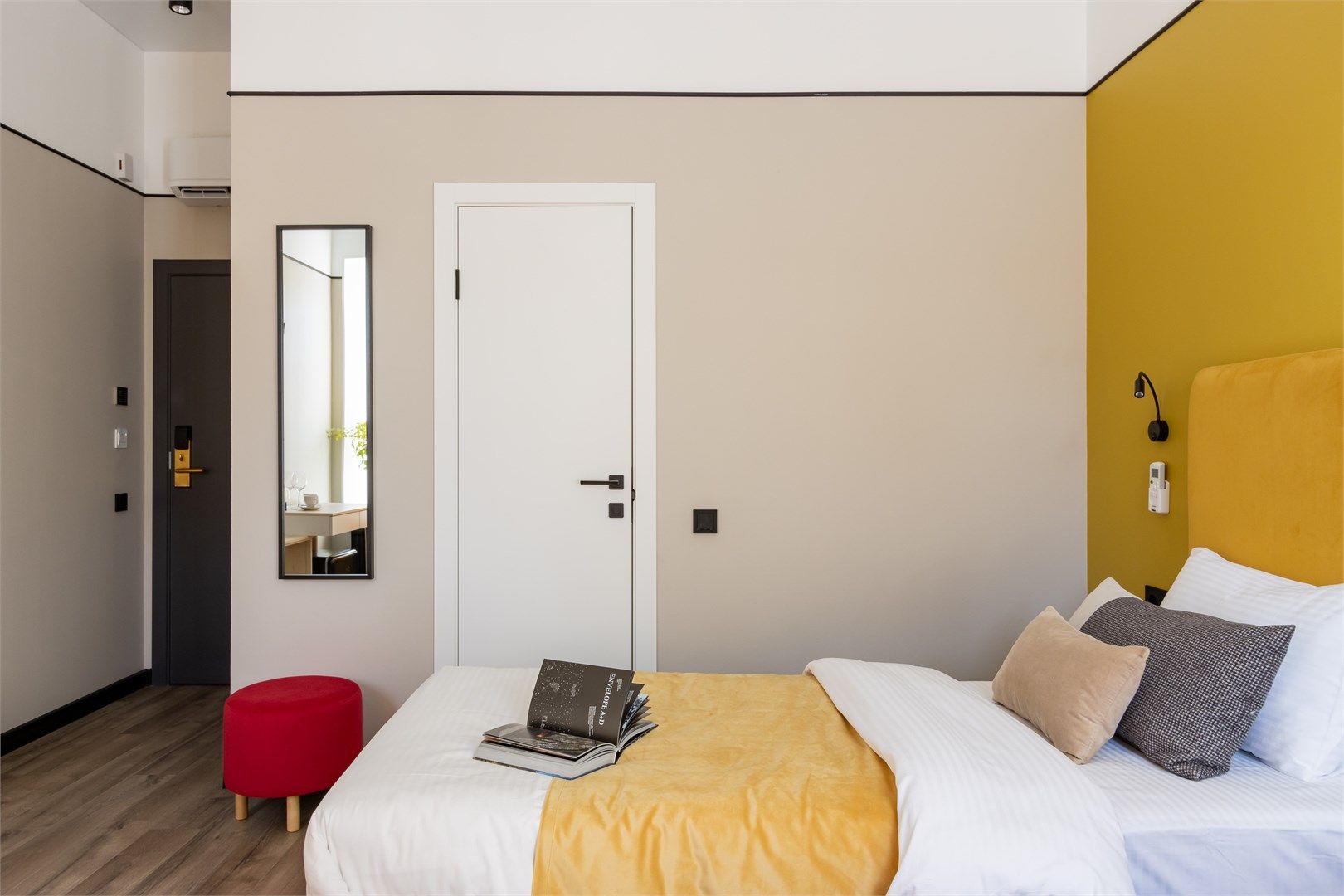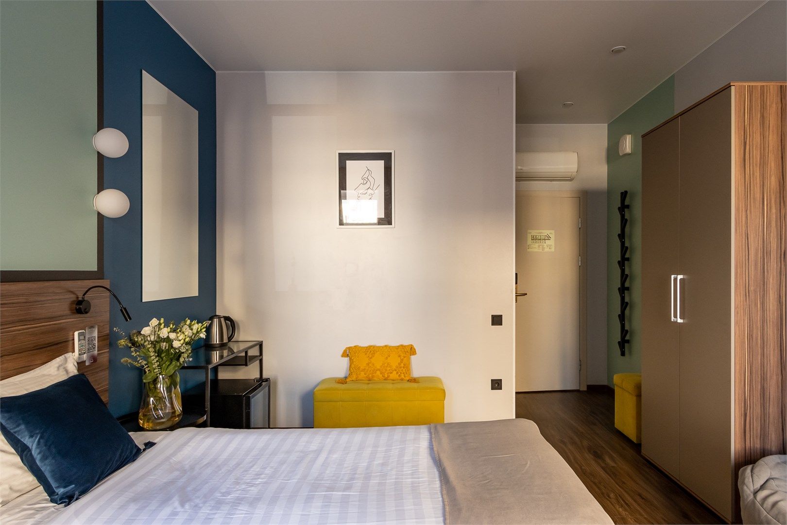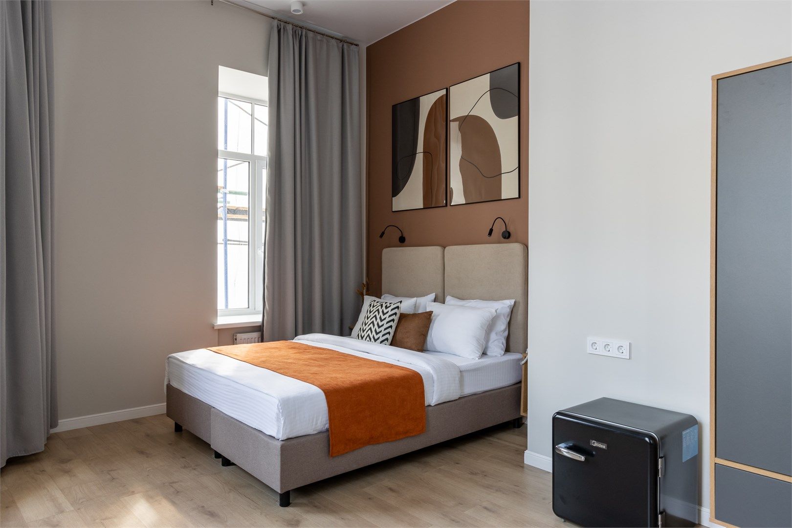 Звукоизолированный двухместный номер с 1 кроватью, электрическим чайником и плоским телевизором. В собственной ванной комнате: • Душ • Фен • Бесплатные туалетно-косметические принадлежности • Тапочки • Полотенца Вид: • Вид на город • Вид во внутренний дворик Услуги и удобства: ​ • Холодильник • Кондиционер • Телефон • Отопление • Деревянный или паркетный пол • Звукоизоляция • Услуга «звонок-будиль...