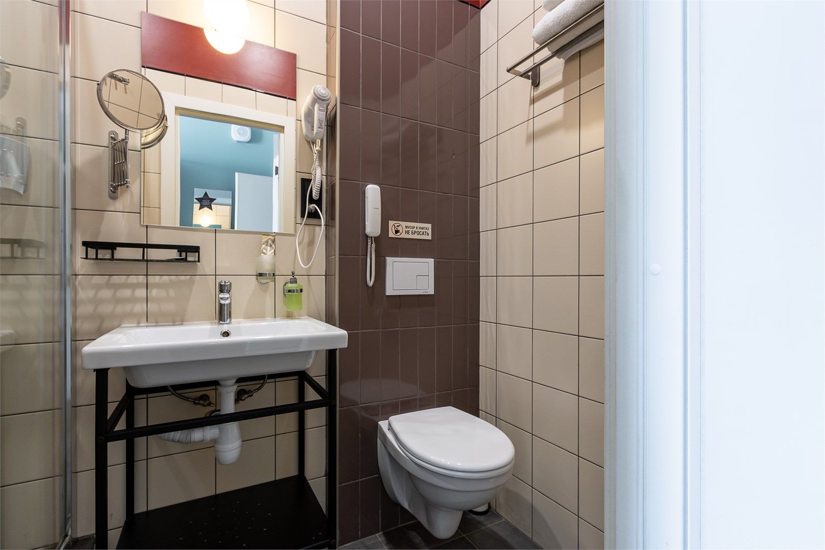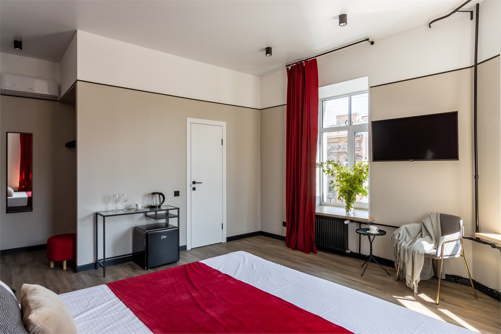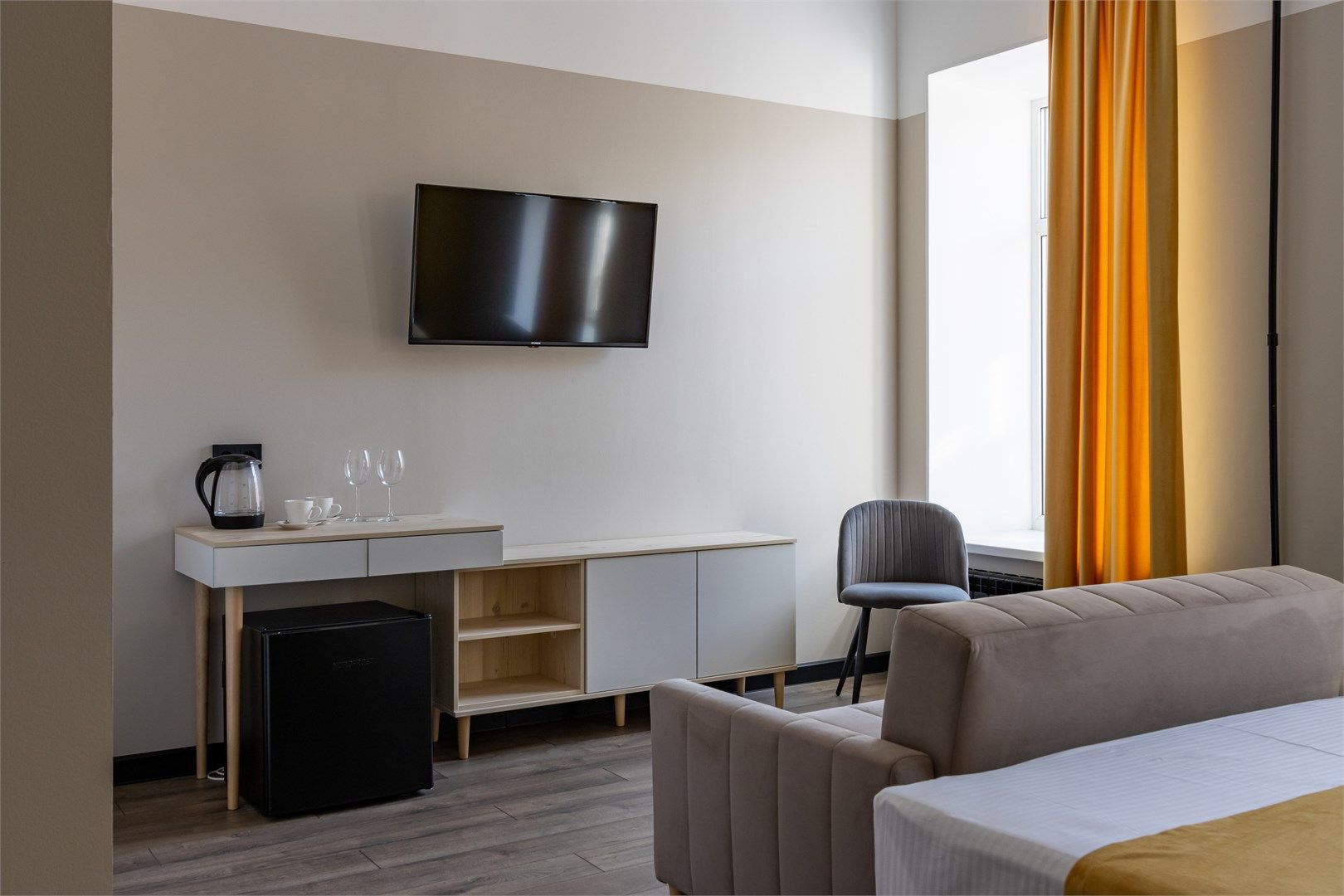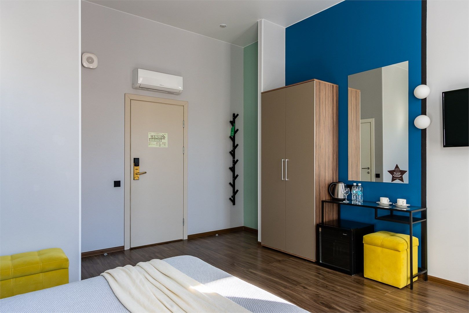 Звукоизолированный двухместный номер с 1 кроватью, электрическим чайником и плоским телевизором. В собственной ванной комнате: • Душ • Фен • Бесплатные туалетно-косметические принадлежности • Тапочки • Полотенца Вид: • Вид на город • Вид во внутренний дворик Услуги и удобства: ​ • Холодильник • Кондиционер • Телефон • Отопление • Деревянный или паркетный пол • Звукоизоляция • Услуга «звонок-будиль...