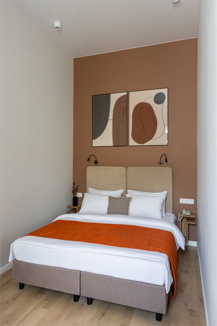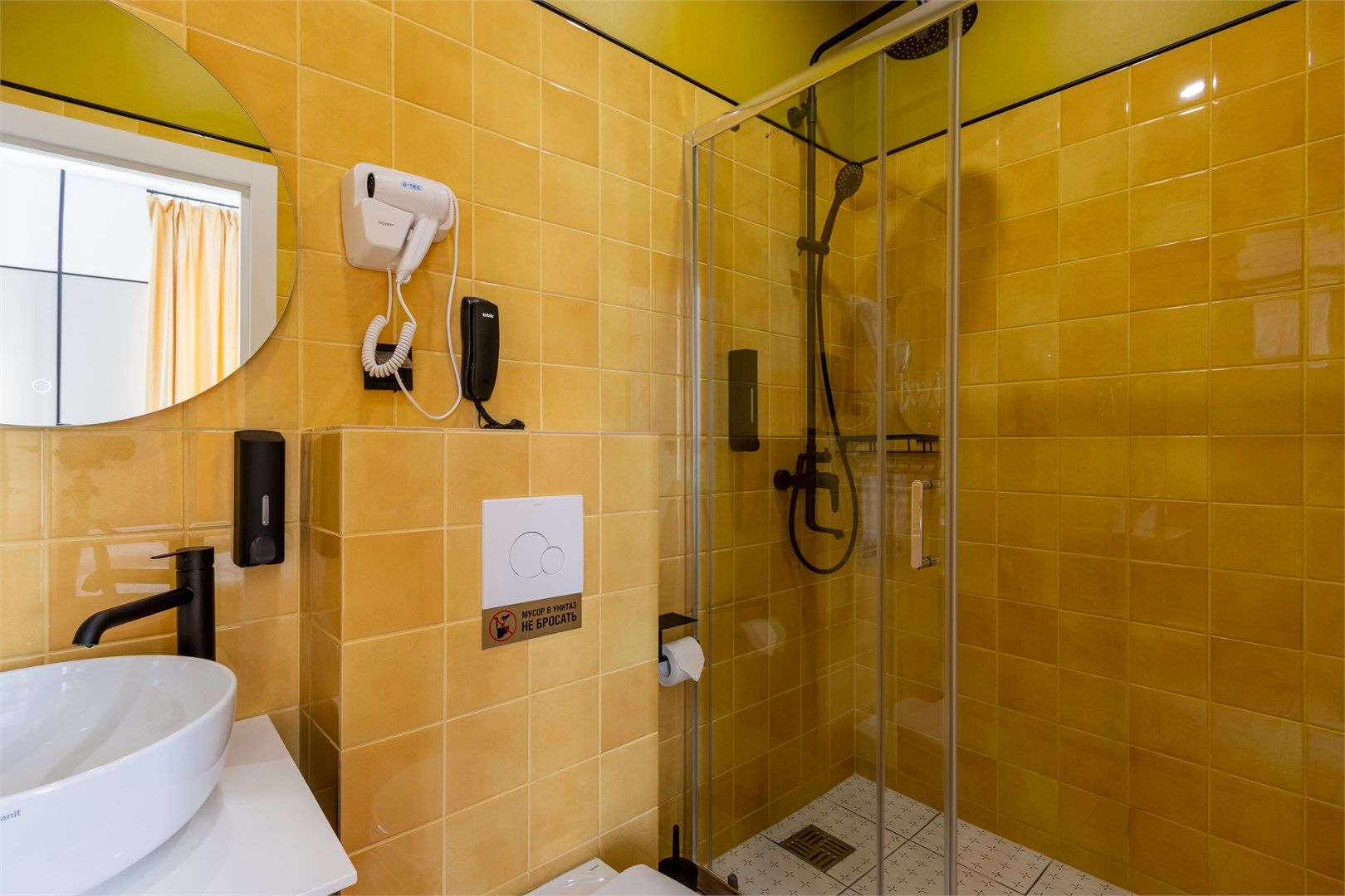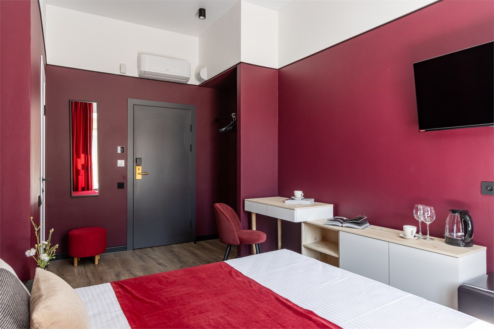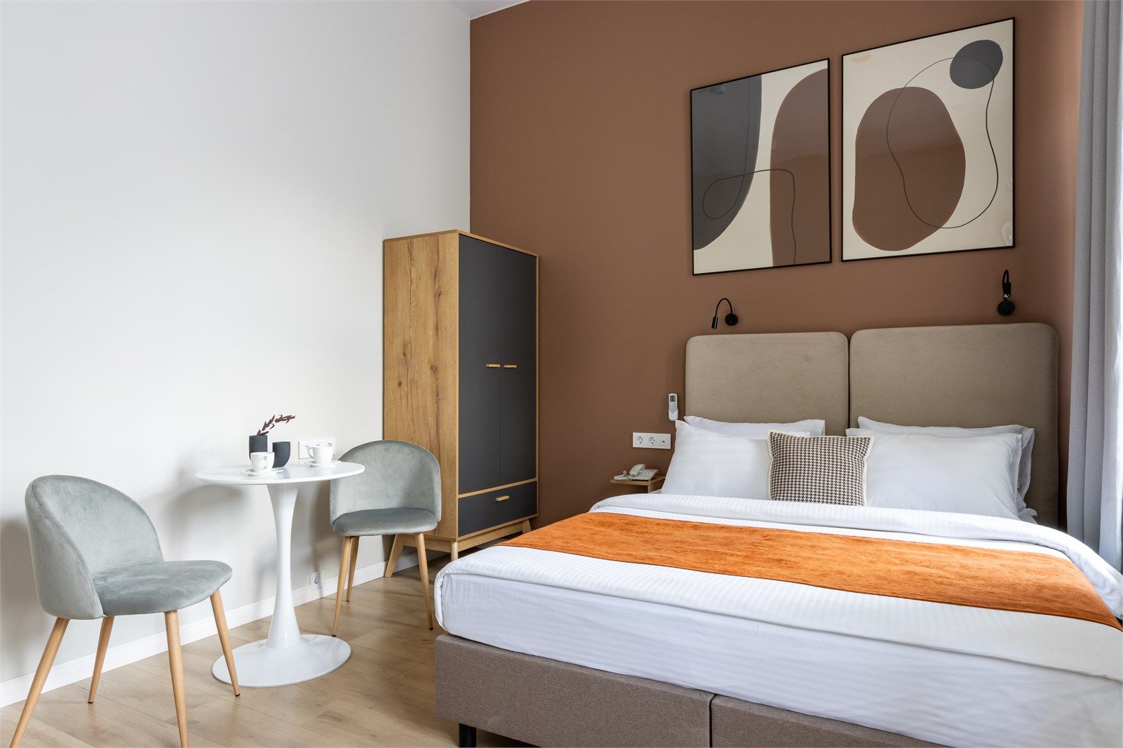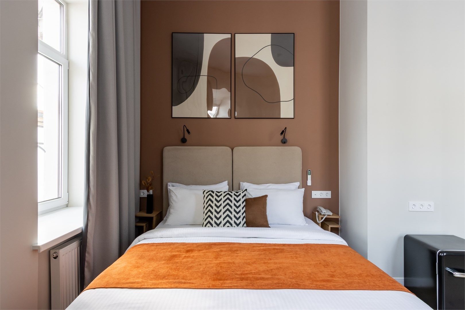 Звукоизолированный двухместный номер с 1 кроватью, электрическим чайником и плоским телевизором. В собственной ванной комнате: • Душ • Фен • Бесплатные туалетно-косметические принадлежности • Тапочки • Полотенца Вид: • Вид на город • Вид во внутренний дворик Услуги и удобства: ​ • Холодильник • Кондиционер • Телефон • Отопление • Деревянный или паркетный пол • Звукоизоляция • Услуга «звонок-будиль...