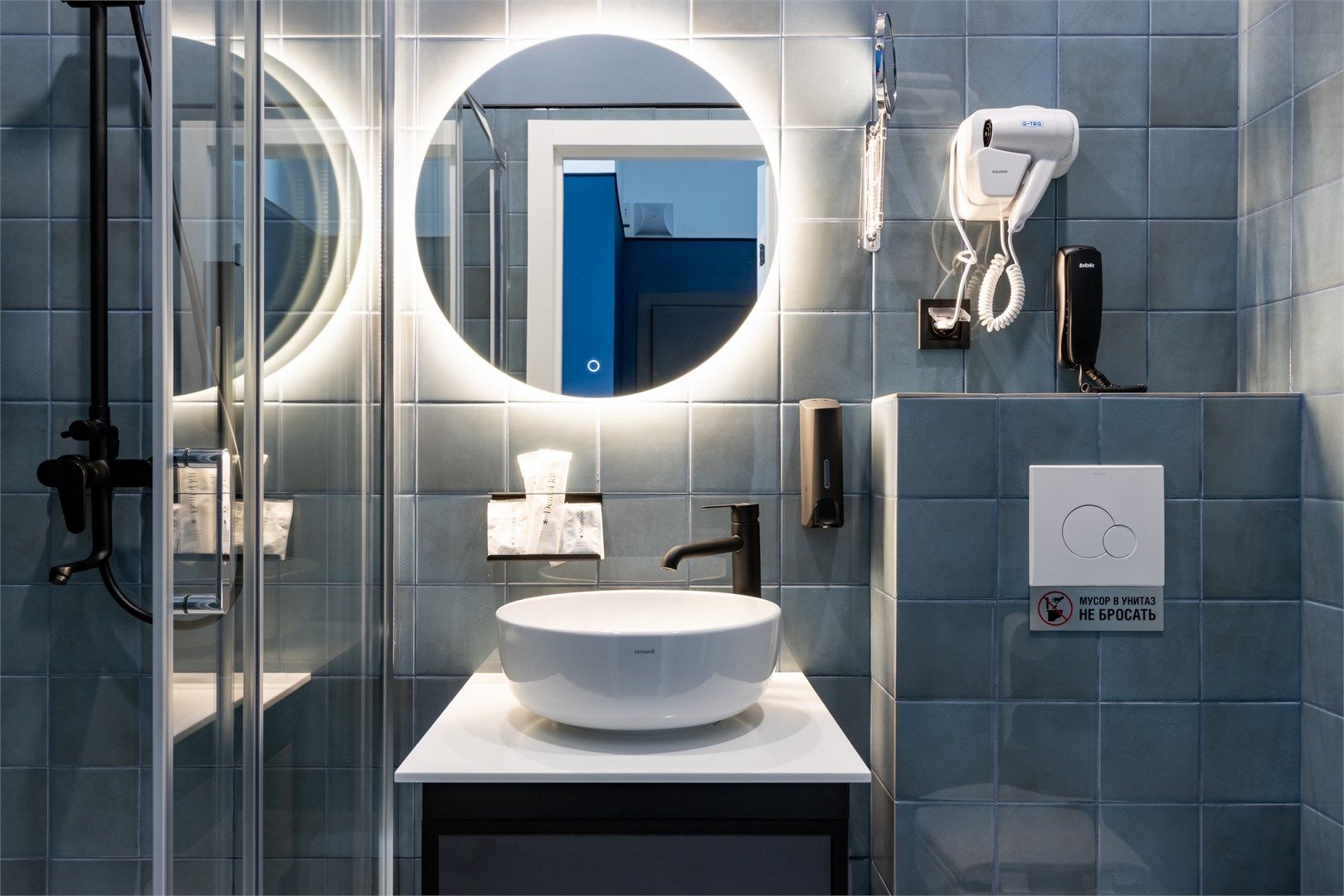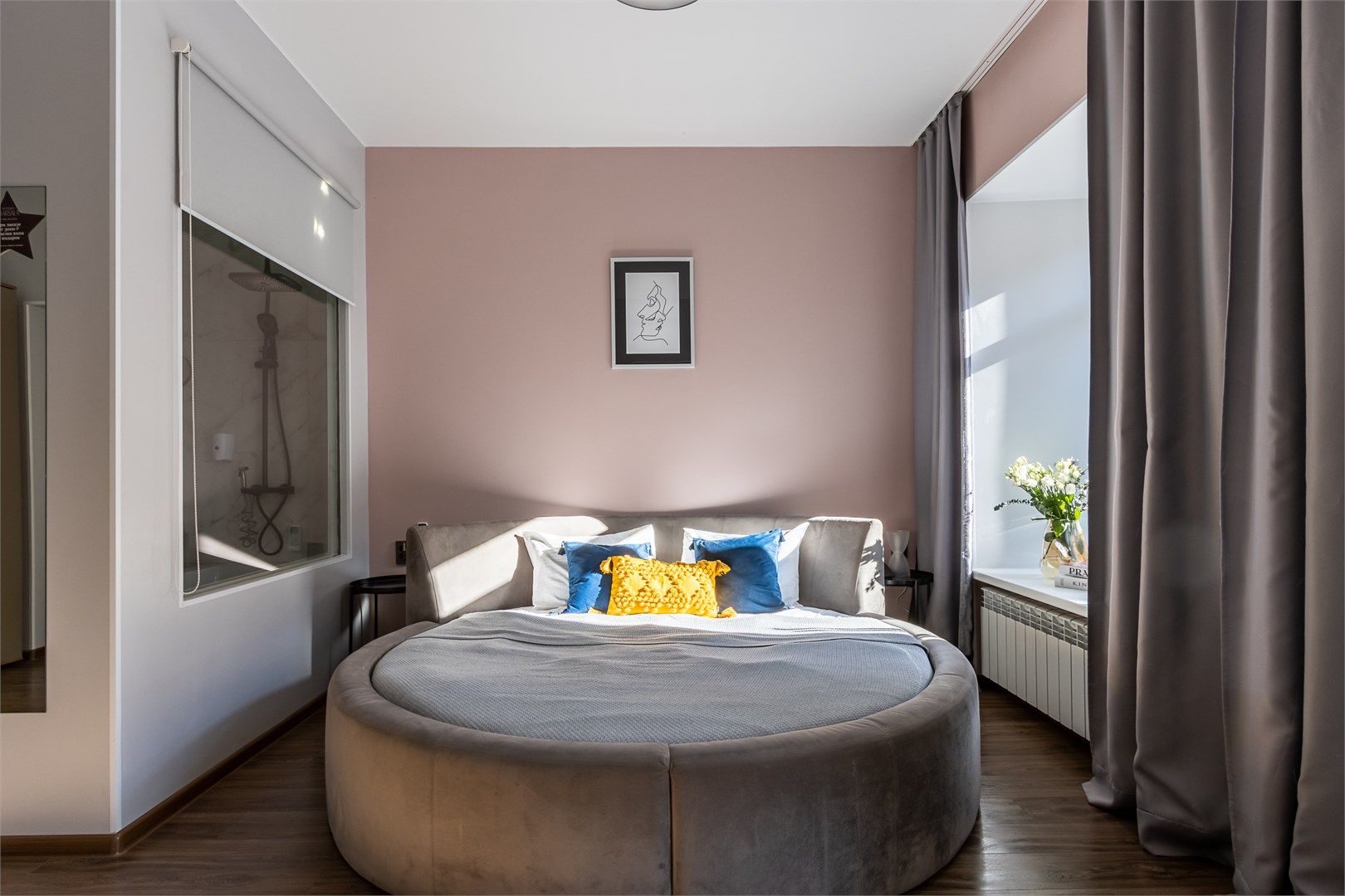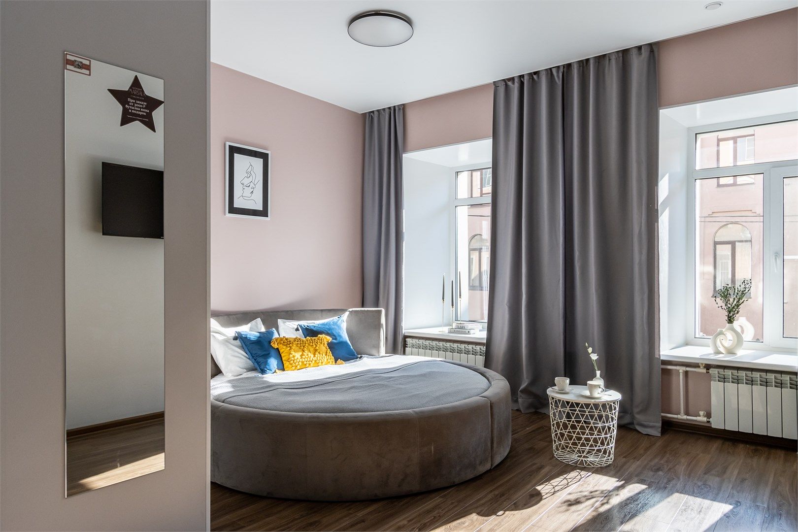 Особенность - круглая кровать в номере. В собственной ванной комнате: • Душ • Фен • Бесплатные туалетно-косметические принадлежности • Тапочки • Полотенца Вид: • Вид на город Услуги и удобства номера: ​ • Холодильник • Кондиционер • Телефон • Отопление • Деревянный или паркетный пол • Звукоизоляция • Услуга «звонок-будильник» • Москитная сетка • Шкаф или гардероб • Белье • Лестница для доступа к в...