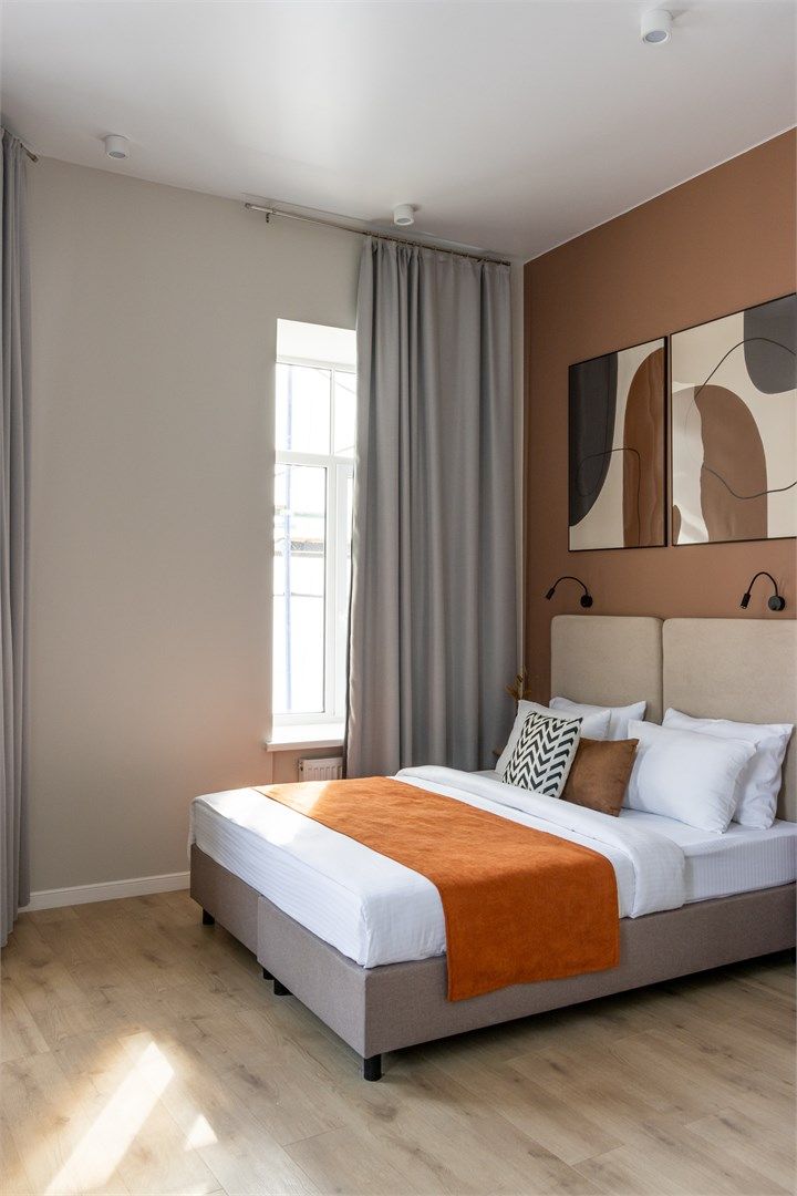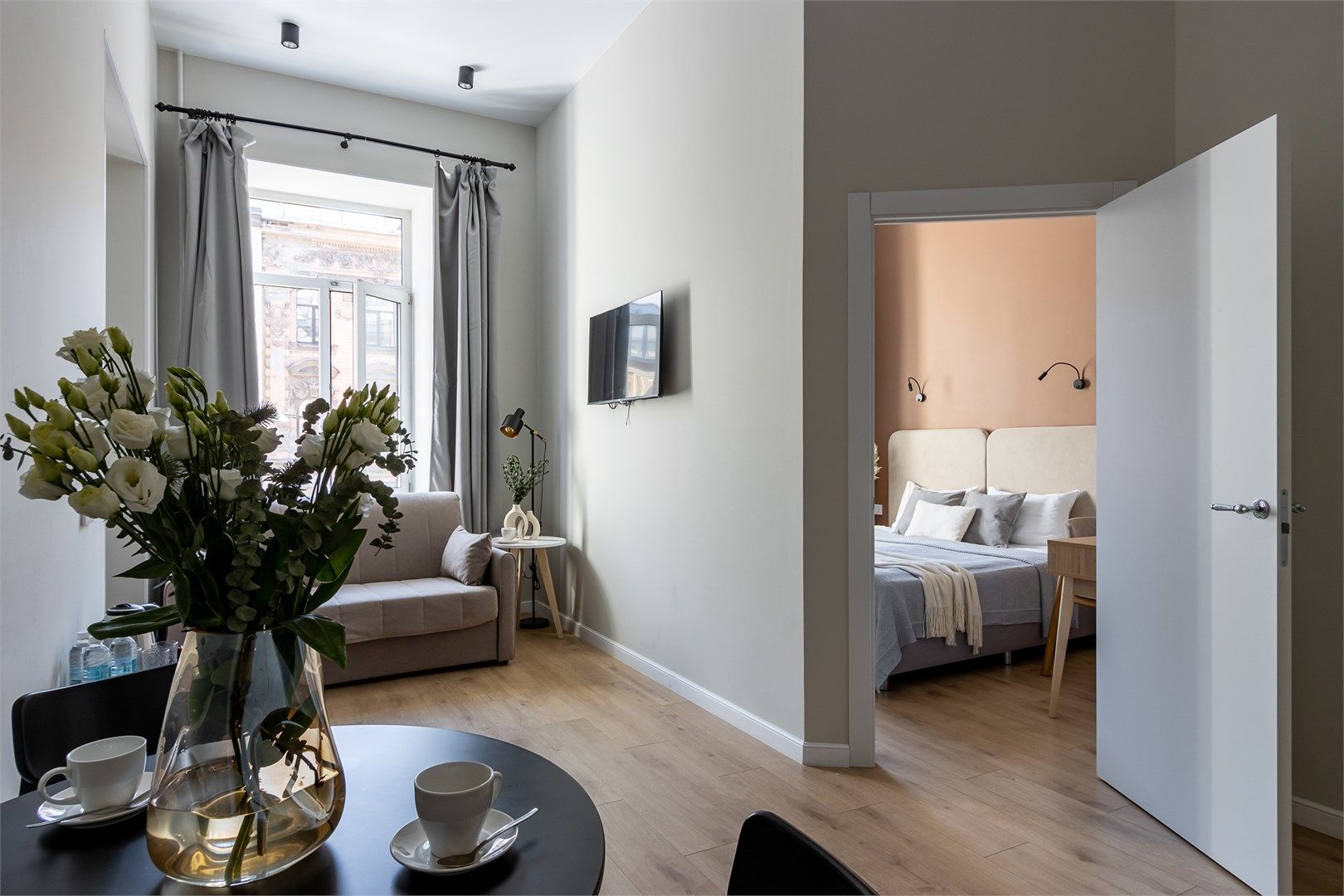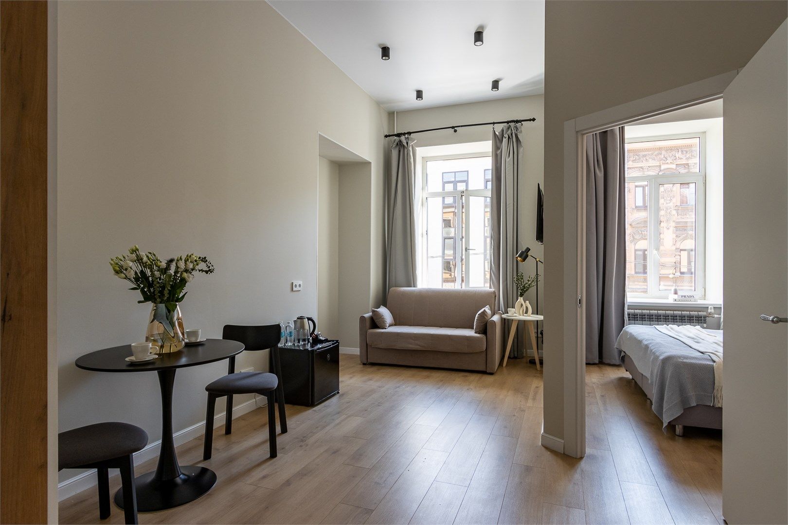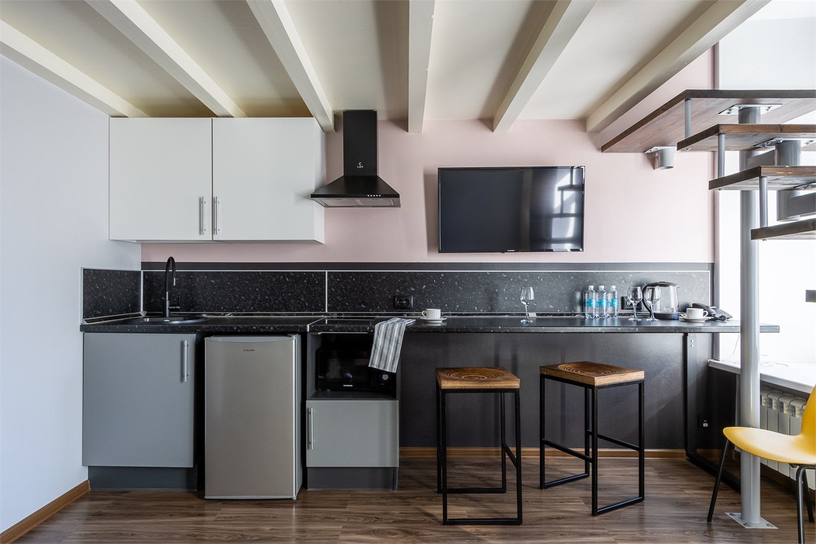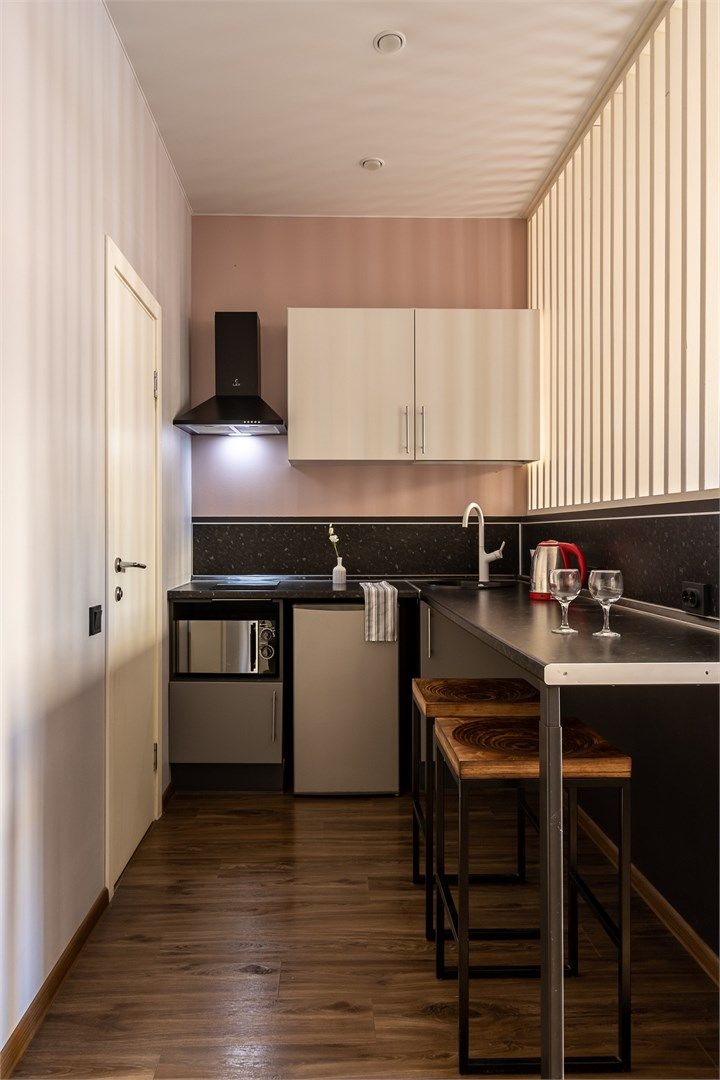 Двухкомнатный номер с мини-кухней и кондиционером. В собственной ванной комнате: • Душ • Фен • Бесплатные туалетно-косметические принадлежности • Тапочки • Полотенца Вид: • Вид на город Удобства апартаментов: ​ • Мини-кухня • Холодильник • Плита • Микроволновая печь • Кухонные принадлежности • Кондиционер • Телефон • Отопление • Деревянный или паркетный пол • Звукоизоляция • Услуга «звонок-будильн...