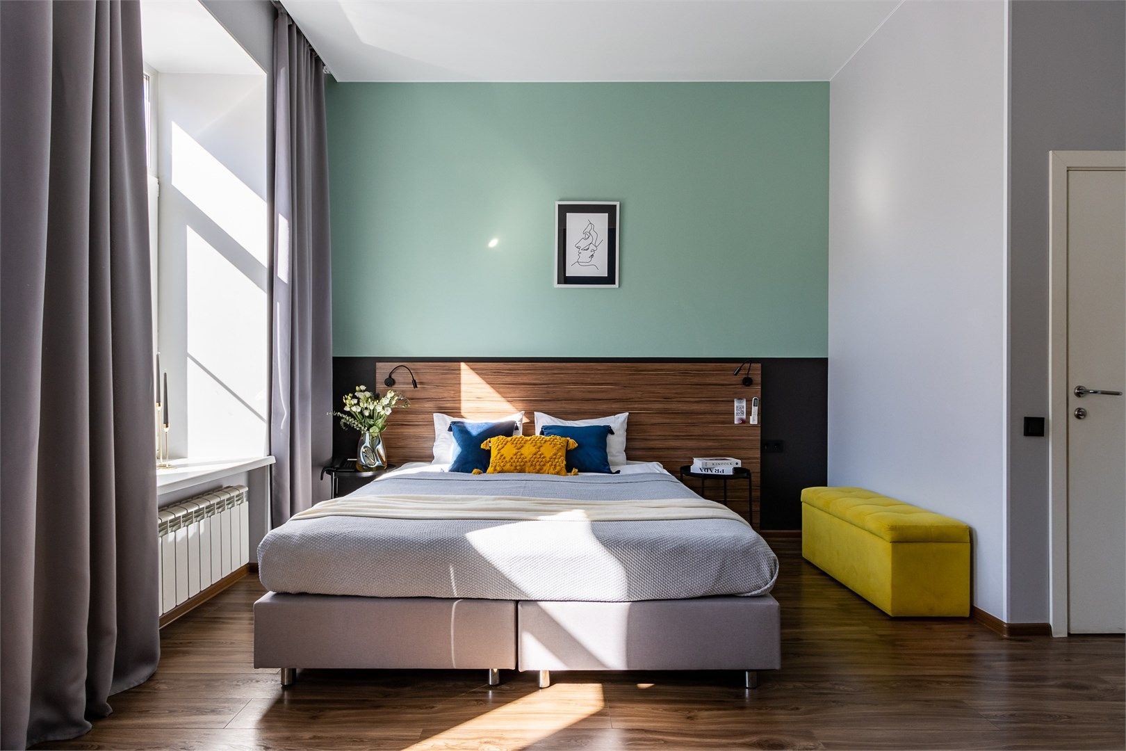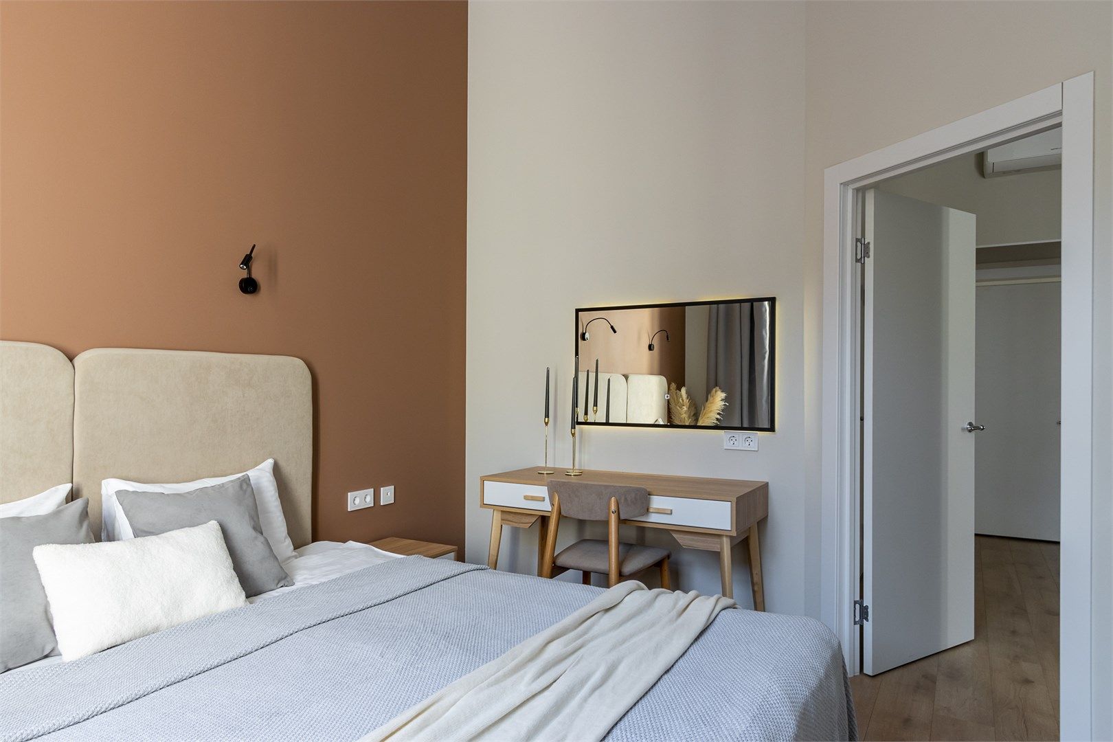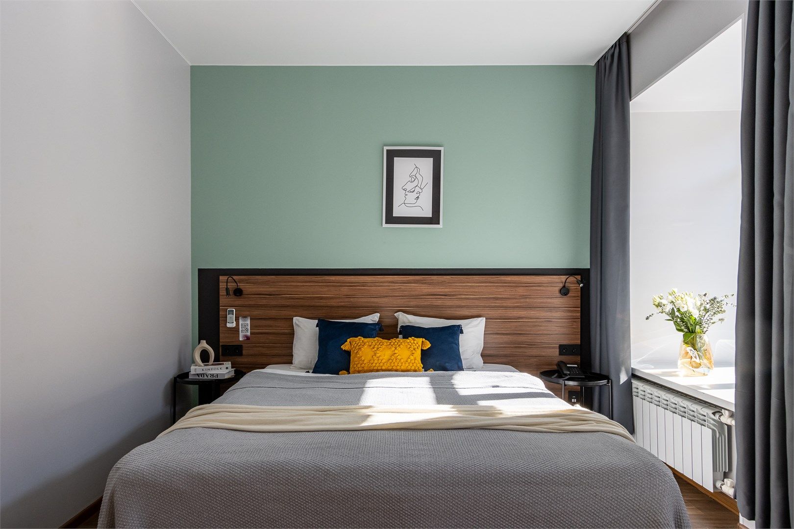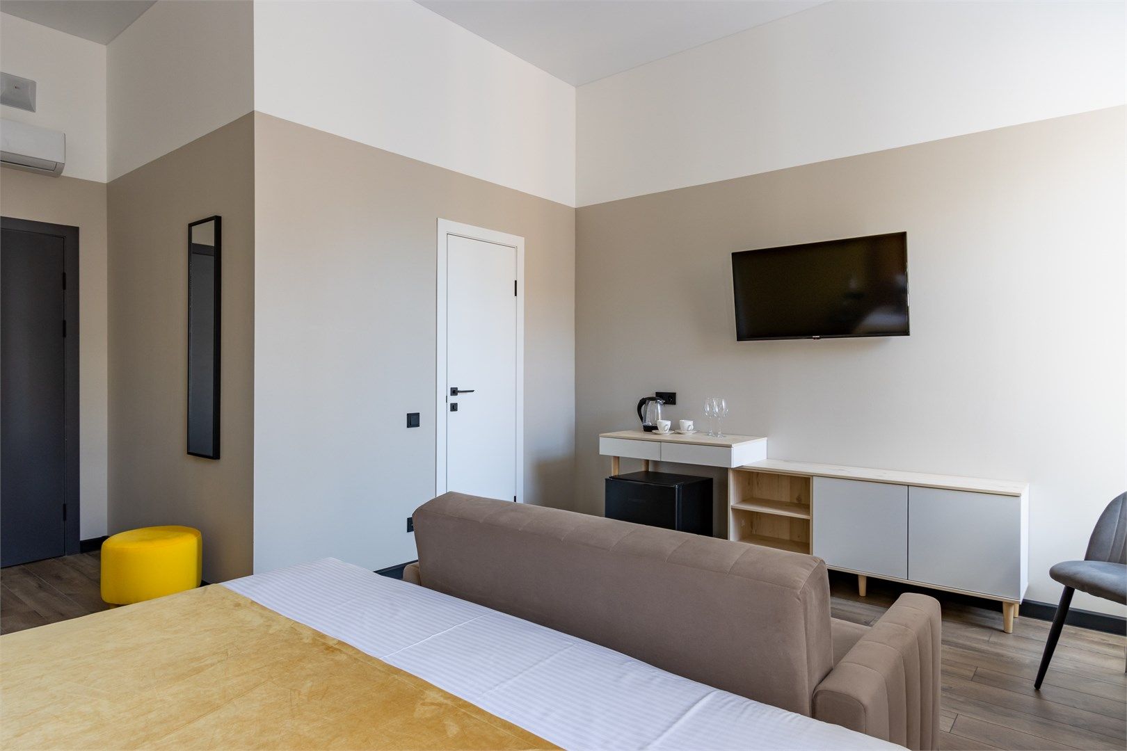 Двухкомнатный номер с мини-кухней и кондиционером. В собственной ванной комнате: • Душ • Фен • Бесплатные туалетно-косметические принадлежности • Тапочки • Полотенца Вид: • Вид на город Удобства апартаментов: ​ • Мини-кухня • Холодильник • Плита • Микроволновая печь • Кухонные принадлежности • Кондиционер • Телефон • Отопление • Деревянный или паркетный пол • Звукоизоляция • Услуга «звонок-будильн...
