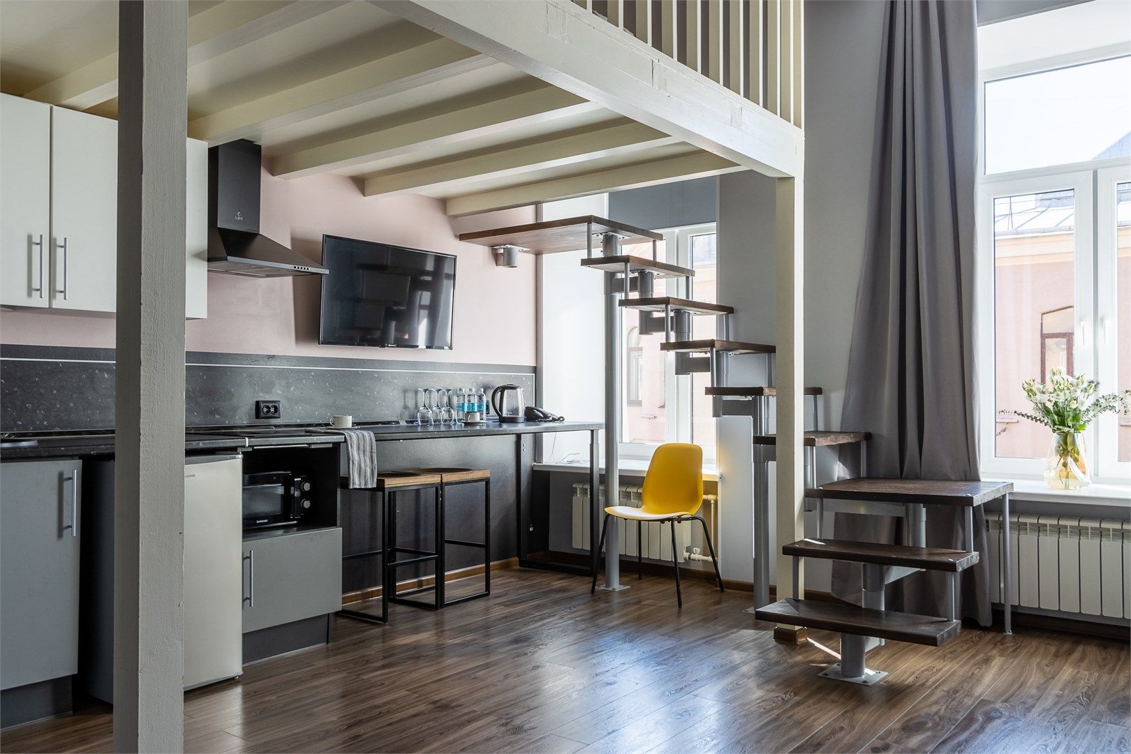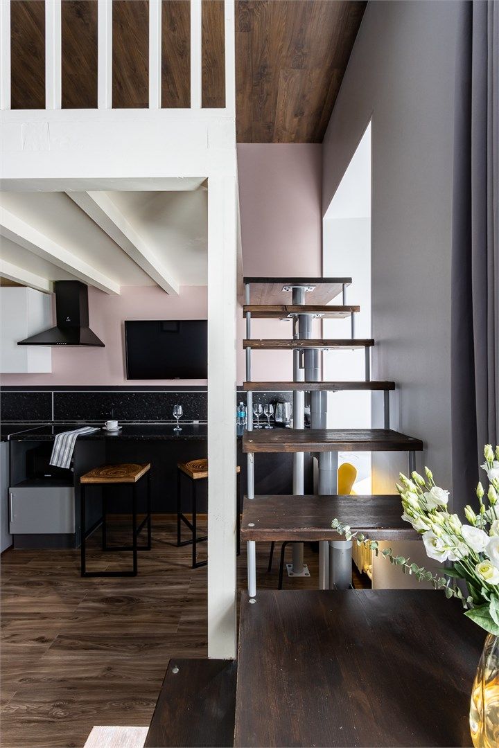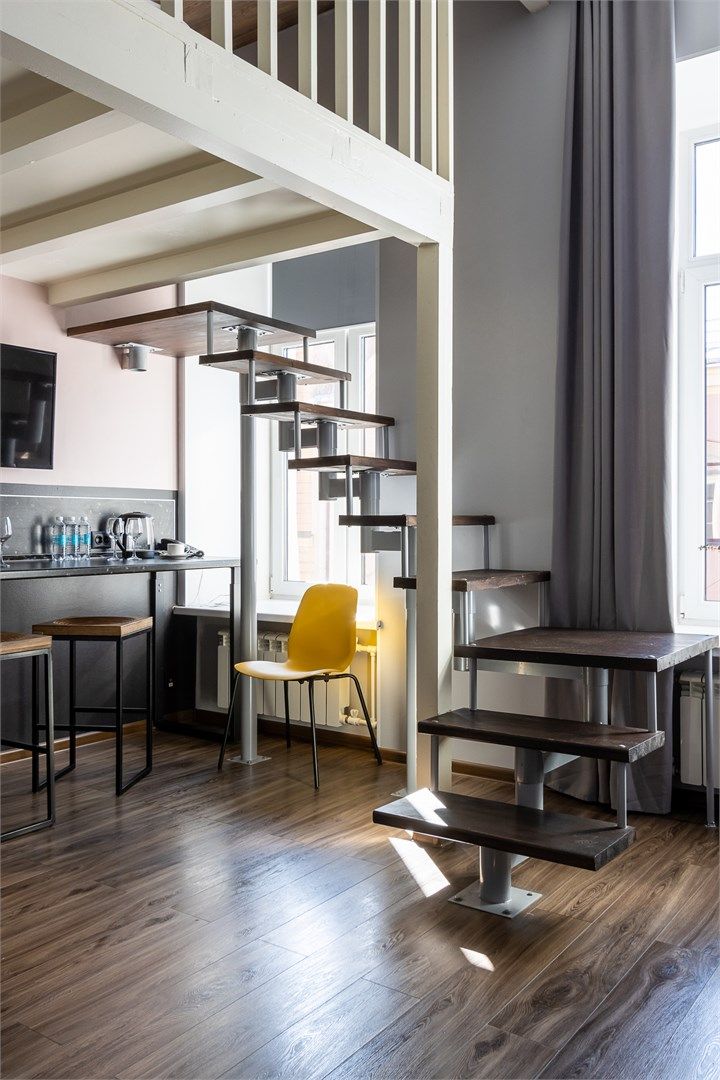 Двухуровневый номер с мини-кухней, двуспальной кроватью и диваном. В собственной ванной комнате: • Душ • Фен • Бесплатные туалетно-косметические принадлежности • Тапочки • Полотенца Вид: • Вид на город • Вид во внутренний дворик Удобства апартаментов: ​ • Диван • Двуспальная кровать • Мини-кухня • Холодильник • Плита • Микроволновая печь • Кухонные принадлежности • Кондиционер • Телефон • Отоплени...