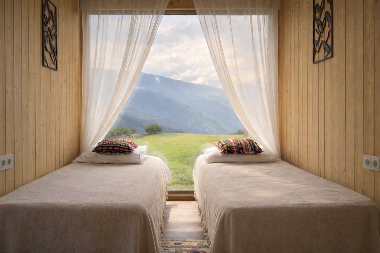 Номера «Тазбичи» расположены на второй территории глэмпинга «Берег неба» — в горном селе Тазбичи.