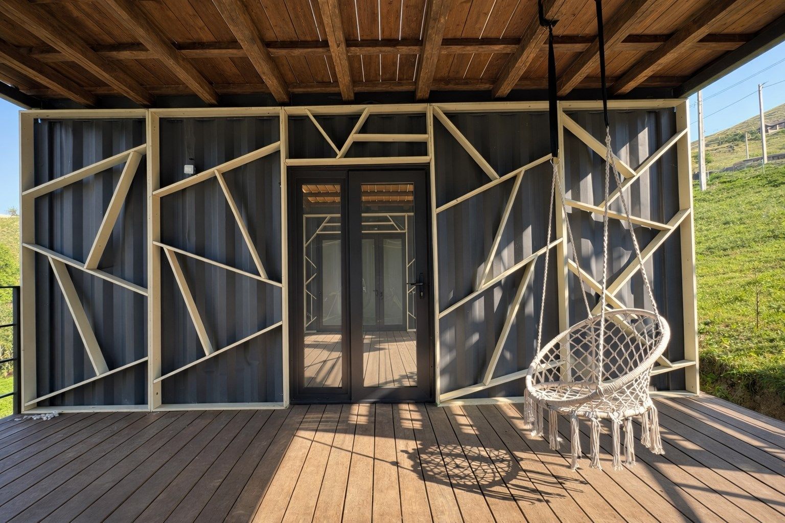Мини-дом №2 - 12 кв м с панорамным окном и удобствами внутри, включая кондиционер.