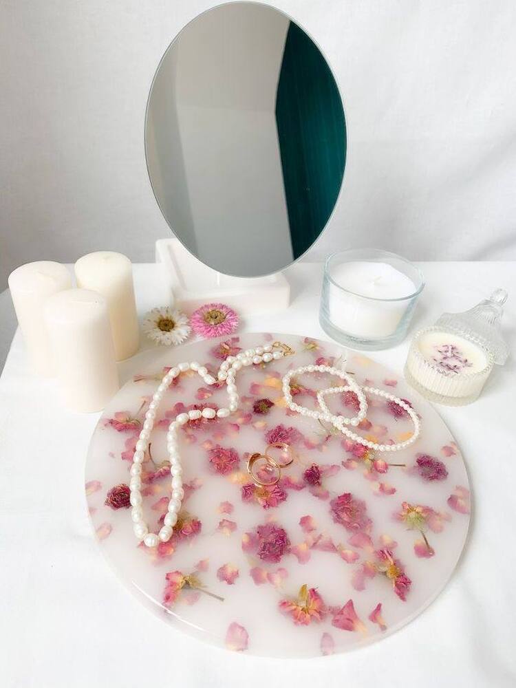 А еще на эпоксидном подносе можно сделать алтарик, как это сделала я, разместив там все то, что гармонизирует мое пространство: камни, свечу, вазочку, ракушку, бусы для мантр и палочки пало санто.