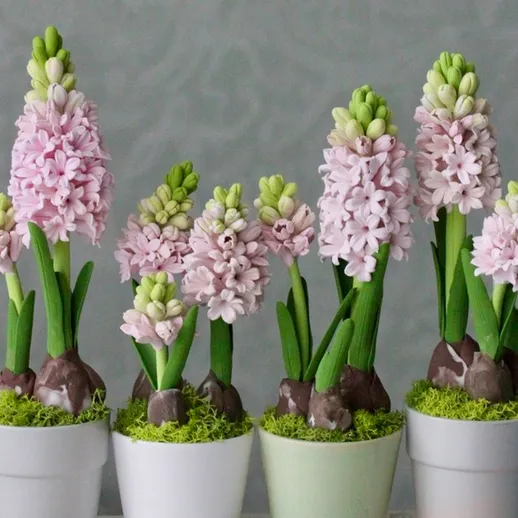За 3 часа вы слепите стебли, листья, порядка 15-ти цветочков, 10-ти полураслустившихся цветков и 10-ти бутонов гиацинта, а так же луковицы.