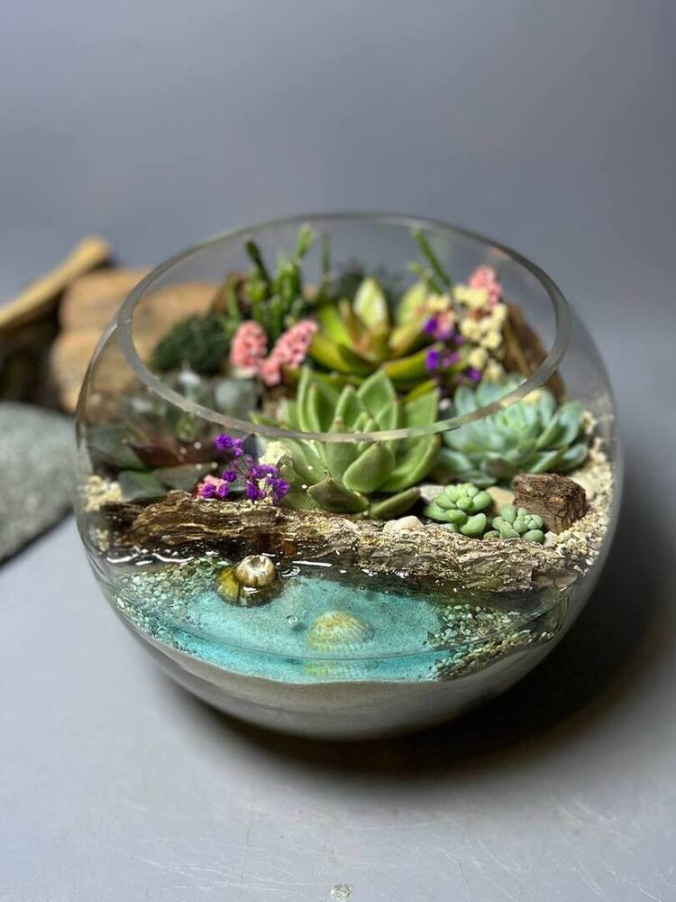 - Пакет № 7 Создание флорариума с суккулентами в круглой форме, диаметр 16 см с имитацией водоема.