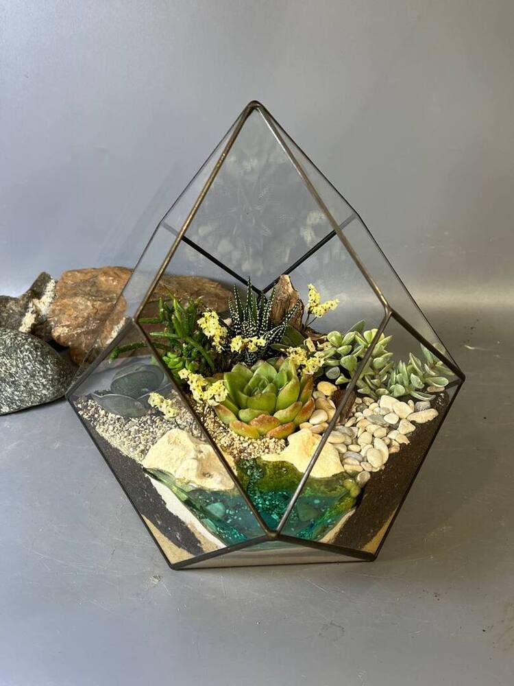 - Пакет № 8 Создание флорариума с суккулентами в форме Кристалл, высота 28 см с имитацией водоема.