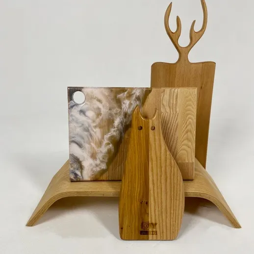 Процесс. Распил на круглопильных станках, фрезерование, работа со шлифовальным инструментом, работа с электро-лобзиком, присадка и сверление, использование столярных приспособлений. Декоративное покрытие эпоксидной смолой в индивидуальном дизайне.