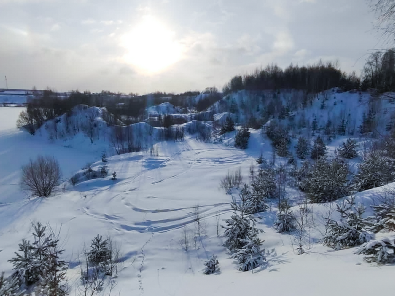 - Катание на снегоходе по лесу с инструктором, который движется впереди на своем снегоходе и показывает путь