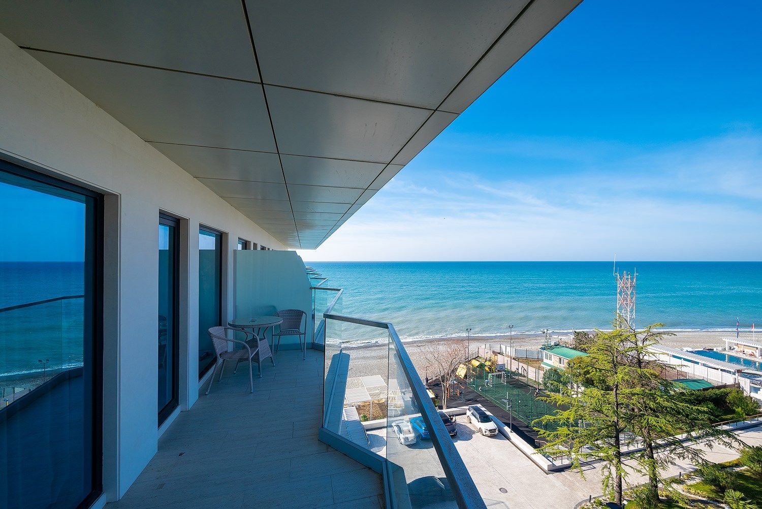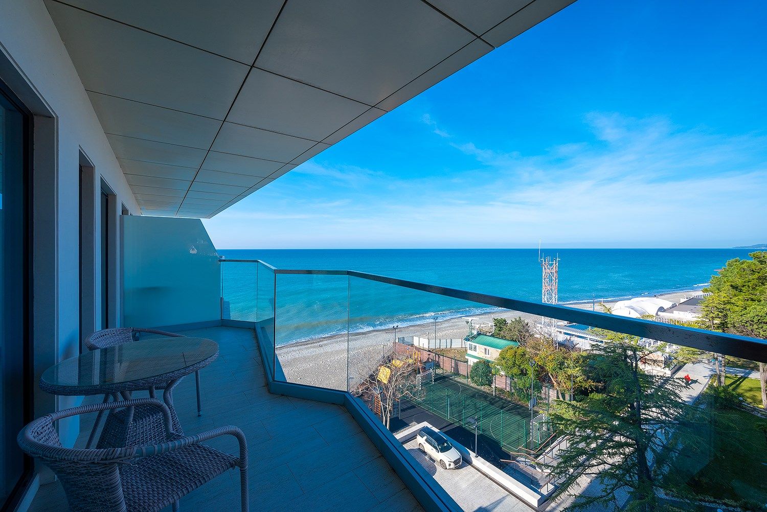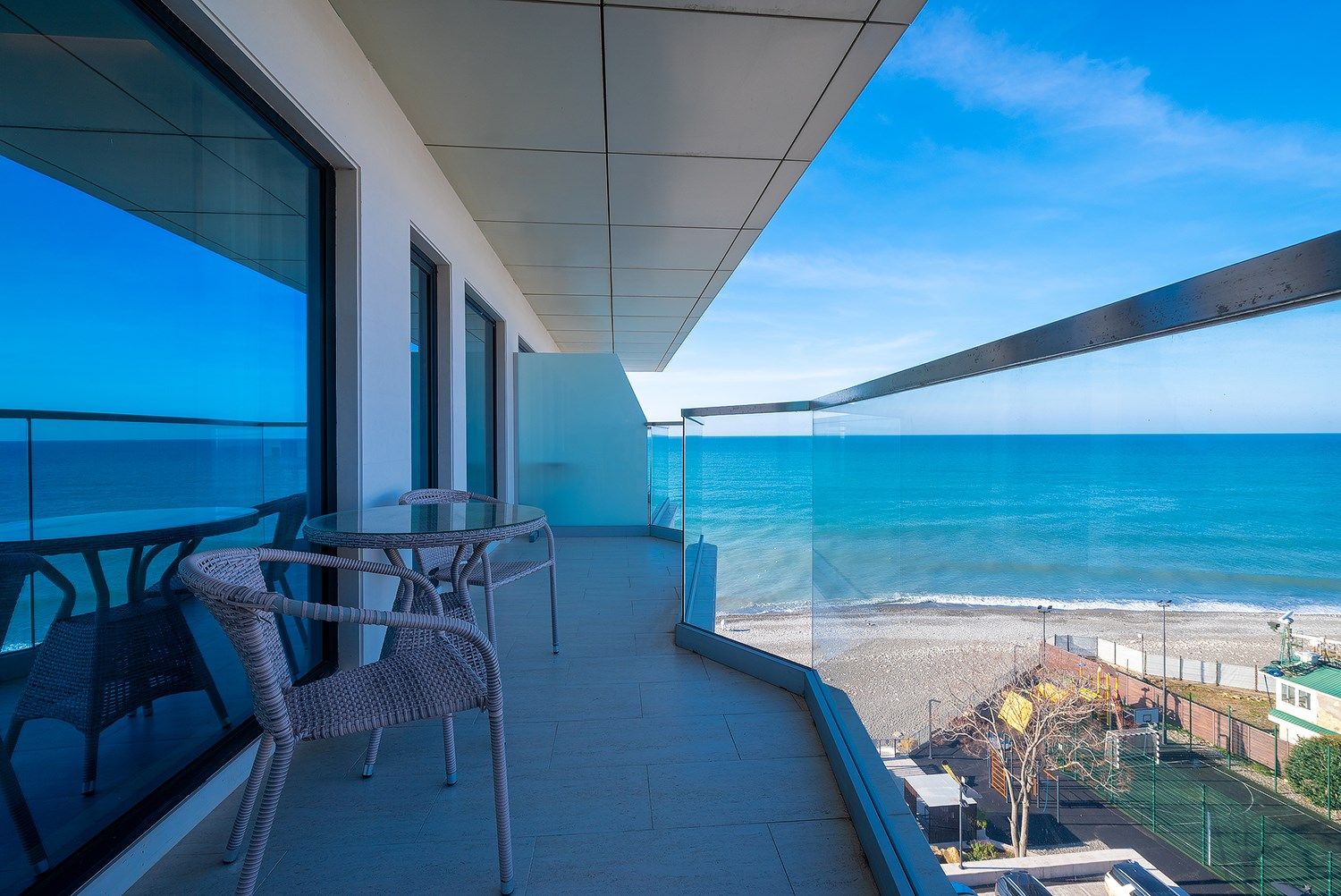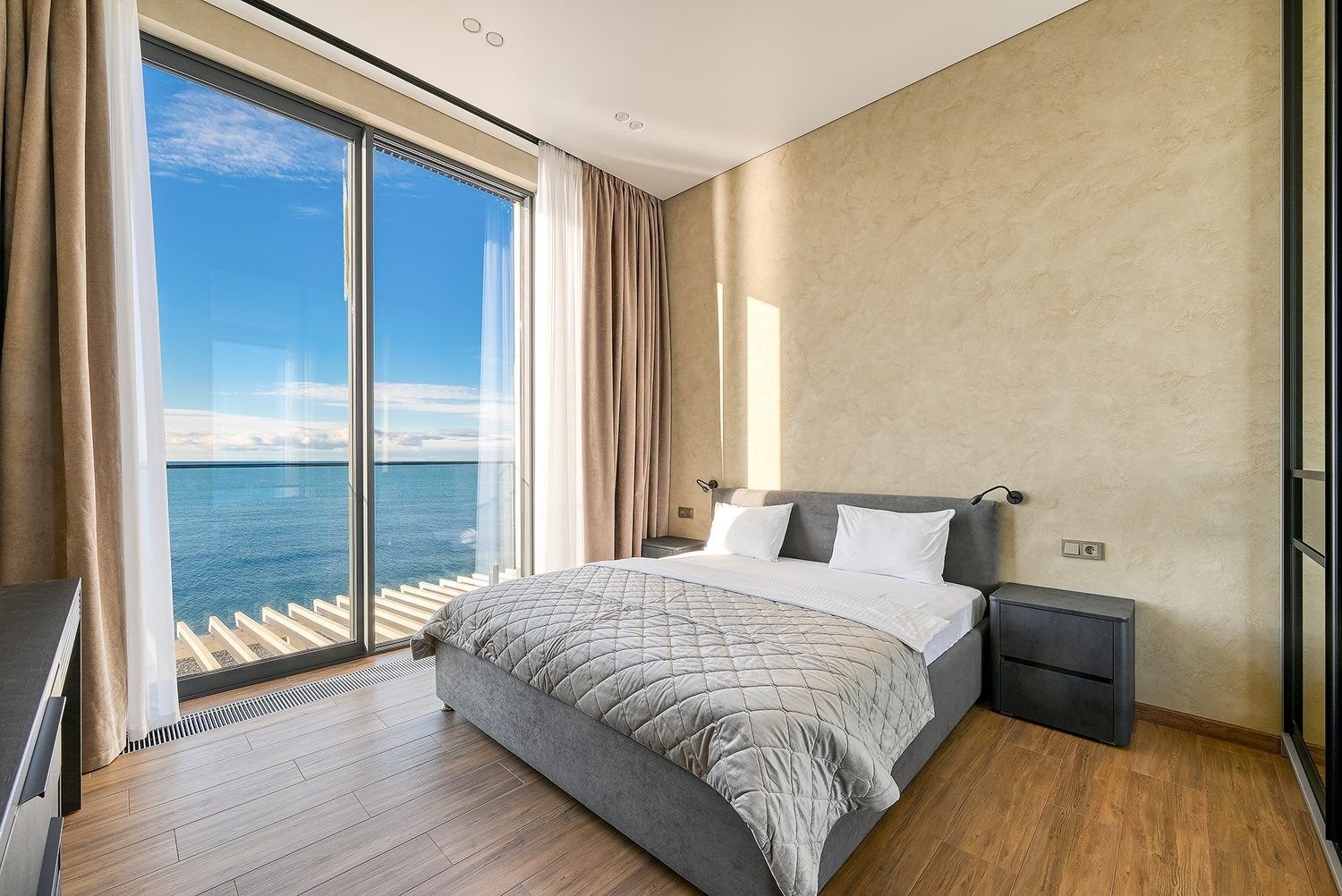 Номер располагает панорамные окна, с которых открывается панорамным прямой вид на море, так же в номере есть гардеробная, две спальни и кухня гостинная. Высота потолков в номере 3.5 метра.
