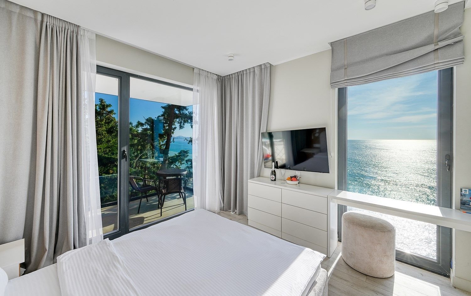 Гранд Делюкс с видом на море - самый просторный номер в отеле для размещения большой семьей. В к услугам гостей уютная гостиная, обеденная зона с мини-кухней санузлом и двумя спальнями.