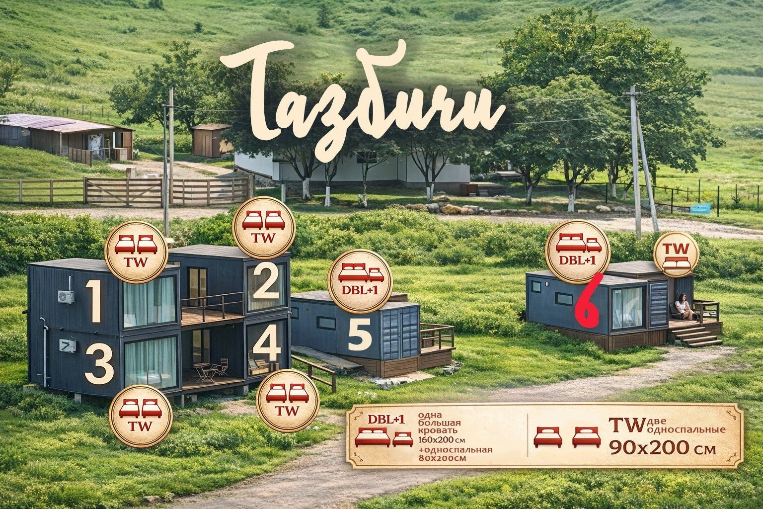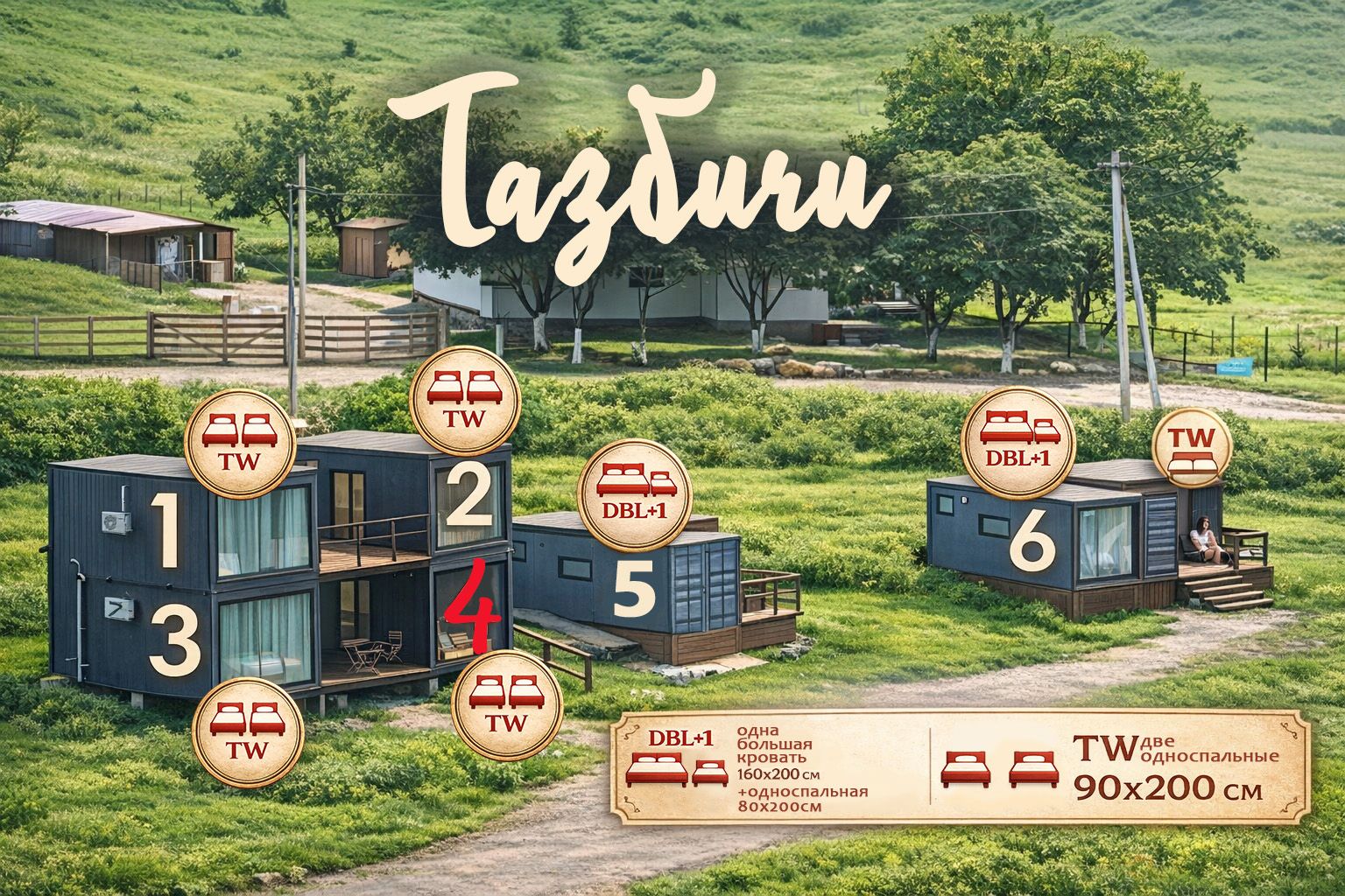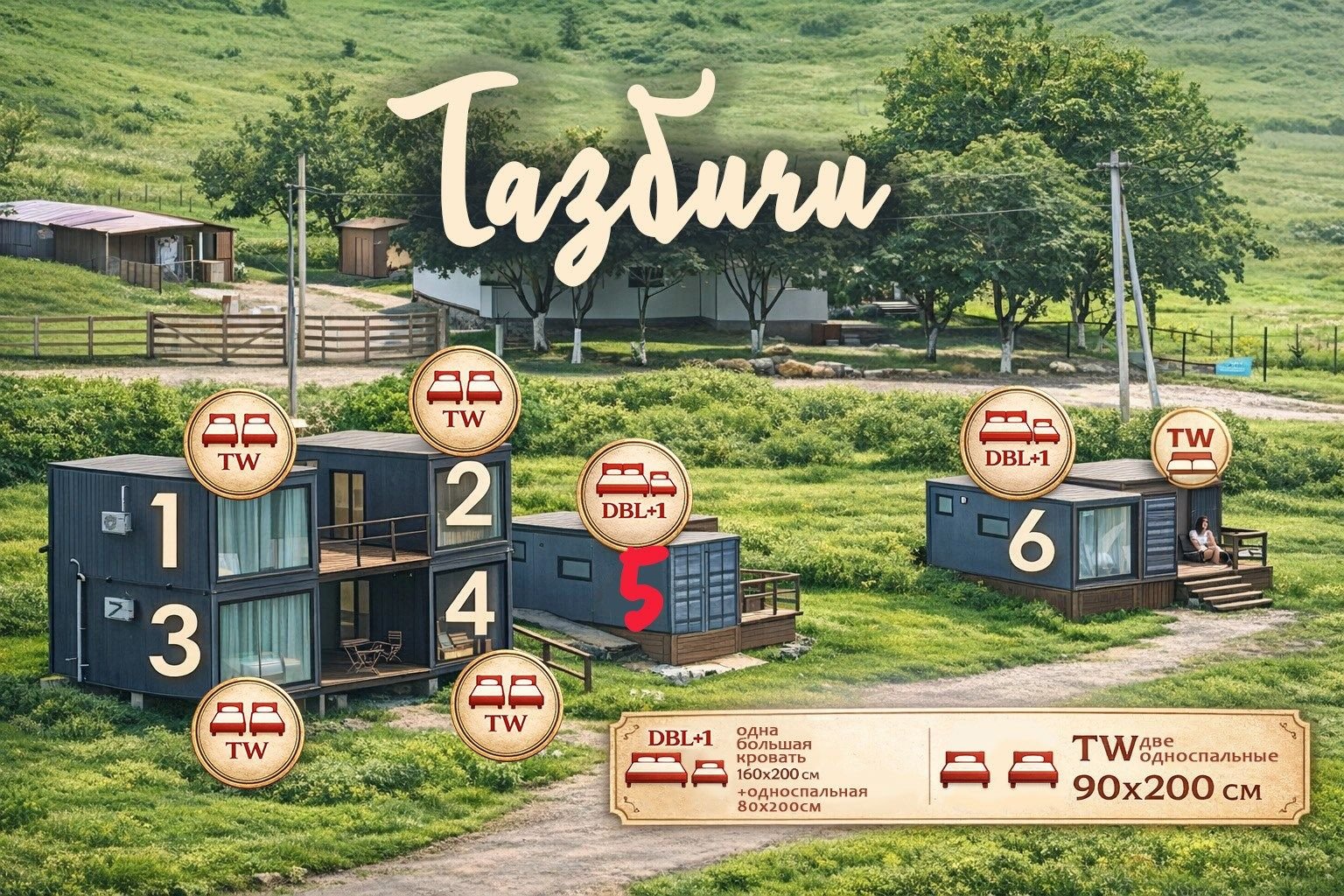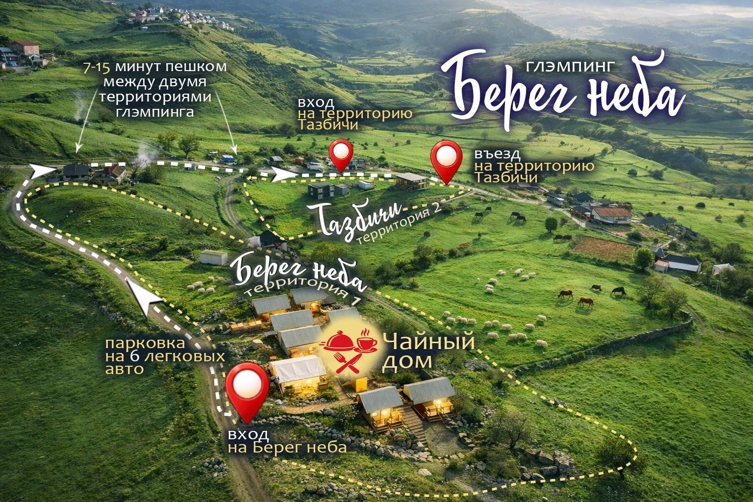 Номера «Тазбичи» расположены на второй территории глэмпинга «Берег неба» — в горном селе Тазбичи.