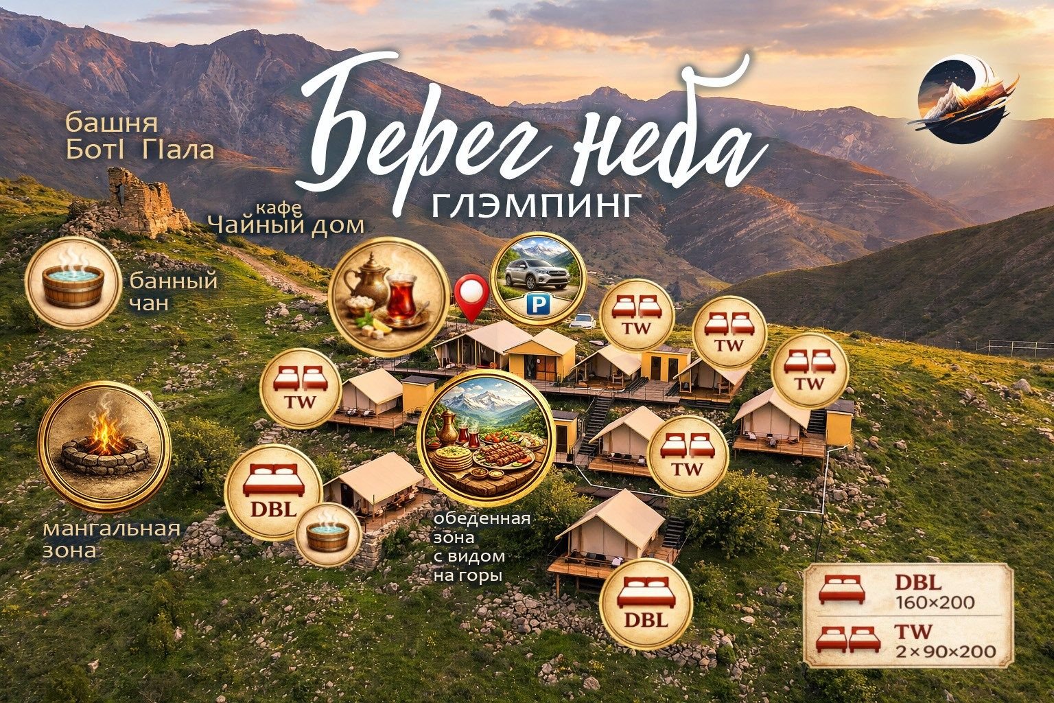 Глэмпинг "Берег Неба" - это уникальный объект, в уединении и с прекрасными видами, расположенный на руинах родовой крепости "Боти Г1ала" на вершине горы "Тичх дукъ". Концепция нашей базы для отдыха - это сочетание древней самобытности и современной эко-инфраструктуры, благодаря чему наши клиенты могут насладиться отдыхом на природе с современным комфортом.