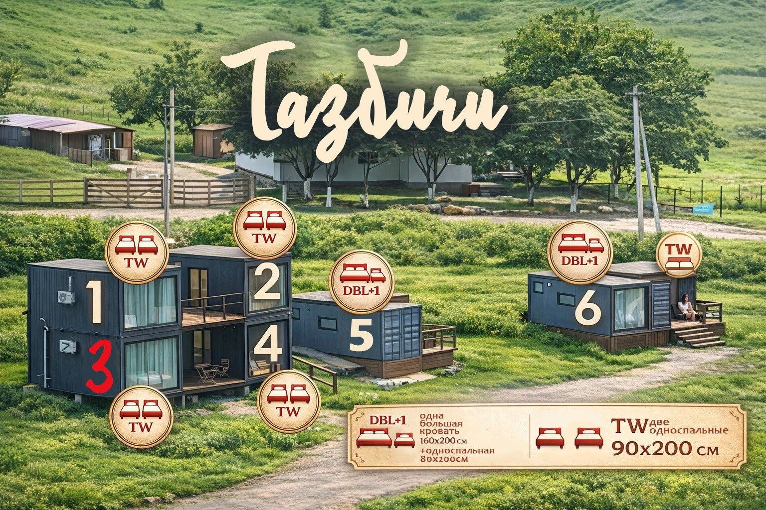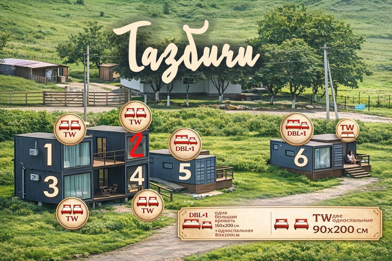 Мини-апартаменты находятся на второй территории глэмпинга «Берег неба» — в горном селе Тазбичи (схема территорий в галерее номера).