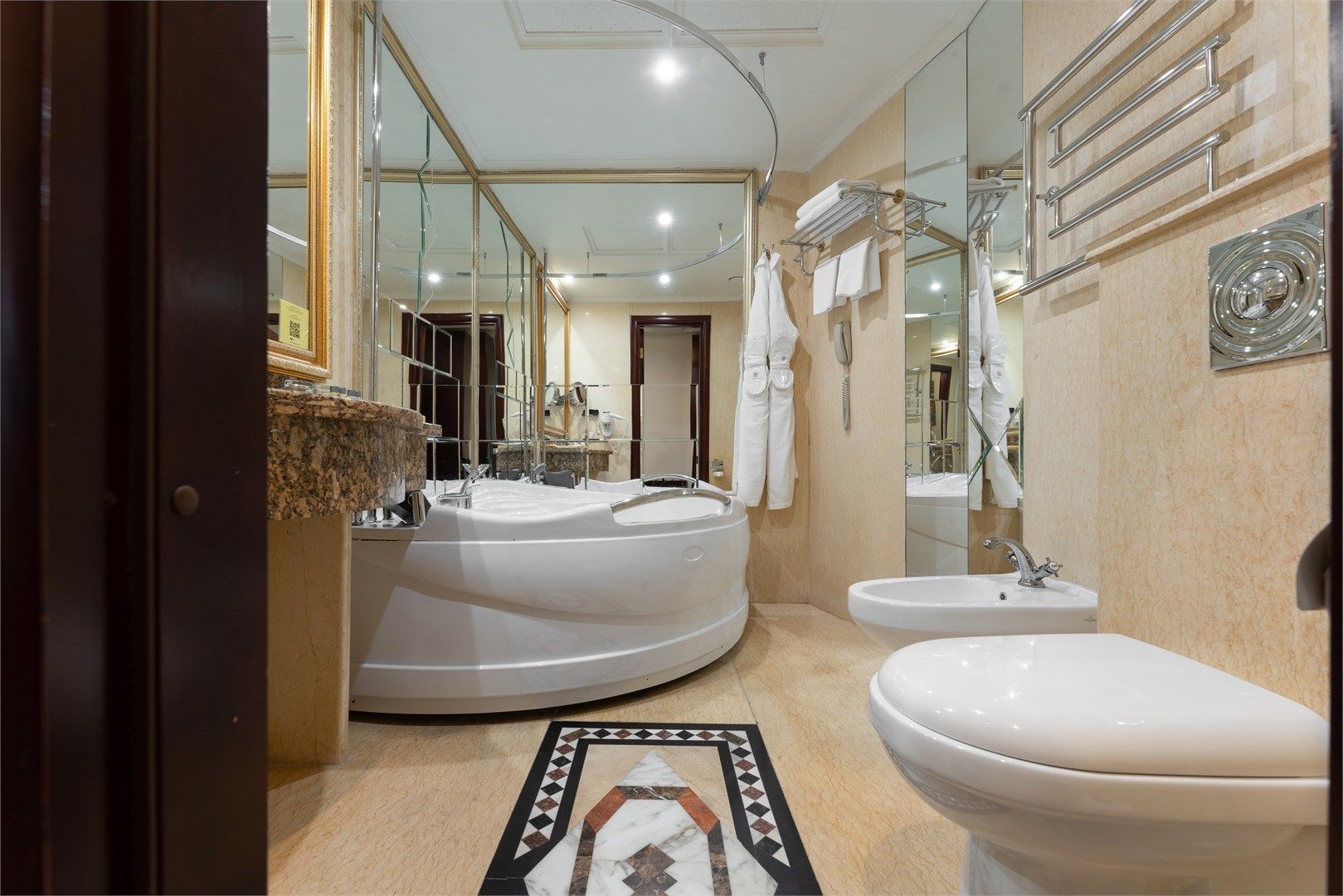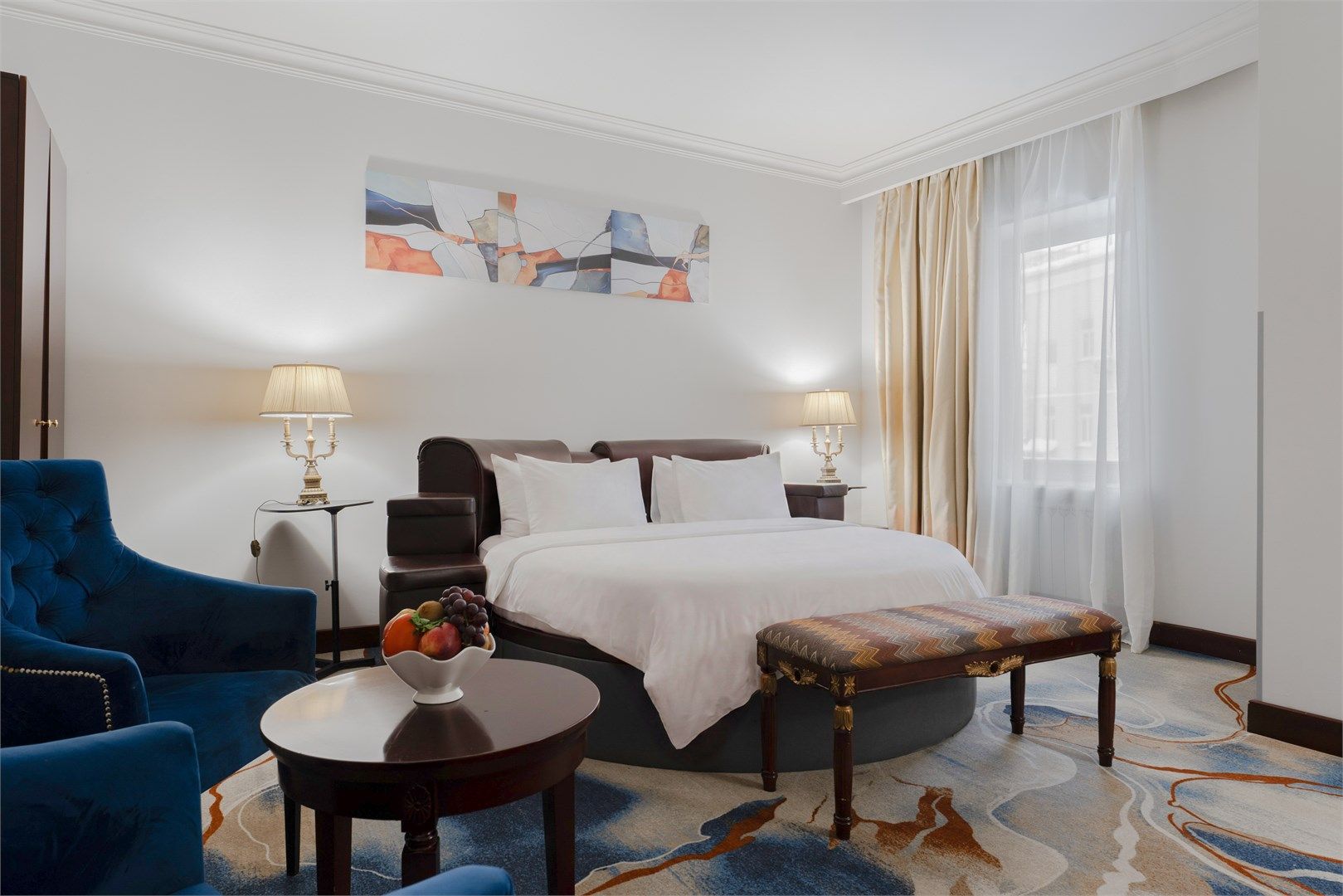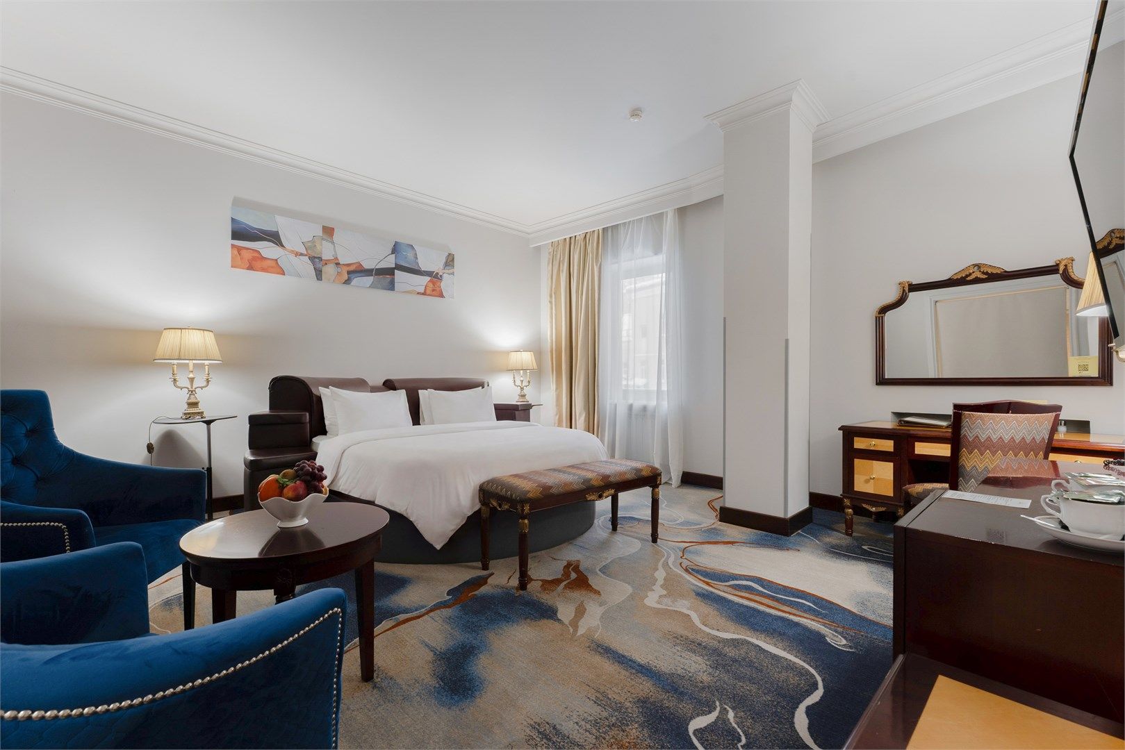 Насладитесь панорамным видом из великолепных номеров «Делюкс с балконом». В номере имеется спальня, гостиная зона, просторный рабочий стол, ванная комната с отделкой из итальянского мрамора с душевой кабиной либо ванной. Тип кровати: круглая....