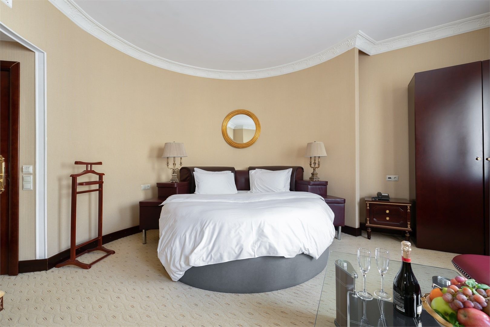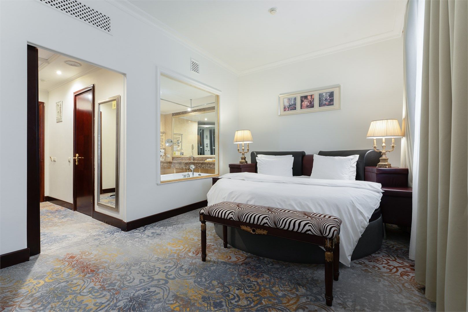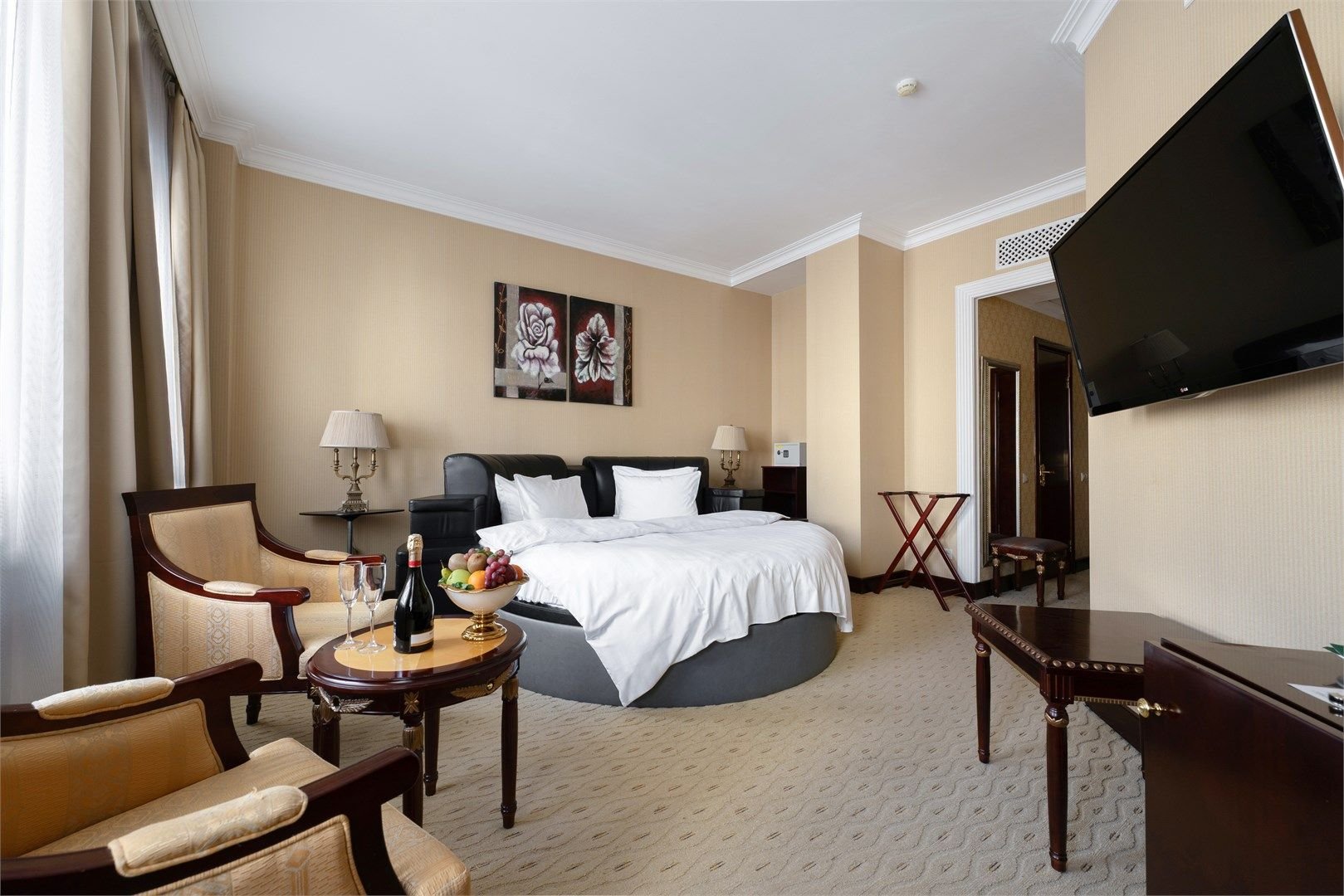 Большой, роскошный номер с индивидуальной сауной из натурального дерева. Удобное зонирование создает впечатление открытого, дышащего интерьера, где пространство буквально перетекает из одной зоны в другую. Роскошная мебель и изысканный текстиль – атрибуты настоящей частной резиденции. Тип кровати: круглая...