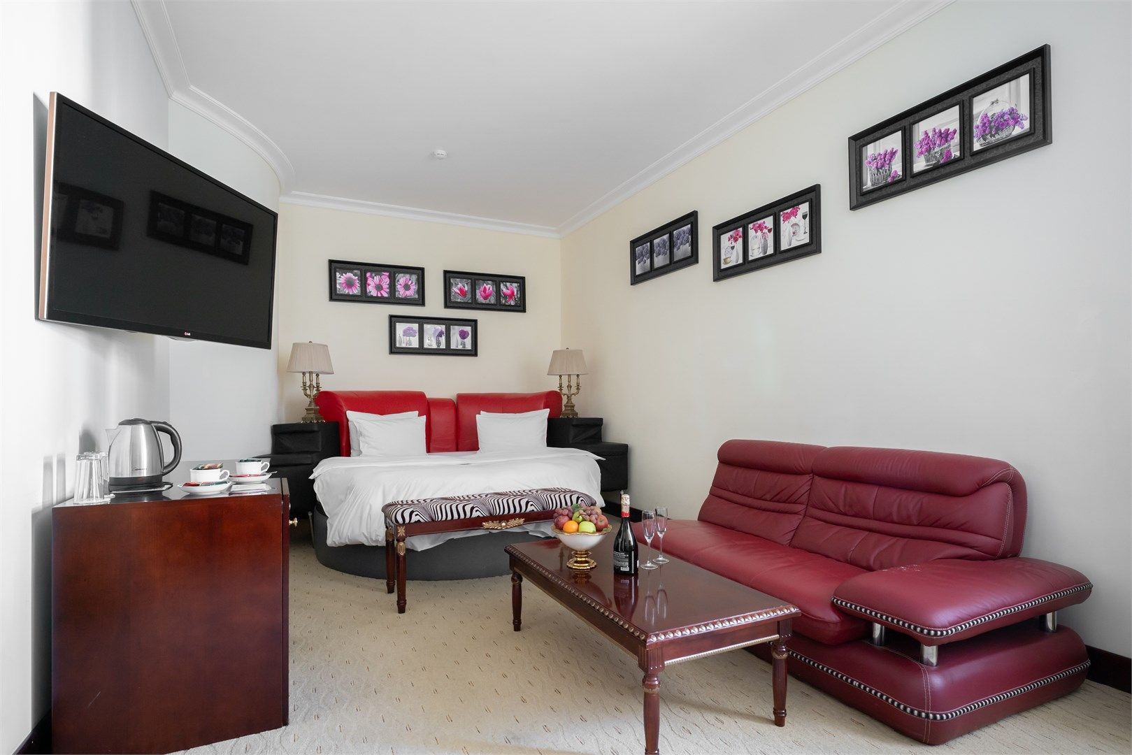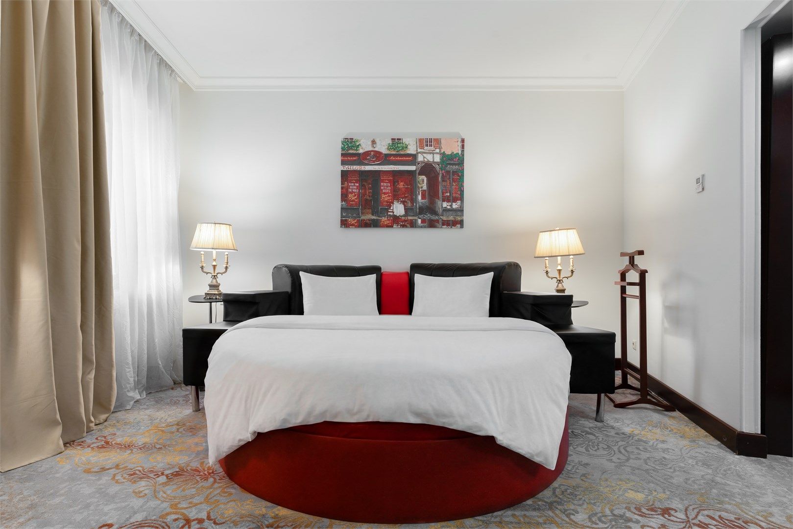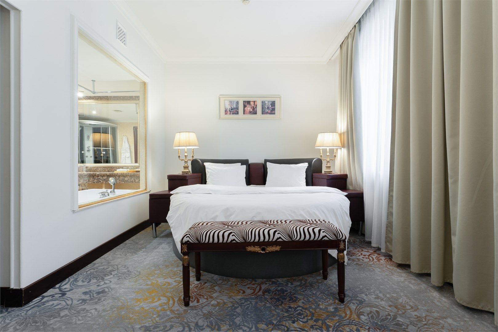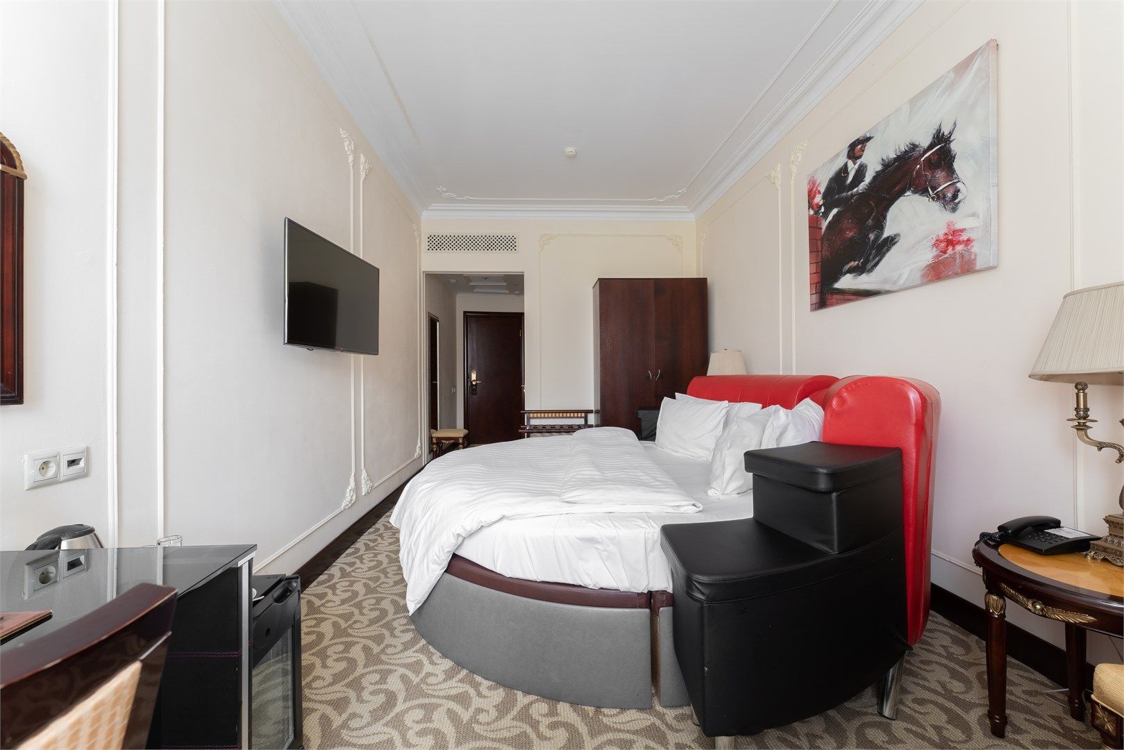 Большой, роскошный номер с индивидуальной сауной из натурального дерева. Удобное зонирование создает впечатление открытого, дышащего интерьера, где пространство буквально перетекает из одной зоны в другую. Роскошная мебель и изысканный текстиль – атрибуты настоящей частной резиденции. Тип кровати: круглая...