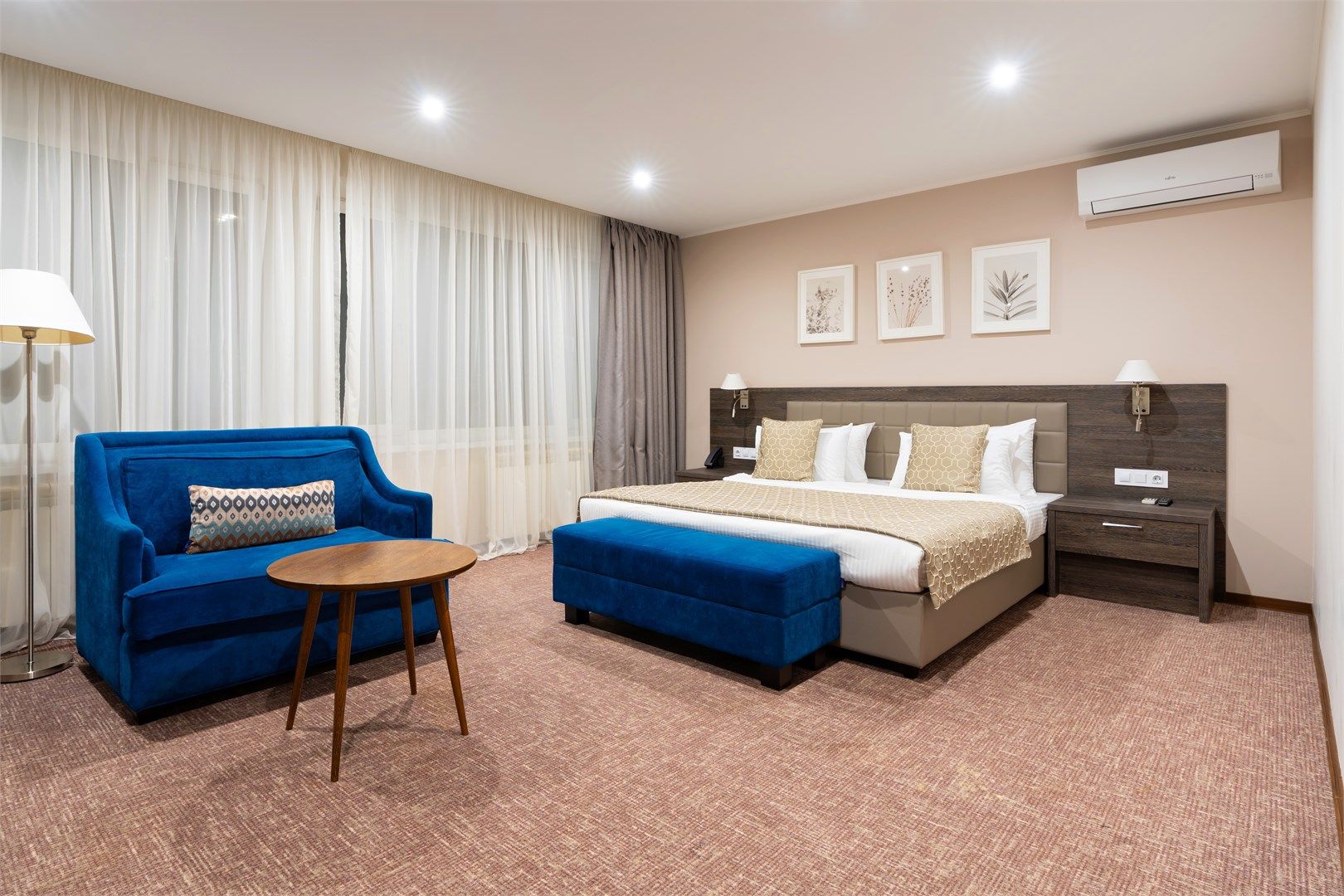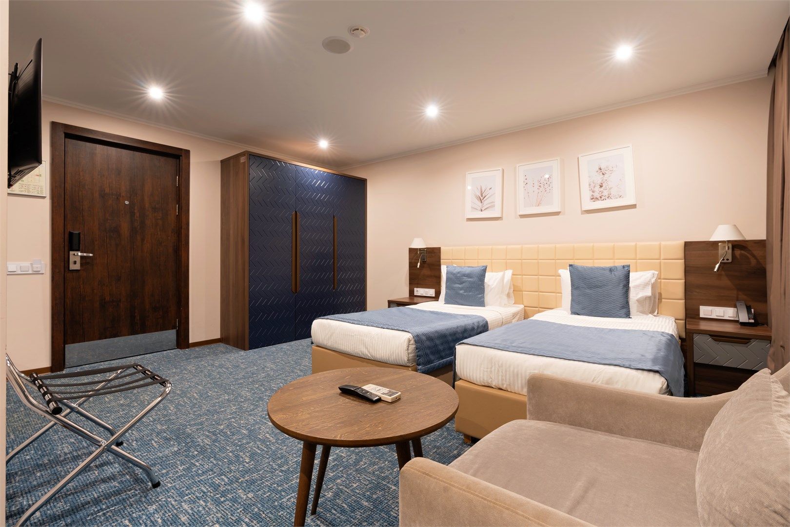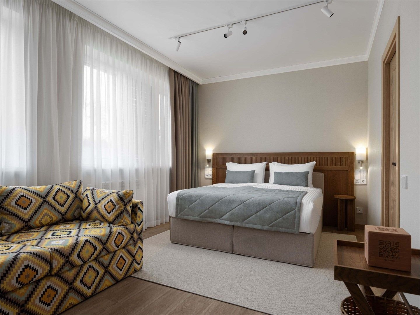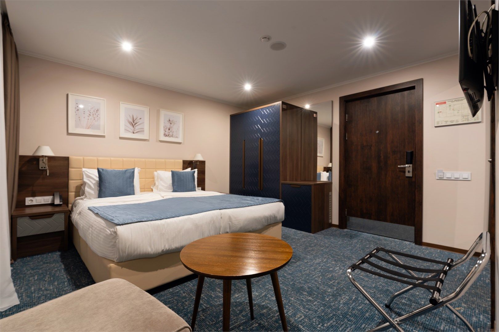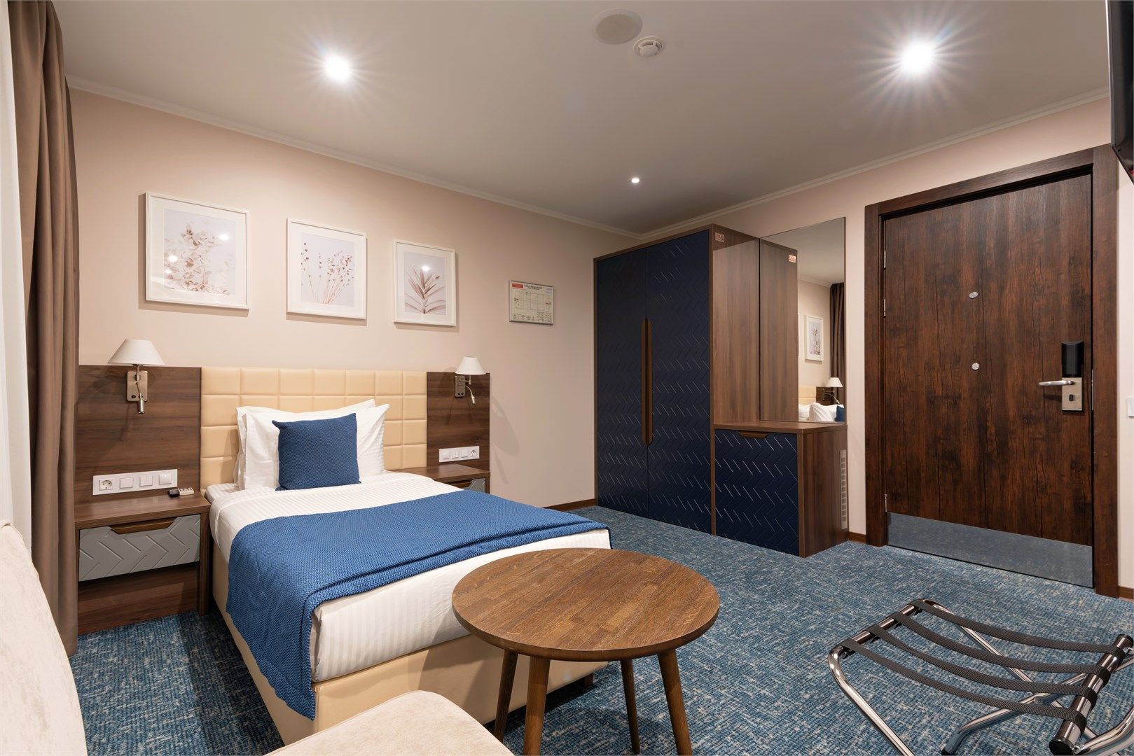 Уютный функциональный номер, оформленный в естественных природных оттенках с теплыми песочными текстурами и мягкими переливами. Пространство идеально сочетает комфорт и функциональность, создавая атмосферу для полноценного отдыха.