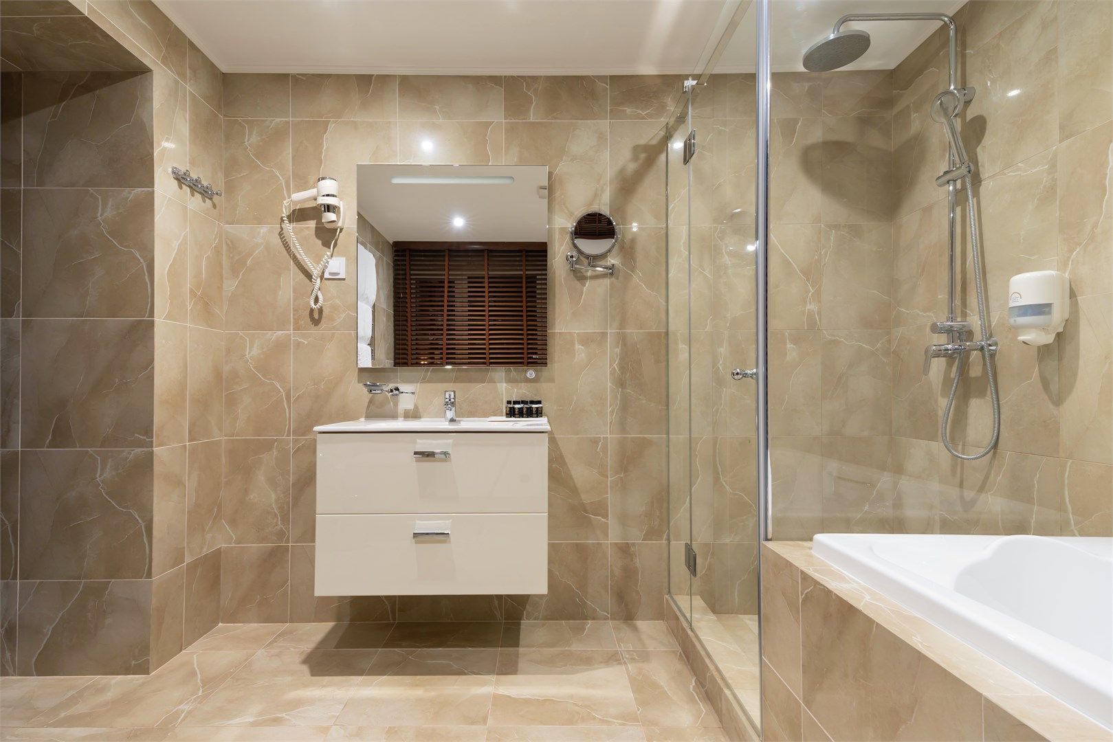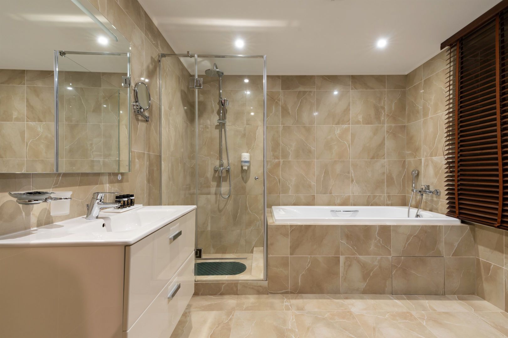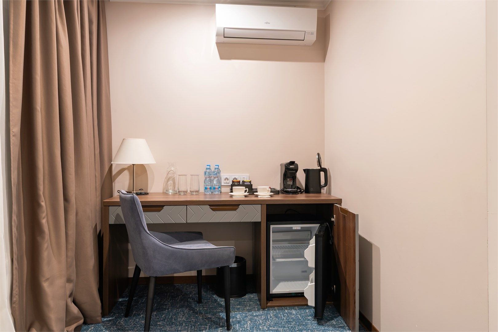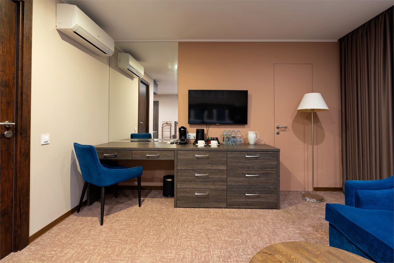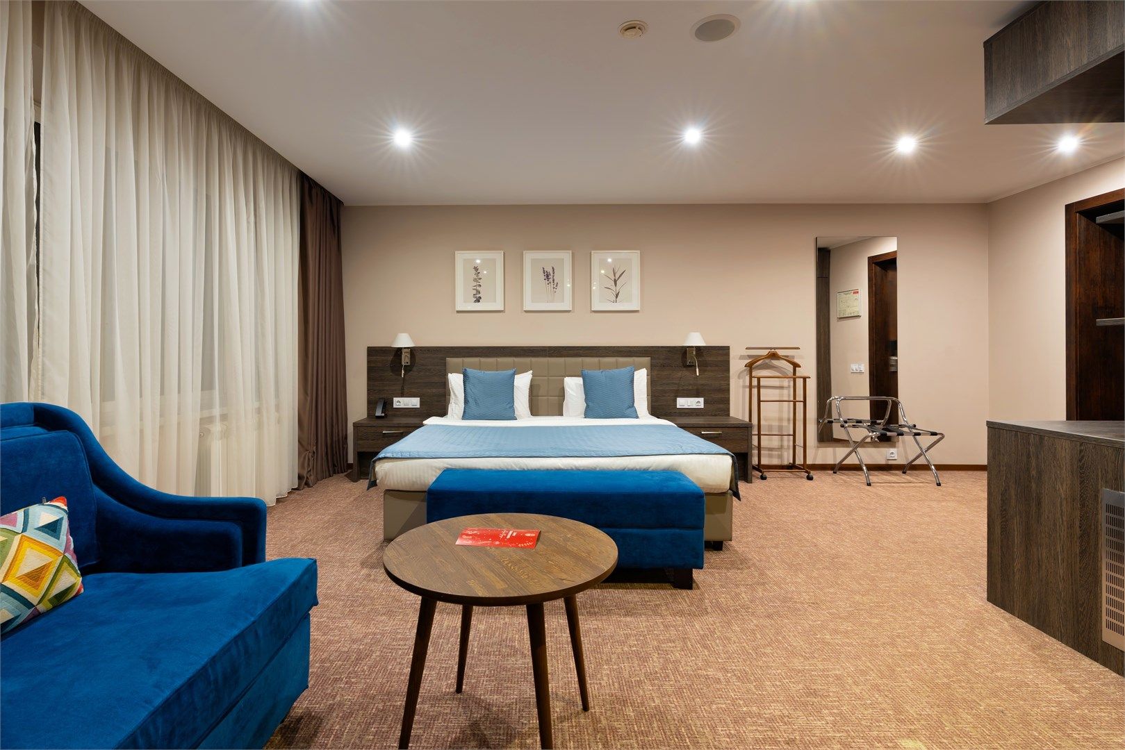 Уютный функциональный номер, оформленный в естественных природных оттенках с теплыми песочными текстурами и мягкими переливами. Пространство идеально сочетает комфорт и функциональность, создавая атмосферу для полноценного отдыха.