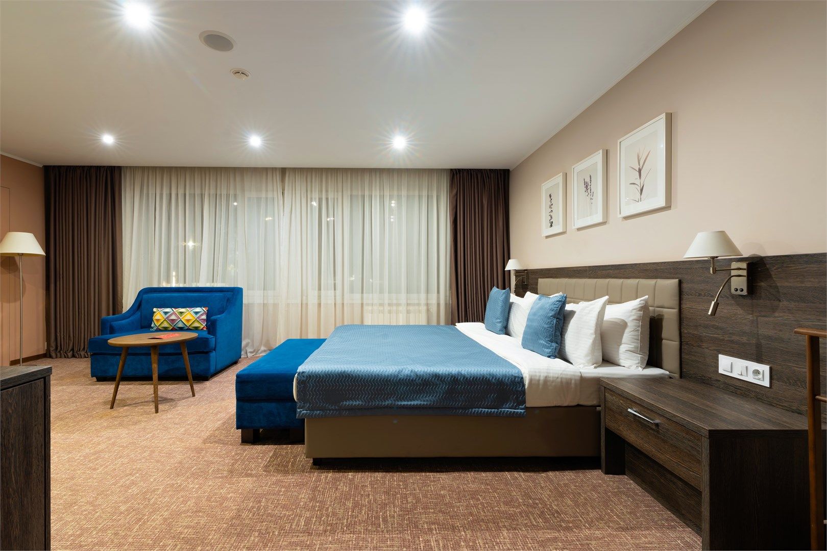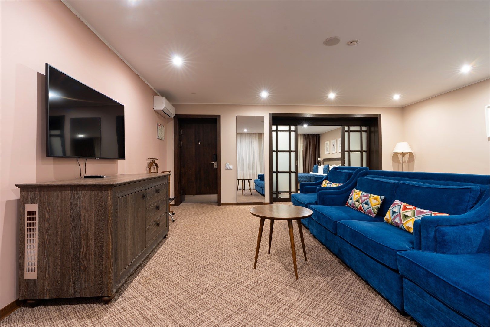 Интерьер номера сочетает атмосферу домашнего уюта с функциональностью и комфортом премиального уровня. Пространство зонировано на отдельную спальню и уютную гостиную.