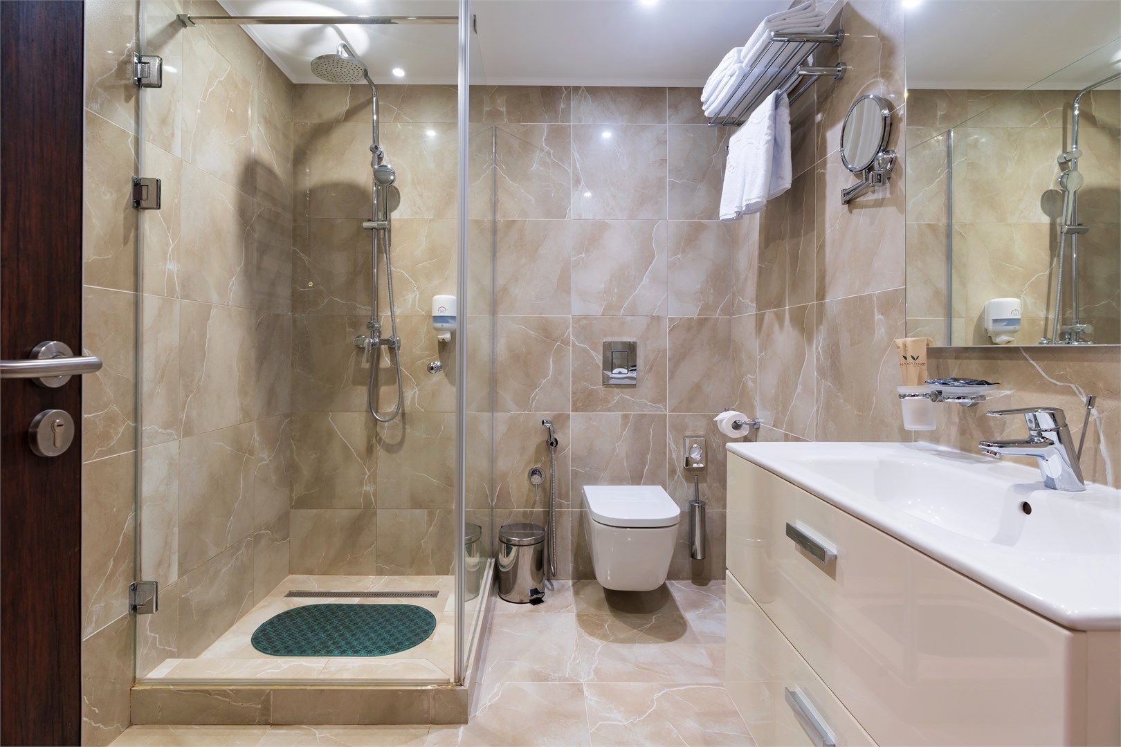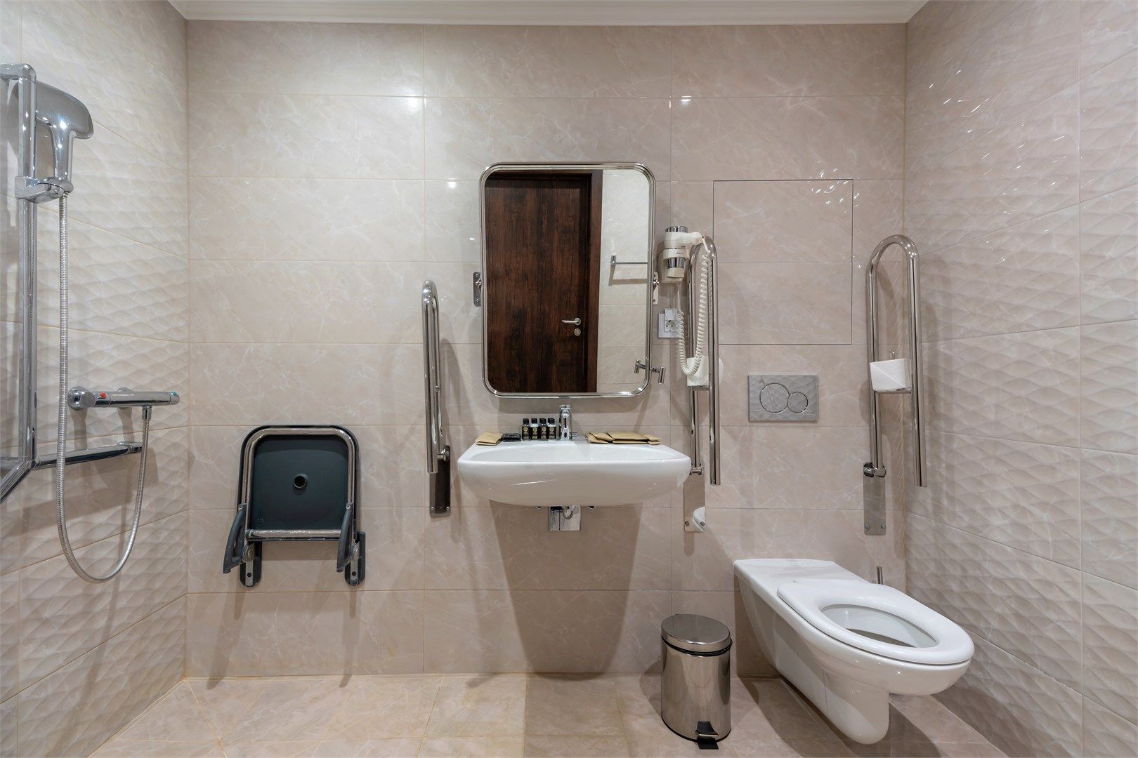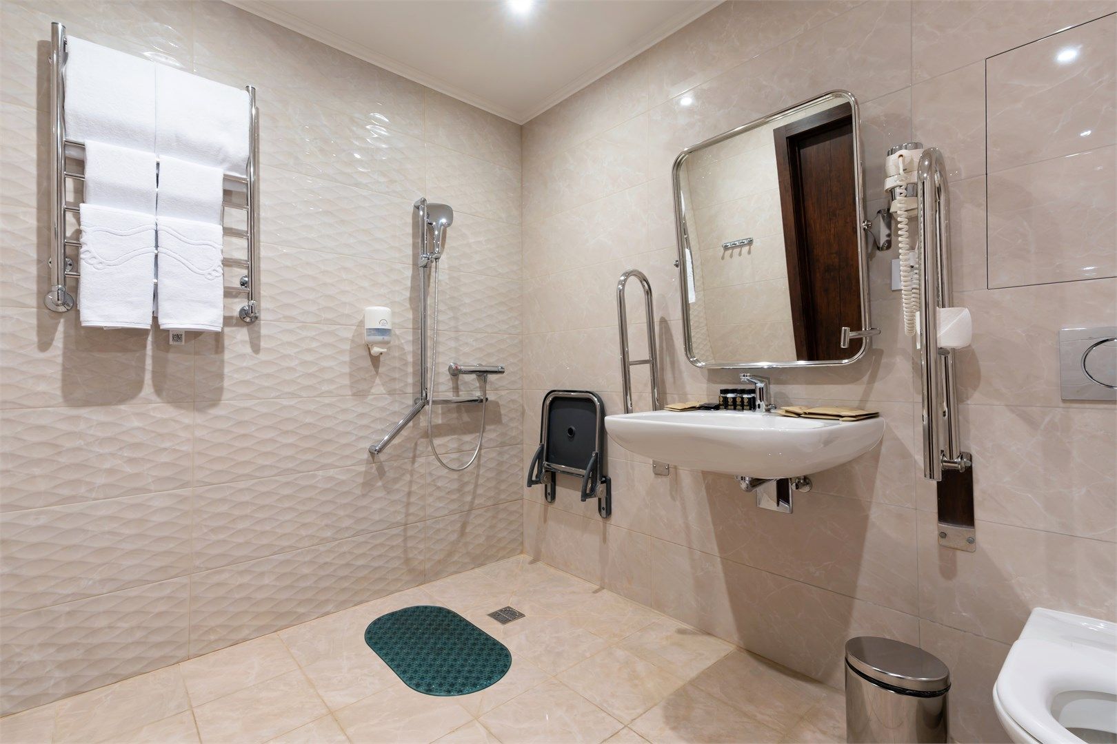 Пространство продумано до мелочей: широкие проходы обеспечивают легкость перемещения, а эргономичная мебель и современная сантехника учитывают потребности гостей с ограниченными возможностями. Каждая деталь интерьера направлена на то, чтобы сделать пребывание максимально удобным и безопасным....