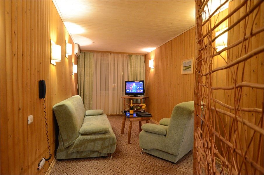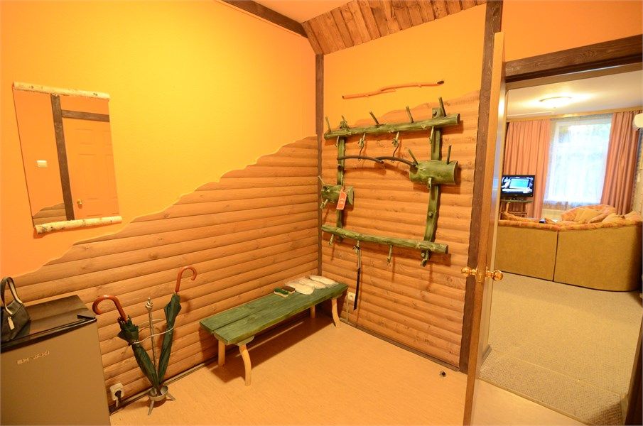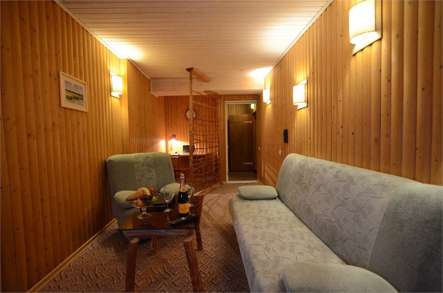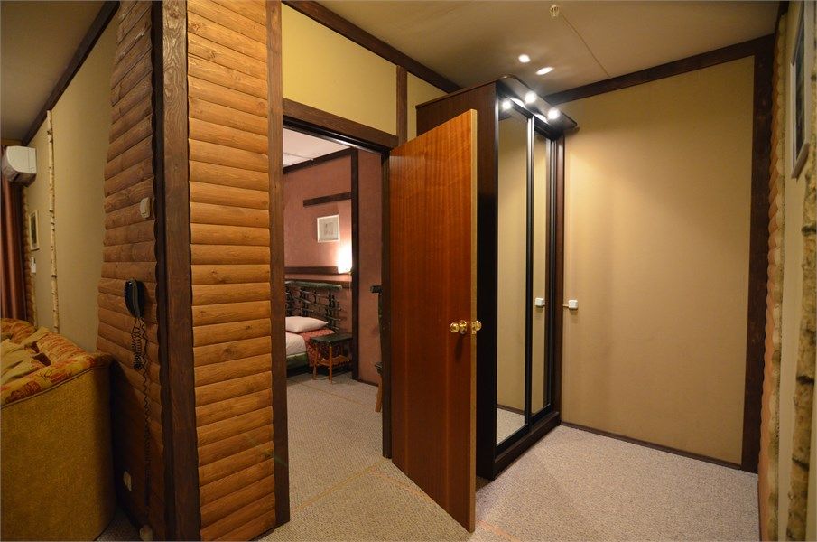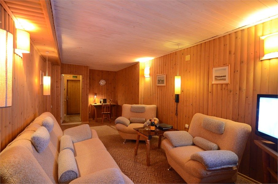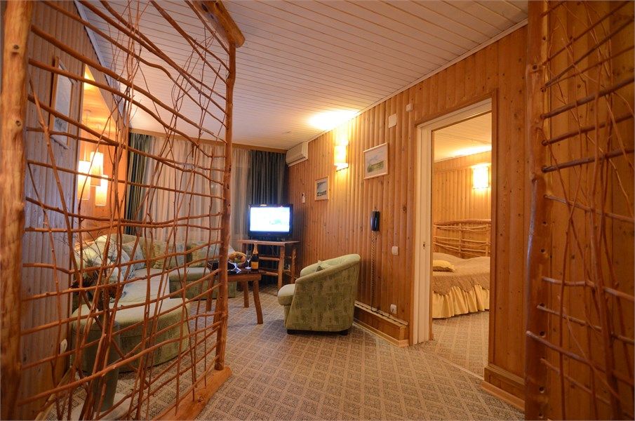 Двухкомнатный номер с кухней, площадью от 55 до 70 кв. м. Интерьер выполнен в деревенском стиле. В номере: прихожая, гостиная с выделенными зонами для отдыха (мягкий раскладывающийся двуспальный диван и кресла) и работы (кабинет с письменным столом), спальня с двуспальной кроватью "King size", оборудованная кухня с обеденной зоной, раздельный санузел с душевой кабиной, фен, мини-бар, кондицион...