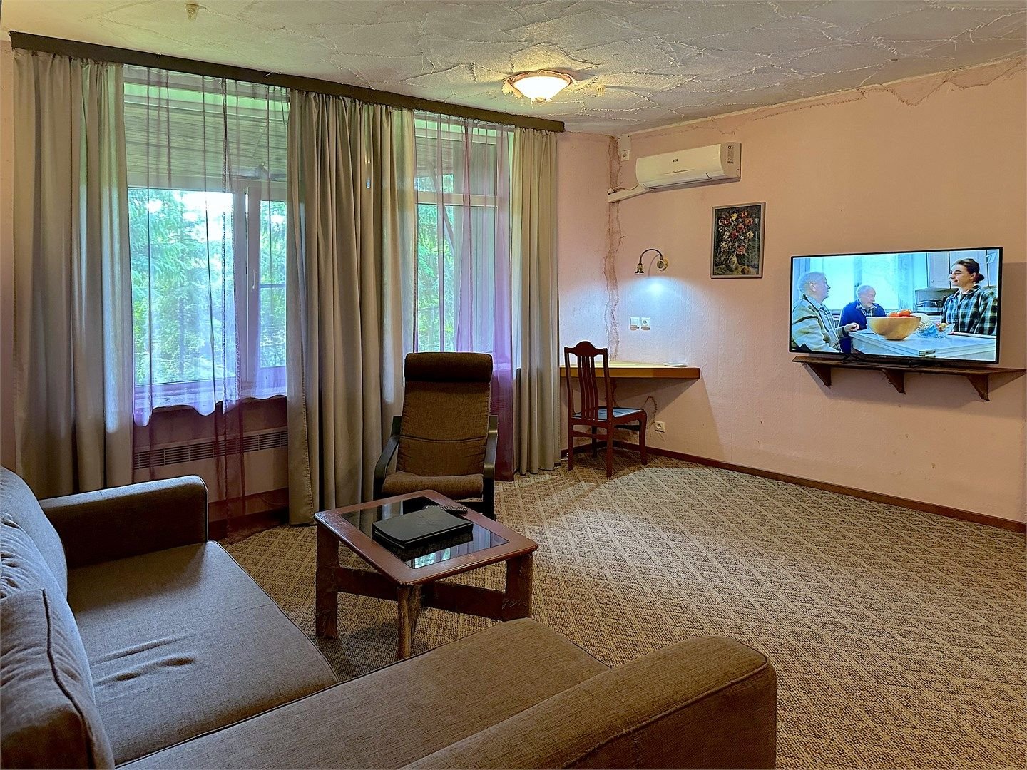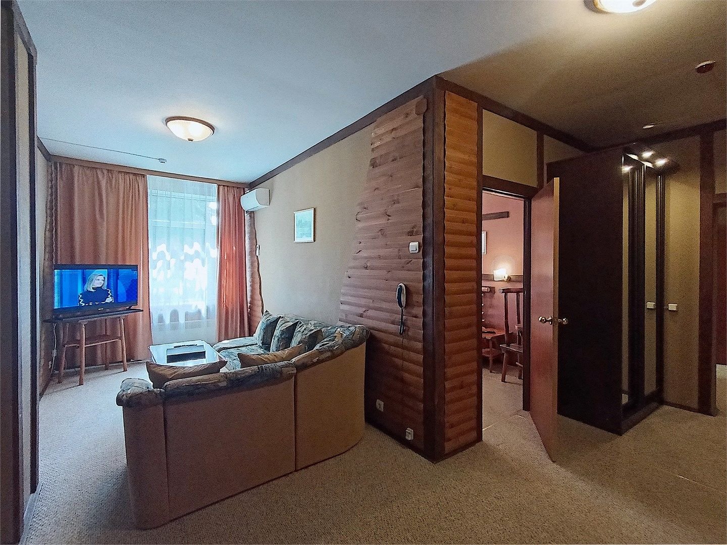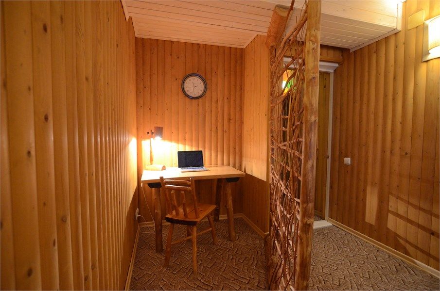 Двухкомнатный номер с кухней, площадью от 55 до 70 кв. м. Интерьер выполнен в деревенском стиле. В номере: прихожая, гостиная с выделенными зонами для отдыха (мягкий раскладывающийся двуспальный диван и кресла) и работы (кабинет с письменным столом), спальня с двуспальной кроватью "King size", оборудованная кухня с обеденной зоной, раздельный санузел с душевой кабиной, фен, мини-бар, кондицион...