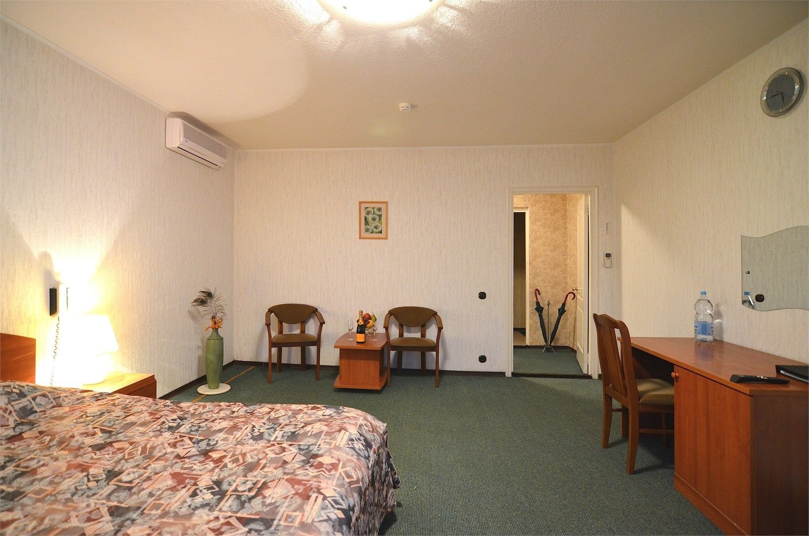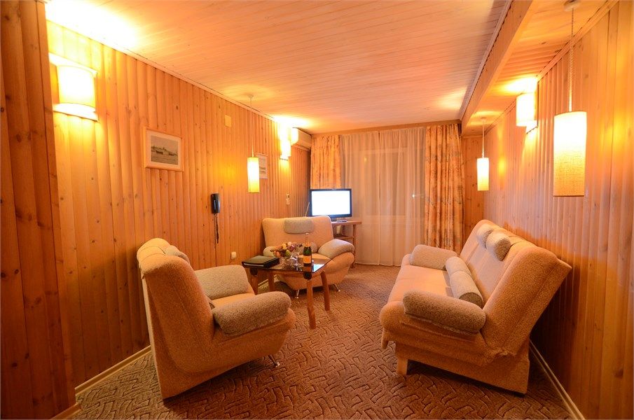 Двухкомнатный жилой номер площадью от 55 кв.м. Эксклюзивный дизайн номера. В номере: большая прихожая, гостиная (угловой мягкий раскладывающийся двуспальный диван, журнальный столик и кресла), спальня с двумя односпальными кроватями или большой двуспальной кроватью и мини-кабинетом, раздельный санузел с душевой кабиной, ЖК-телевизор и кондиционер в каждой комнате, мини-бар, холодильни...