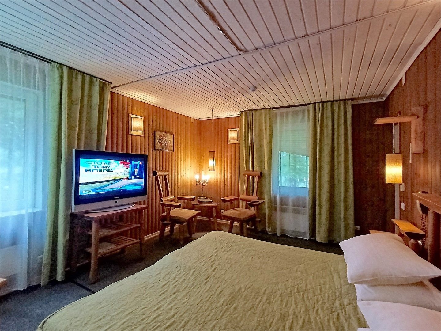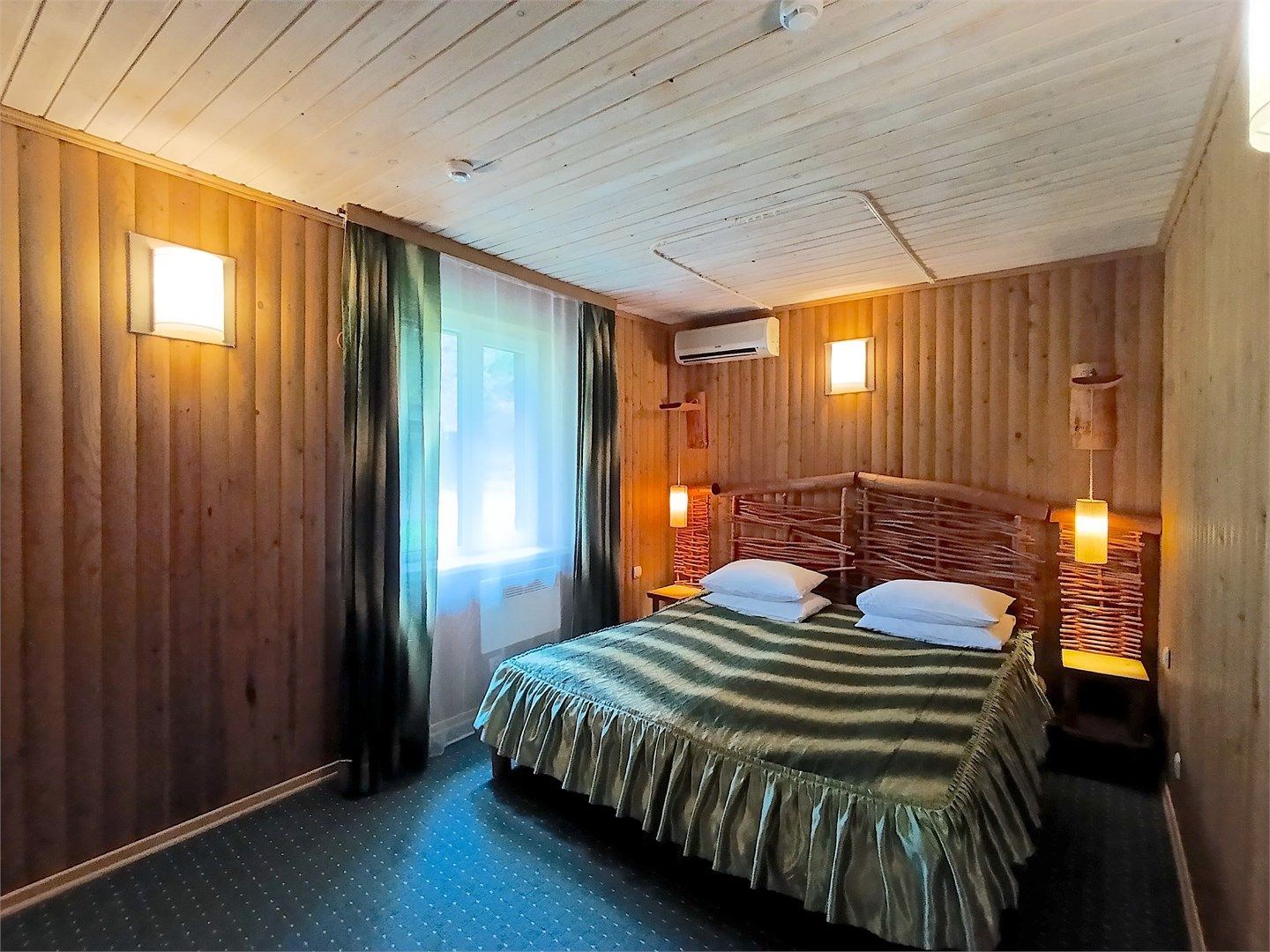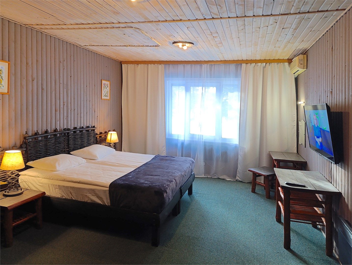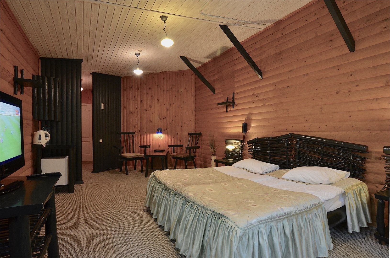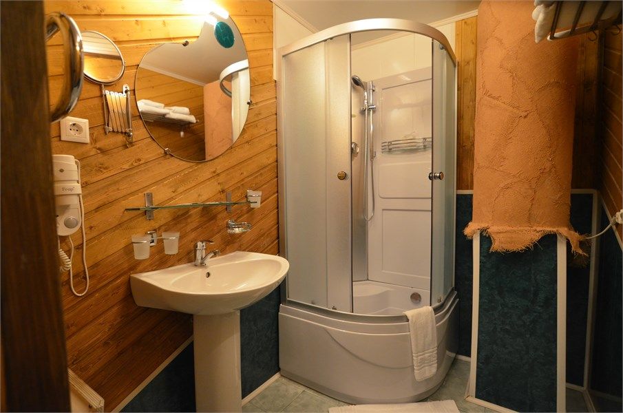 Однокомнатный отдельно стоящий коттедж площадью 45 кв.м. Внутреннее оформление коттеджа выполнено в деревенском стиле. В коттедже: прихожая, комната с двумя раздельными односпальными кроватями, журнальным столиком с креслами, санузел с душевой кабиной, кондиционер, большой ЖК телевизор, кондиционер, мини-бар, холодильник, фен, электрочайник, бесплатный WI-FI, телефон. Для каждого гос...
