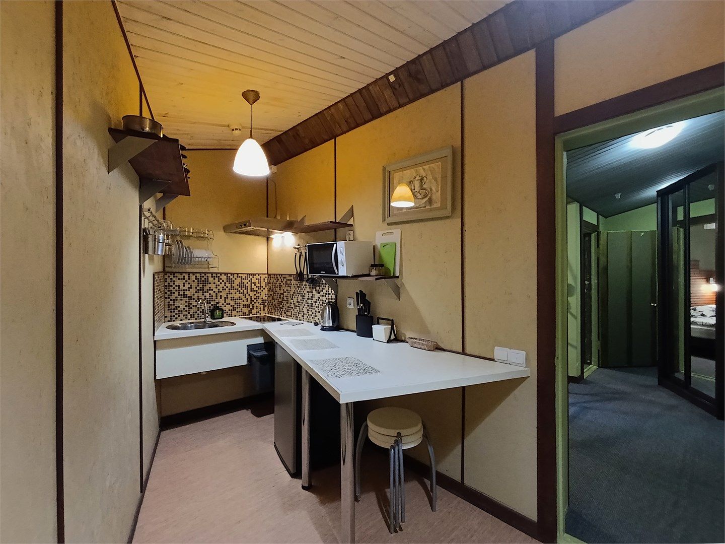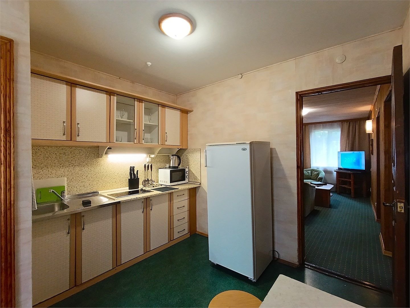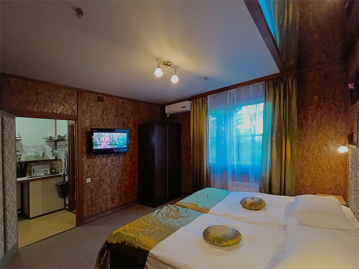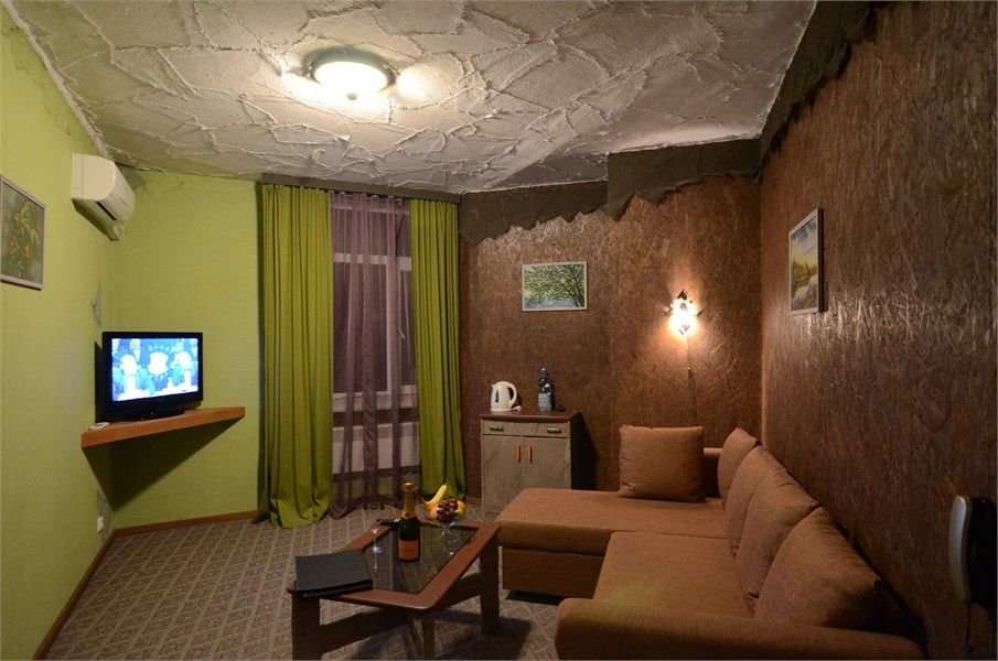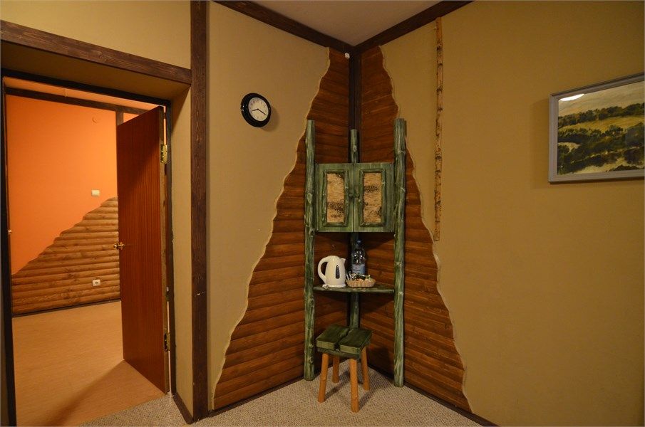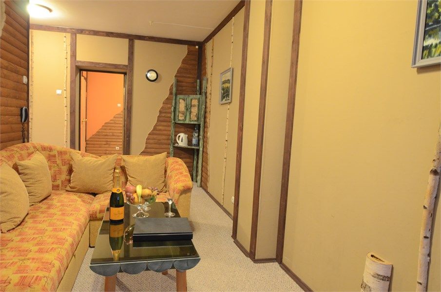 Однокомнатный жилой номер с кухней. Площадь номера свыше 45 кв.м. Интерьер номера выполнен в деревенском стиле. Номер имеет отдельный вход с улицы. В номере: прихожая, комната с кроватью "King size", журнальным столиком с креслами, санузел с душевой кабиной, большой ЖК телевизор, кондиционер, мини-бар, холодильник, фен, оборудованная кухня, бесплатный WI-FI, телефон. Для каждого гостя в номе...