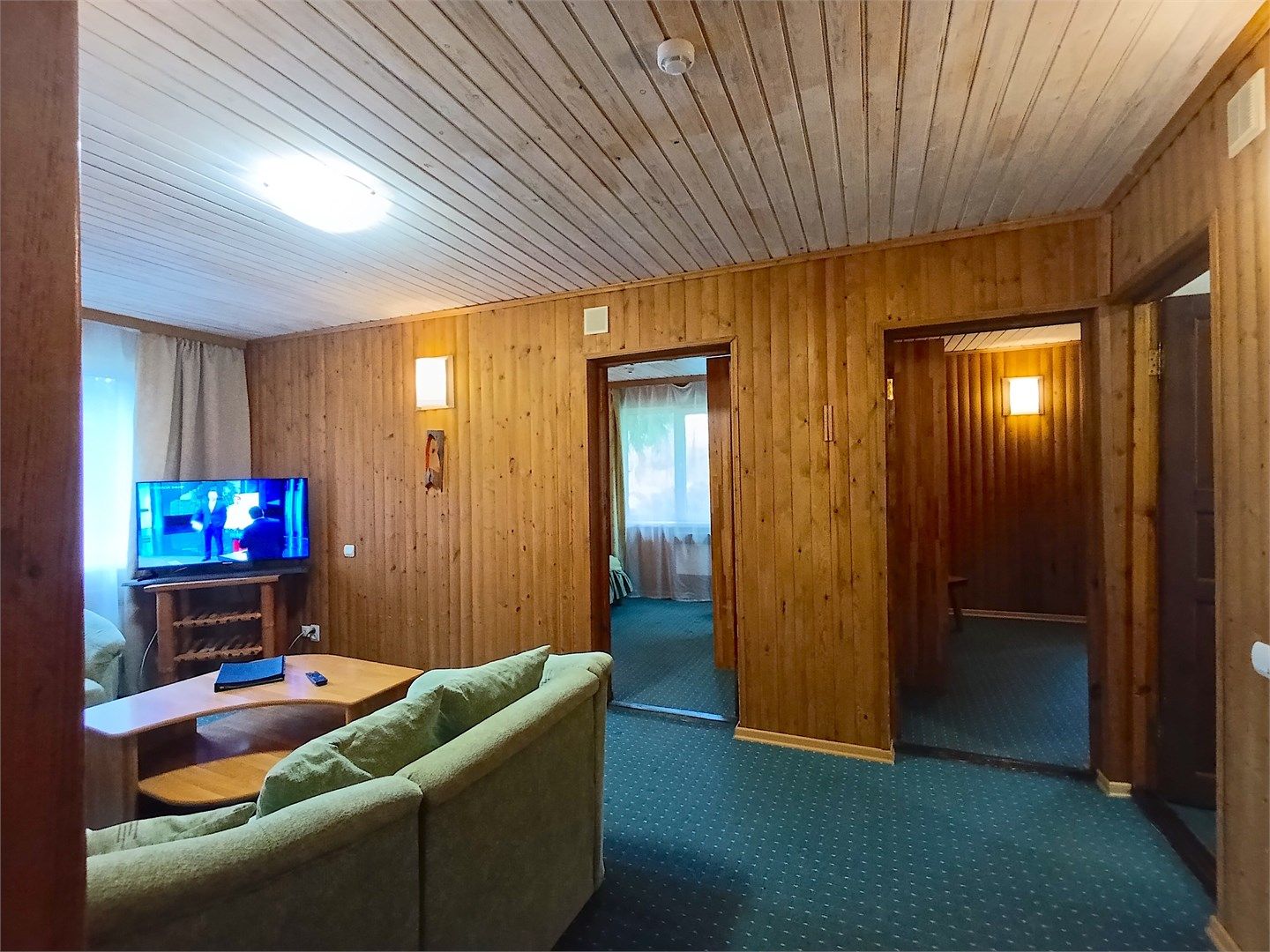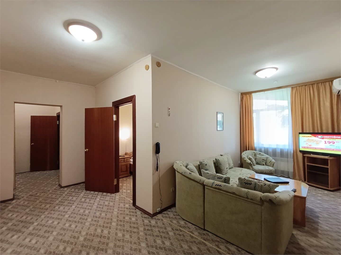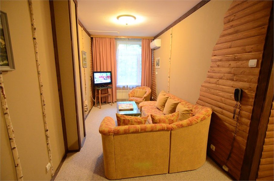 Трехкомнатный номер повышенной комфортности, площадью от 65 кв. м., оформленный в оригинальном стиле. Номер вполне соответствует полноценной трехкомнатной квартире. В номере: прихожая, гостиная (угловой мягкий раскладывающийся диван, журнальный столик и кресла), две спальни с двумя раздельными односпальными кроватями, раздельный санузел с душевой кабиной, большой ЖК-телевизор, мини-бар, холод...