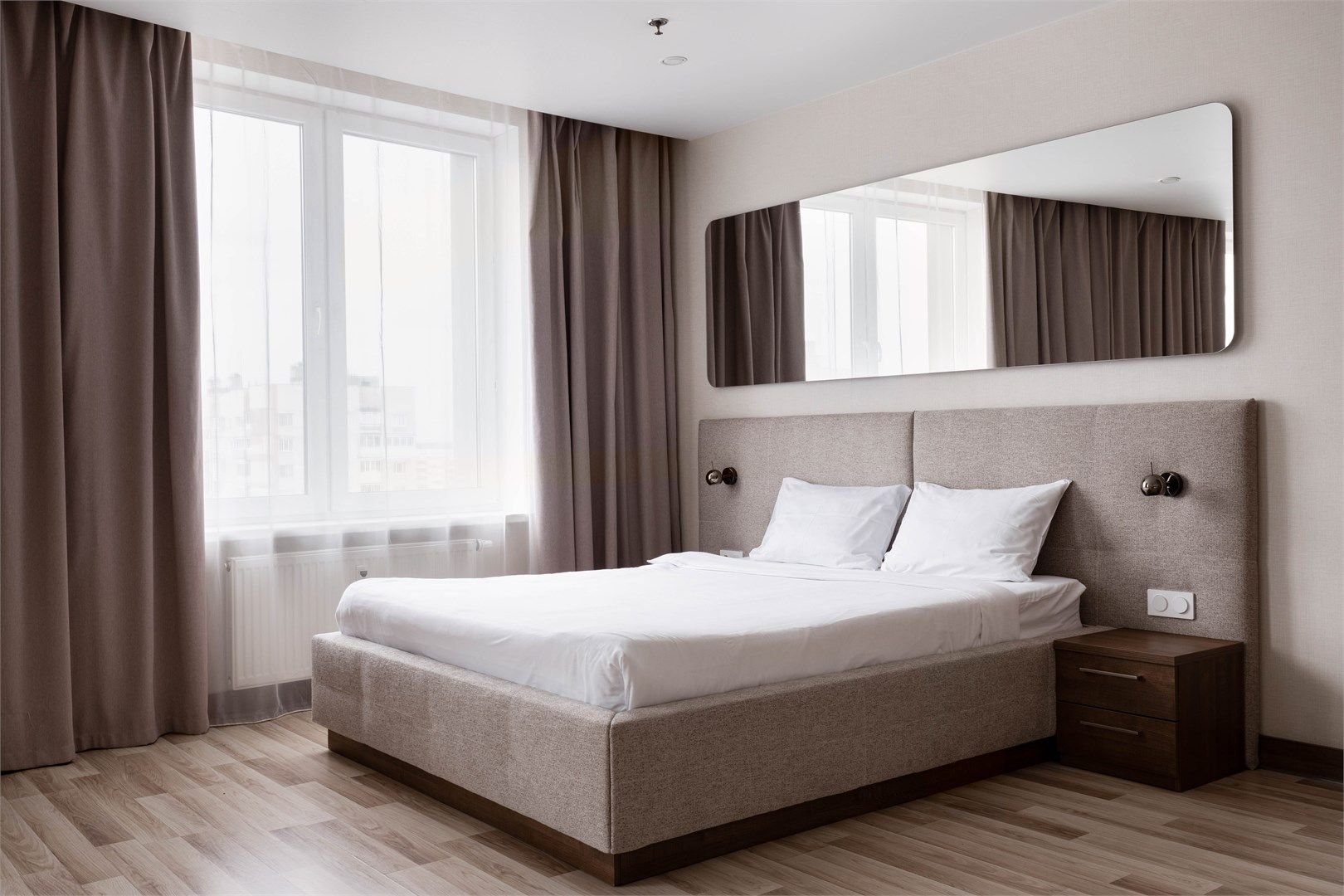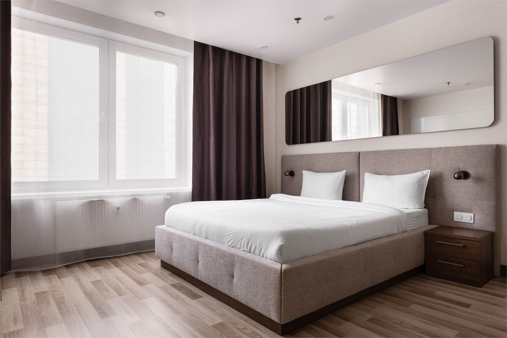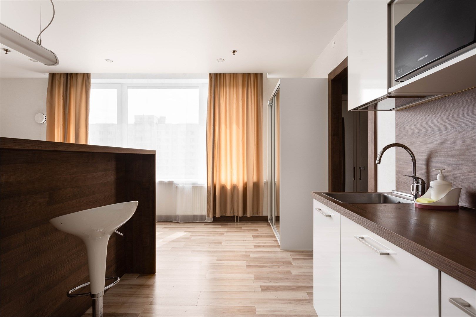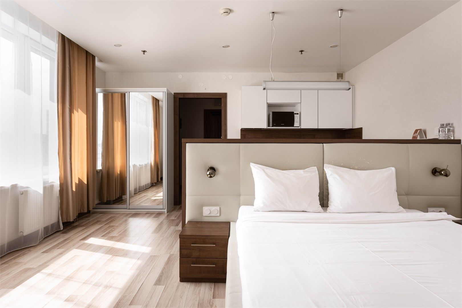 Светлые, уютные апартаменты с современной мебелью и техникой. В каждом апартаменте большая двуспальная кровать и кухонная зона, полностью оснащённая для комфортного проживания.