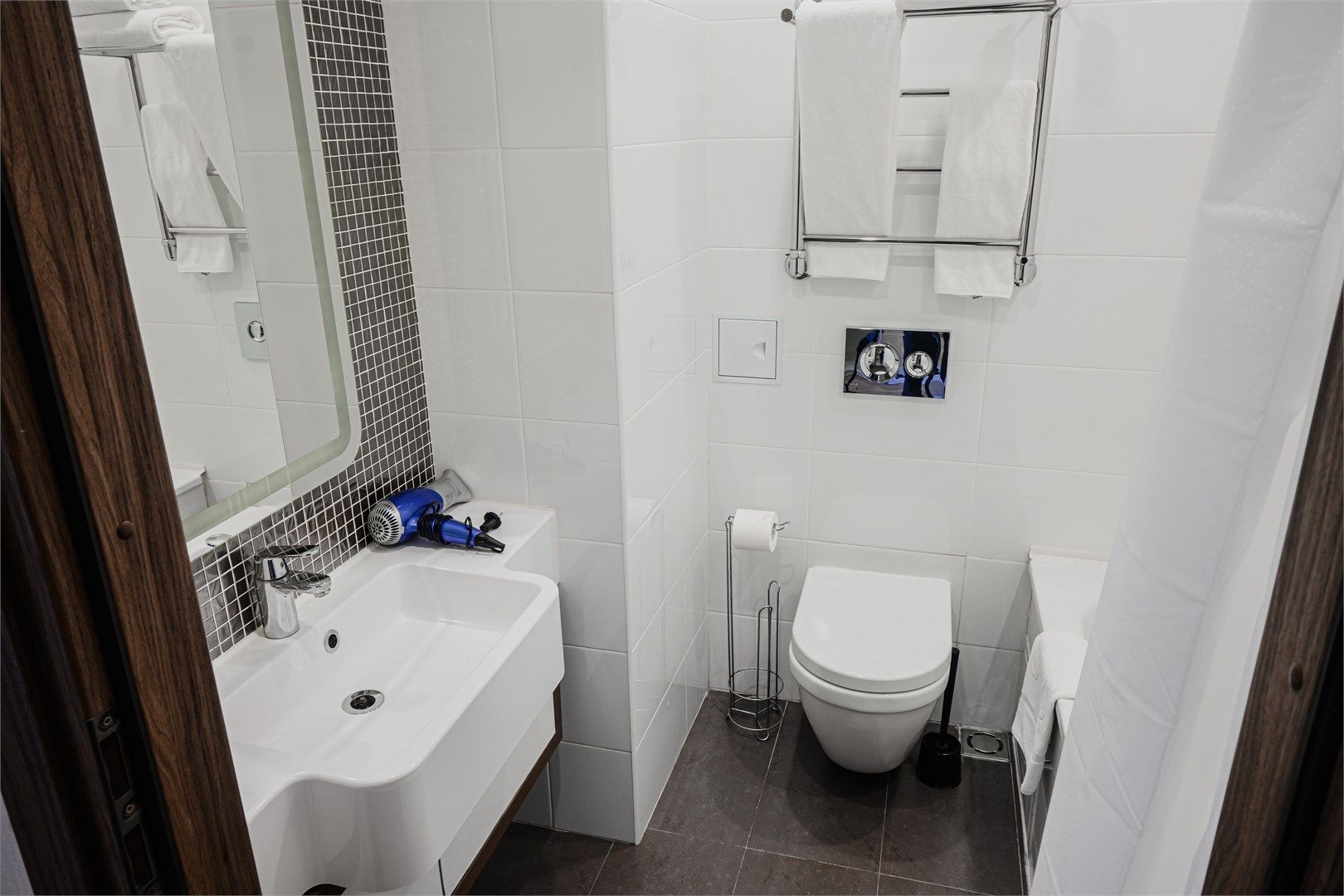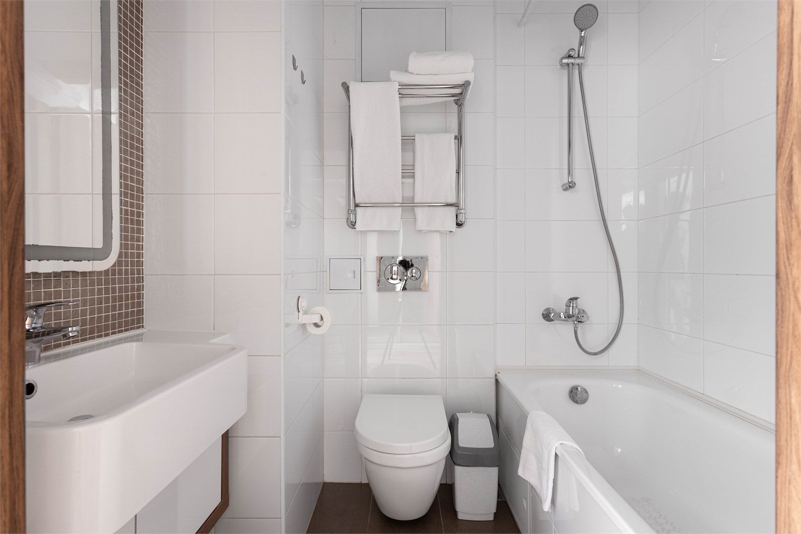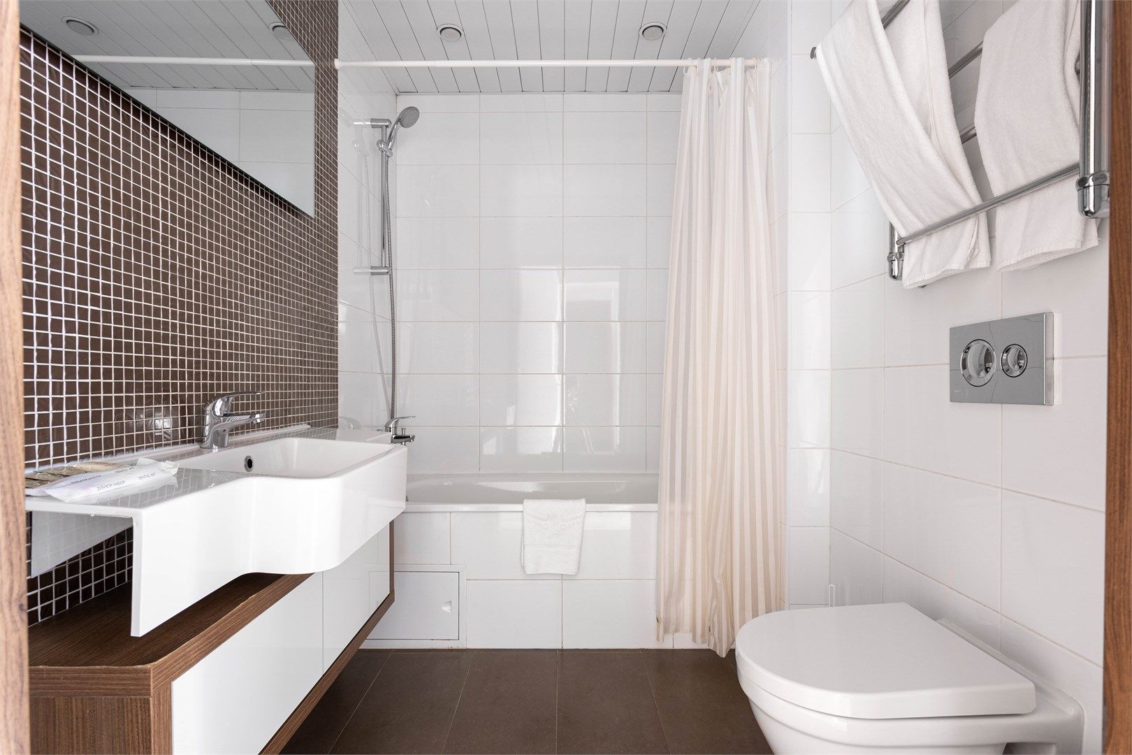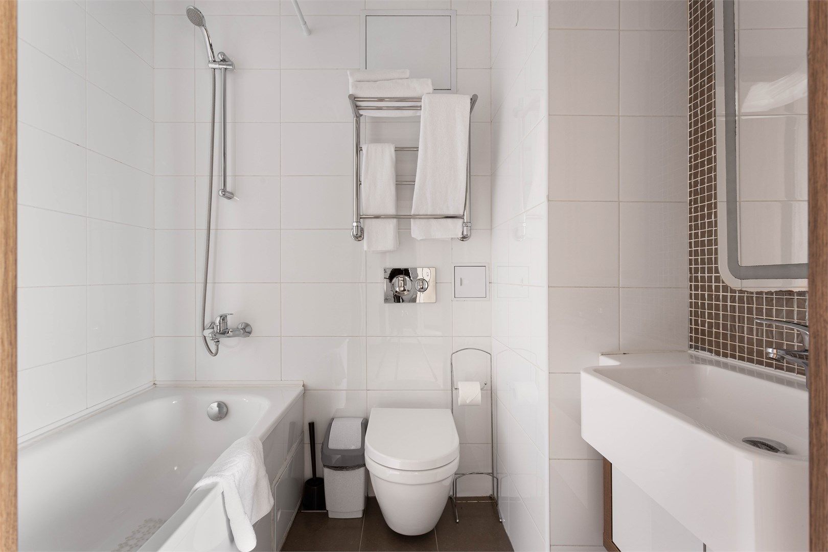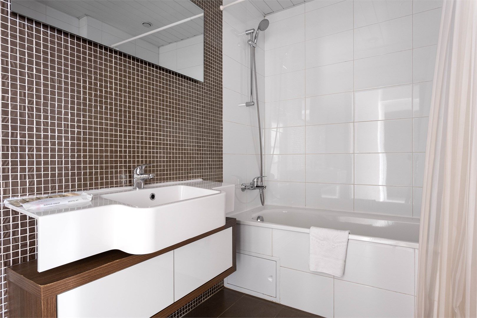 В каждом апартаменте свой санузел с ванной и косметическими принадлежностями.