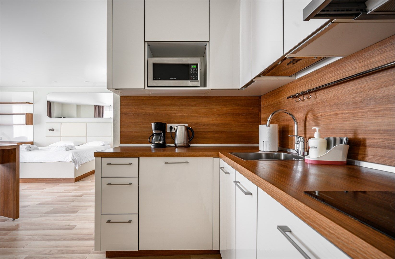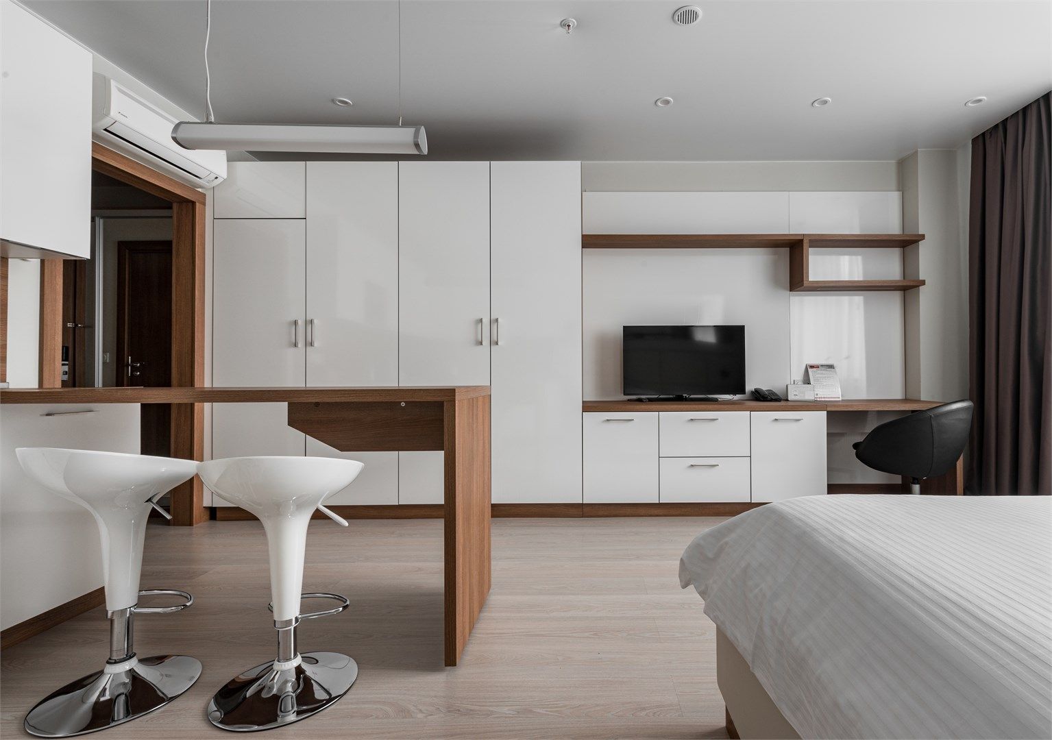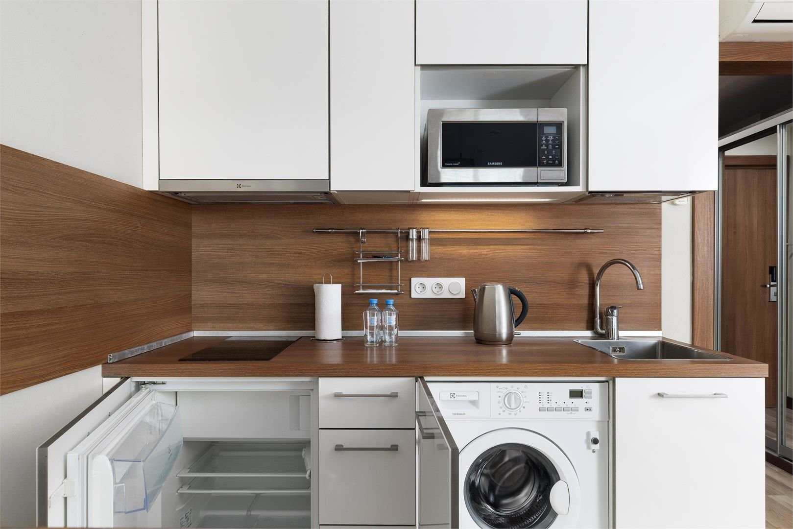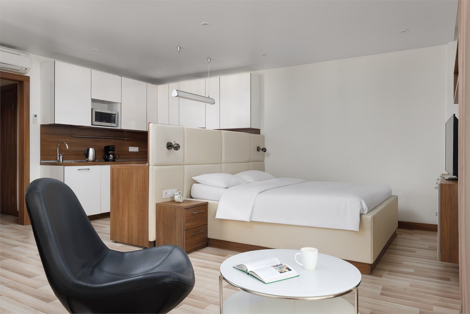 Апартаменты категории Standard идеально подойдут для проживания 1-2 человек. Интерьеры апартаментов выполнены в спокойных бежево-коричневых тонах. Кухня оснащена встроенной бытовой техникой от ведущих европейских производителей: микроволновая печь, холодильник, керамическая варочная панель, стиральная машина. В обеденной зоне располагается стол на несколько персон и комфортабельные смарт-стулья, ...