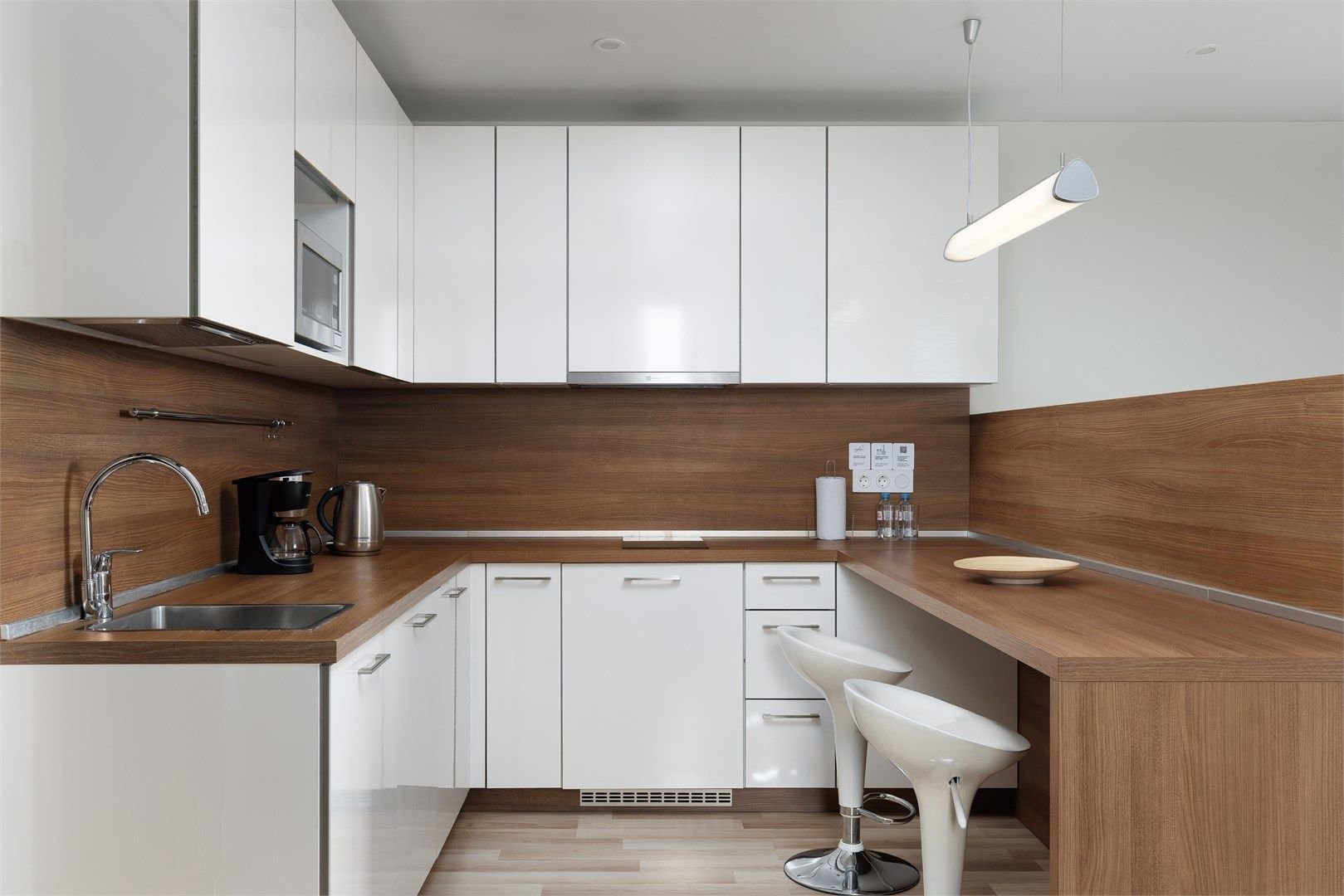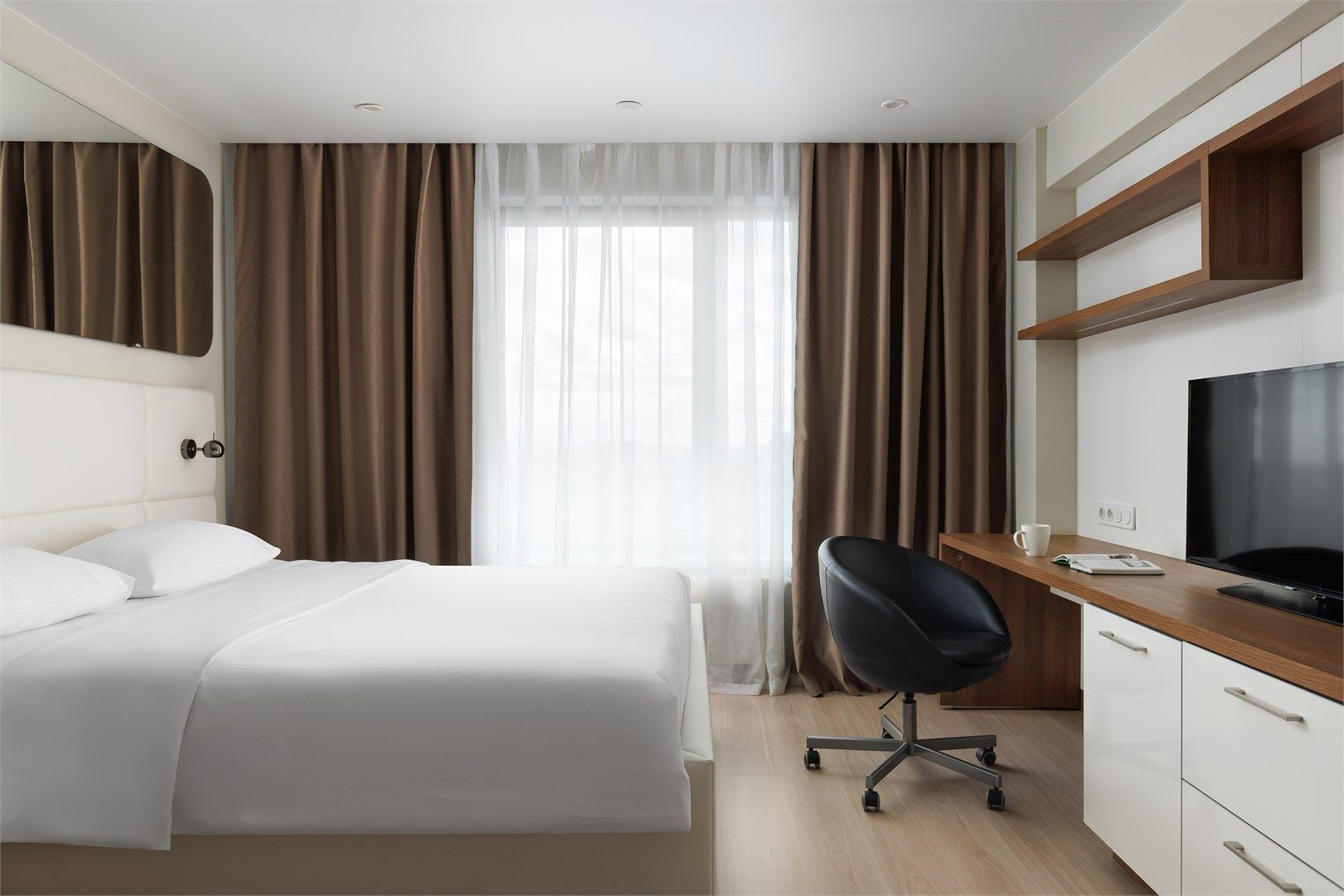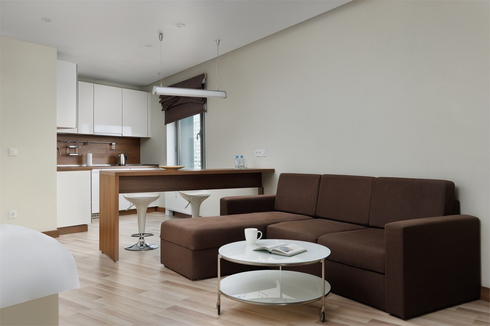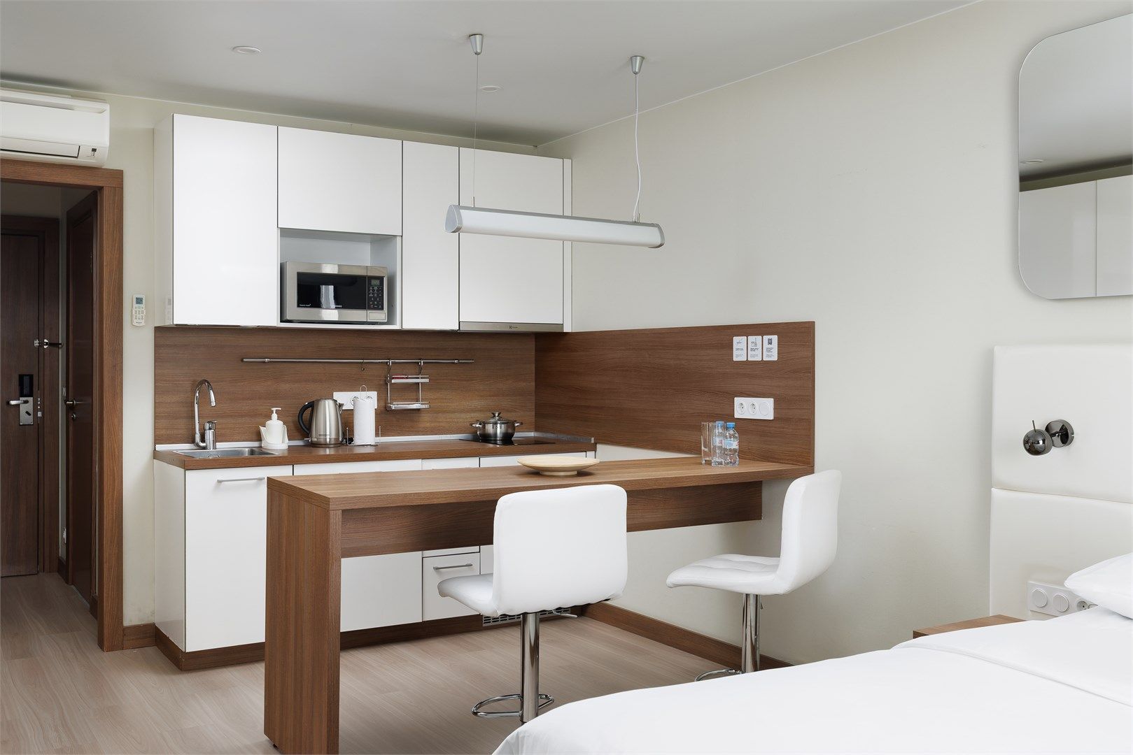 Апартаменты категории Standard идеально подойдут для проживания 1-2 человек. Интерьеры апартаментов выполнены в спокойных бежево-коричневых тонах. Кухня оснащена встроенной бытовой техникой от ведущих европейских производителей: микроволновая печь, холодильник, керамическая варочная панель, стиральная машина. В обеденной зоне располагается стол на несколько персон и комфортабельные смарт-стулья, ...